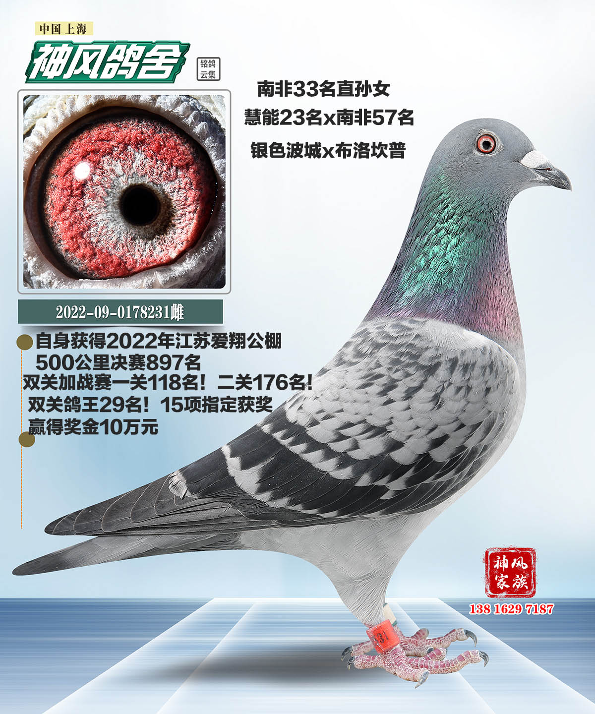 祖母:AU2017-T-33本舍胡本头号中鸽“鸽王缔造者”直女!本身和全平辈后代西安威力。宁夏黄河。安徽万佛。江苏爱翔。浙江先锋。上海君冠。等等众多公棚都有高位获奖!