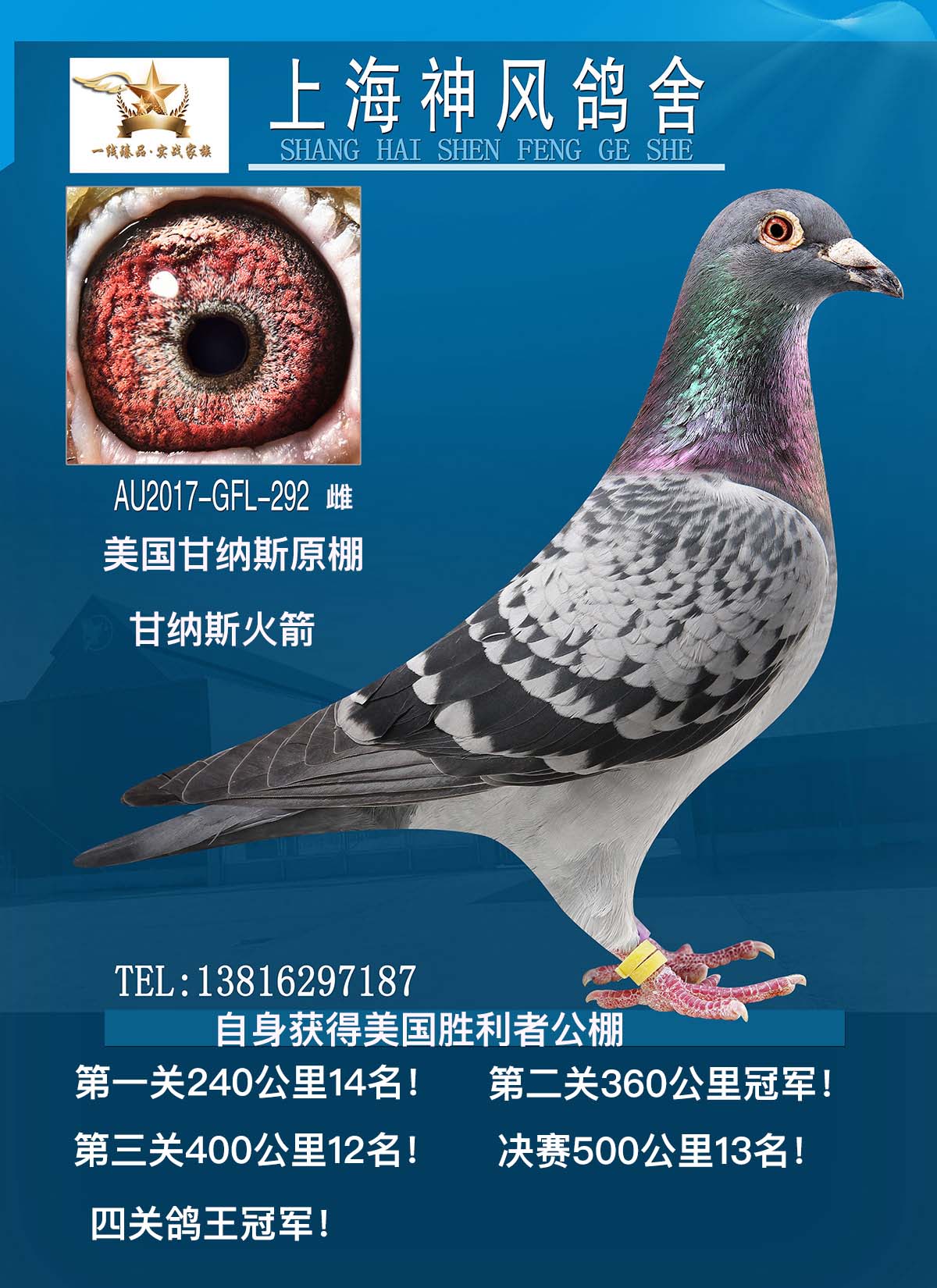 自身获得美国胜利者公棚第一关240公里14名!第二关360公里冠军!第三关400公里12名!第四关决赛500公里13名!四关鸽王冠军!