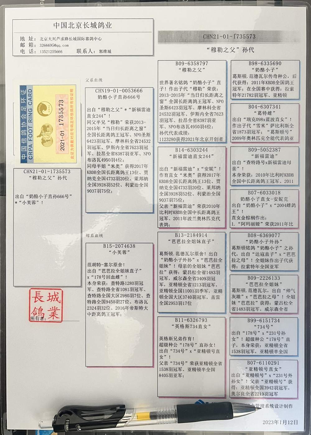 母:B15-2074638 “小芙蓉” 范胡特-塞尔原舍! 出自“芭芭拉全姐妹直子” x“178号回血雌”! 本身荣获:查特路1280羽冠军、查特路全省1081羽冠军、 查特路全国大区2980羽7位、查特路全国9450羽27位、布洛瓦2324羽32位、2016年帝斯特大中距离鸽王冠军;作出2025年龙鑫23名;