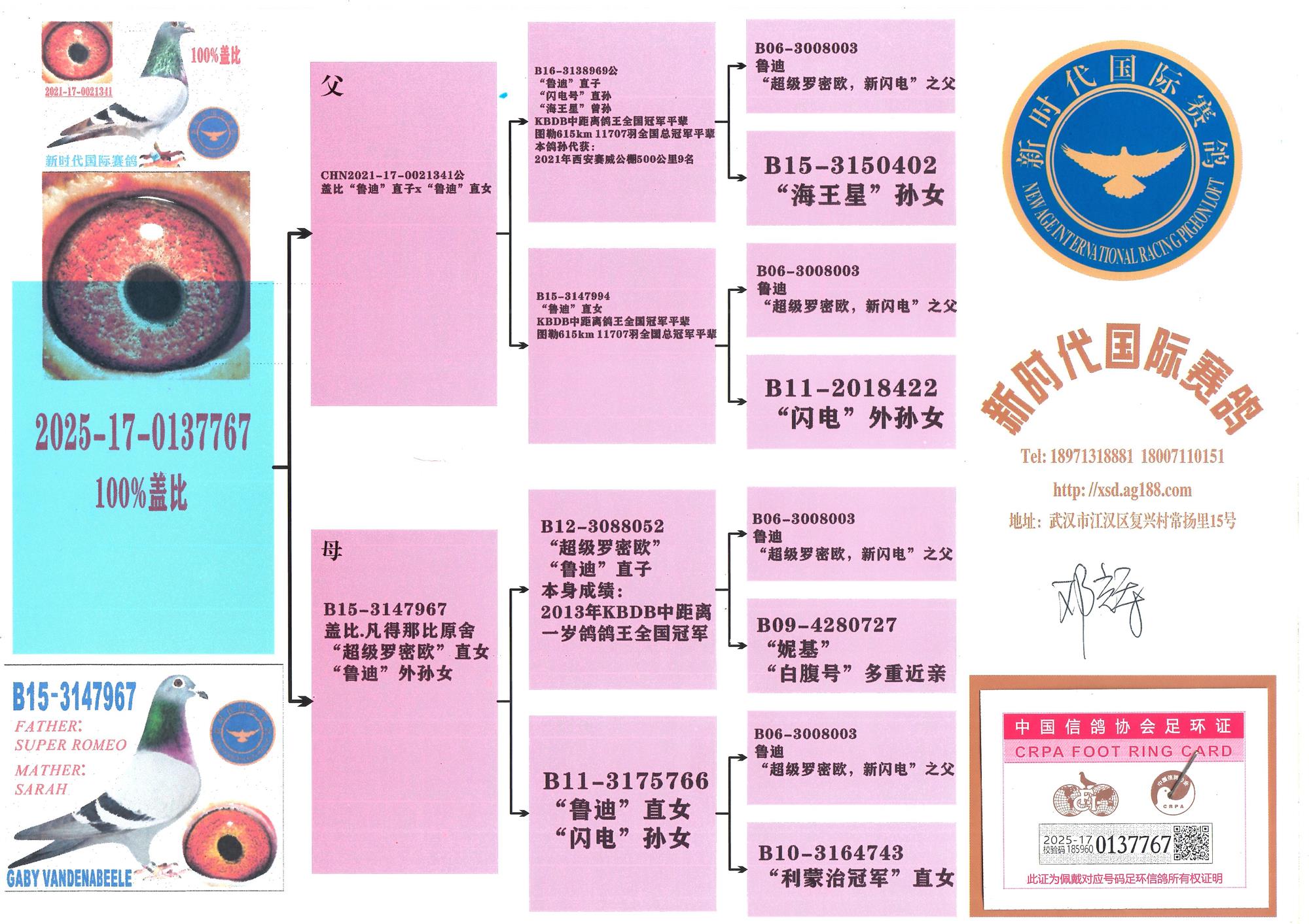 兄弟“新闪电”B13-3056024,入赏2014年图勒全国一岁组5735羽冠军,11707羽总冠军