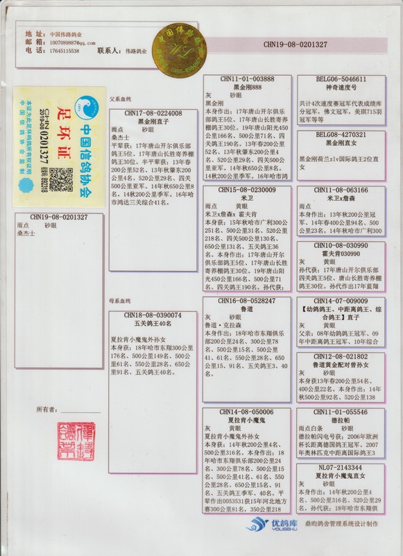 3、注明:请注意看种鸽和血统图片,有的种鸽环卡丢失,有些奖鸽无环卡和奖状和血统,介意请勿出价;