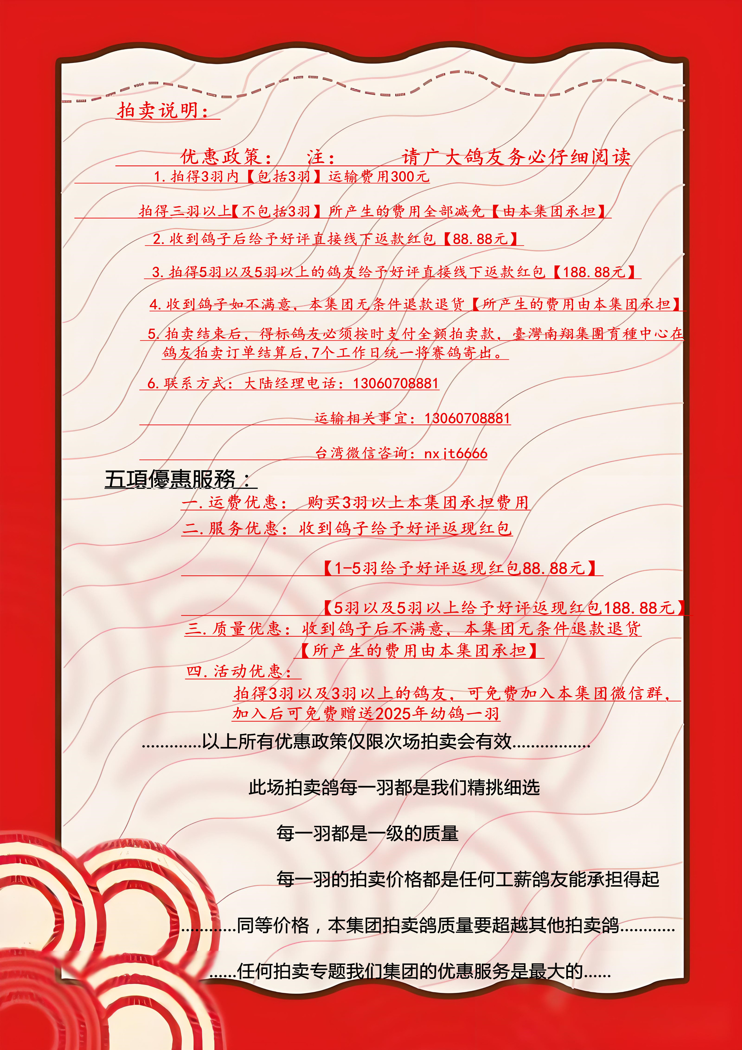 3.拍得5羽以及5羽以上的鸽友给予好评直接线下返款红包【188.88元】