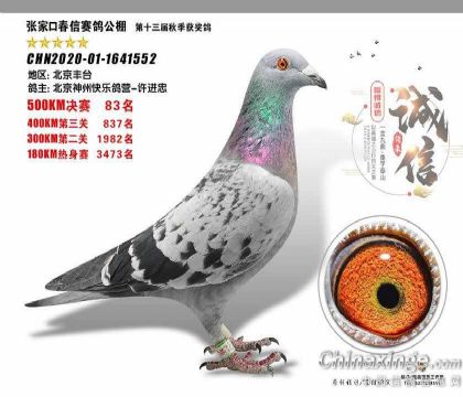2020-01-1641552雌 黄 雨 血统:胡本张家口春信赛鸽公棚500KM决赛 83名400KM第三关837名300KM第二关:1982名180KM热身赛 3473名北京云中鸽舍-许进忠