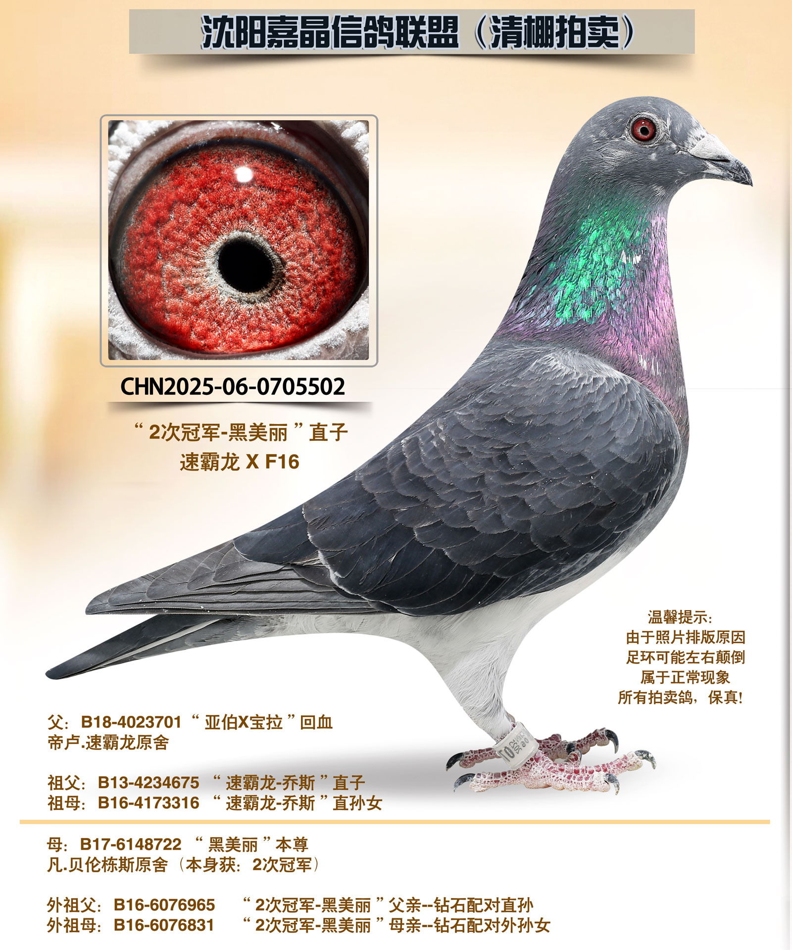 本联盟无奈,清舍拍卖,鸽舍因距离沈飞机场跑道太近,鸽群经常飞入机场试飞跑道内,飞机试飞存在安全隐患,机场工作人员多次找到本人,要求搬离拆除鸽舍,切全面停止赛鸽飞行,起初也没当回事,就在去年12月初,派出所民警找到本人,强制确切要求,必须拆除或搬离鸽舍。所给时间且非常紧迫,无奈之下将多年来饲养的种赛鸽(包括奖鸽祖辈、父母、奖鸽极其平辈)全部清棚一羽不留,本舍比赛20年,作出奖赛鸽百余羽,所留下的都是最顶尖,最实战的鸽系,希望我个人的鸽子能成为纽带,能为广大鸽友作出更优秀的赛绩,感谢鸽友多年来对嘉晶信鸽的信任与支持!!!