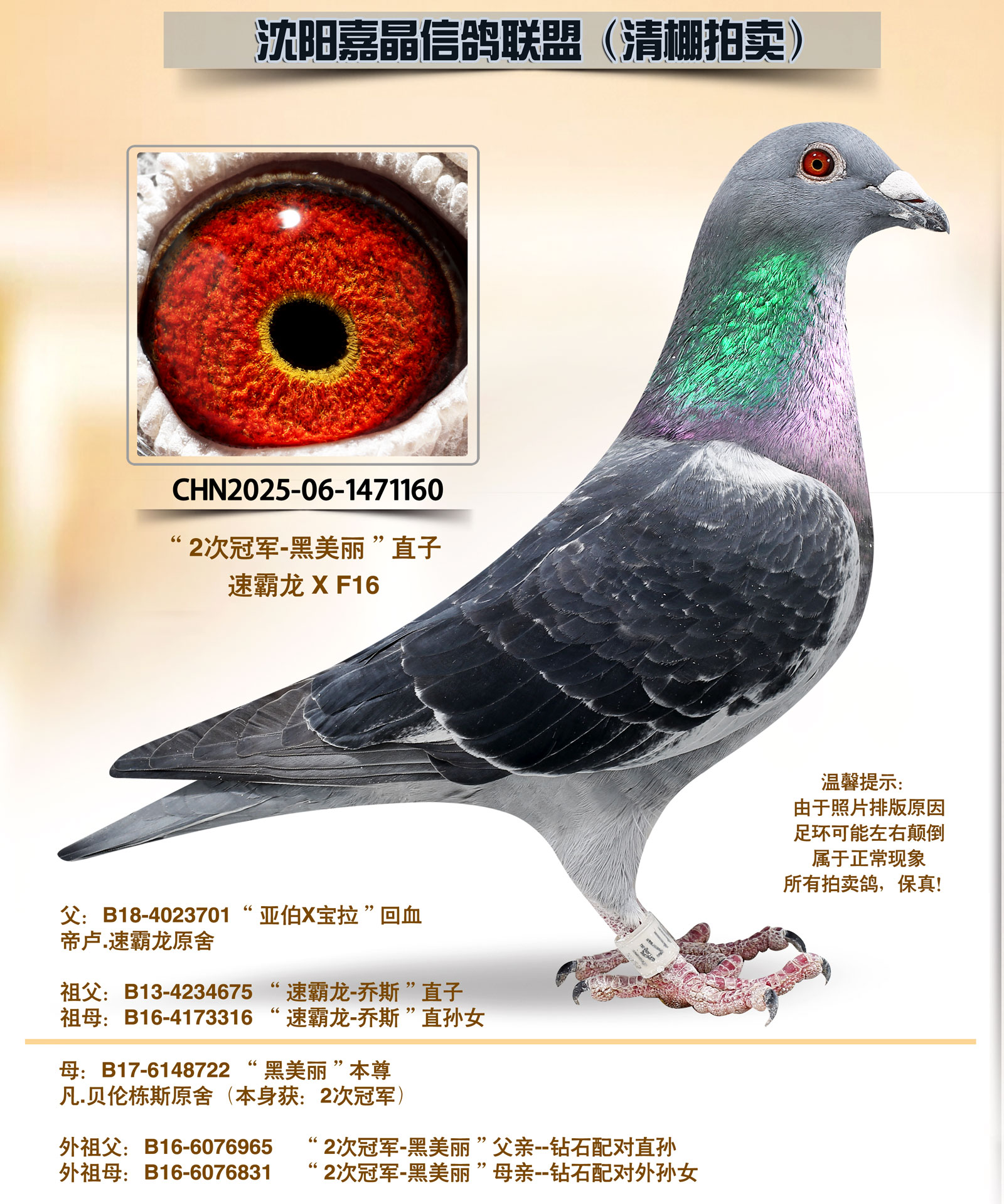 本联盟无奈,清舍拍卖,鸽舍因距离沈飞机场跑道太近,鸽群经常飞入机场试飞跑道内,飞机试飞存在安全隐患,机场工作人员多次找到本人,要求搬离拆除鸽舍,切全面停止赛鸽飞行,起初也没当回事,就在去年12月初,派出所民警找到本人,强制确切要求,必须拆除或搬离鸽舍。所给时间且非常紧迫,无奈之下将多年来饲养的种赛鸽(包括奖鸽祖辈、父母、奖鸽极其平辈)全部清棚一羽不留,本舍比赛20年,作出奖赛鸽百余羽,所留下的都是最顶尖,最实战的鸽系,希望我个人的鸽子能成为纽带,能为广大鸽友作出更优秀的赛绩,感谢鸽友多年来对嘉晶信鸽的信任与支持!!!