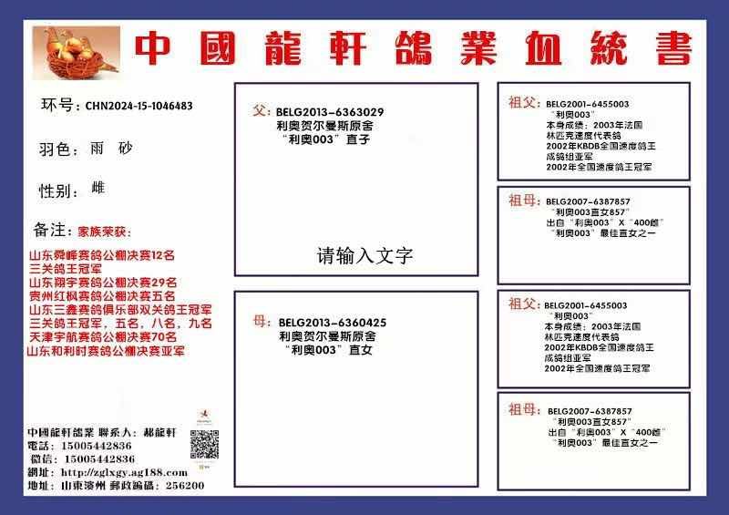 - 当前查看拍卖鸽:中长距离速度鸽系!利奥贺尔曼斯003高辈