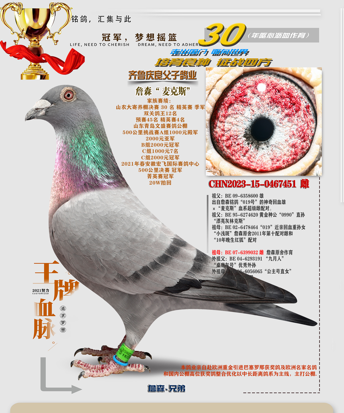 感谢齐鲁良父子鸽业刘总支援巴赛罗那血统配我家彼得曼德斯血统,在今年四关鸽王大赛斩获5名,此鸽也是去年800特比小号只取10名的情况下飞进10名,获奖金一万元!再次感谢刘总!!!