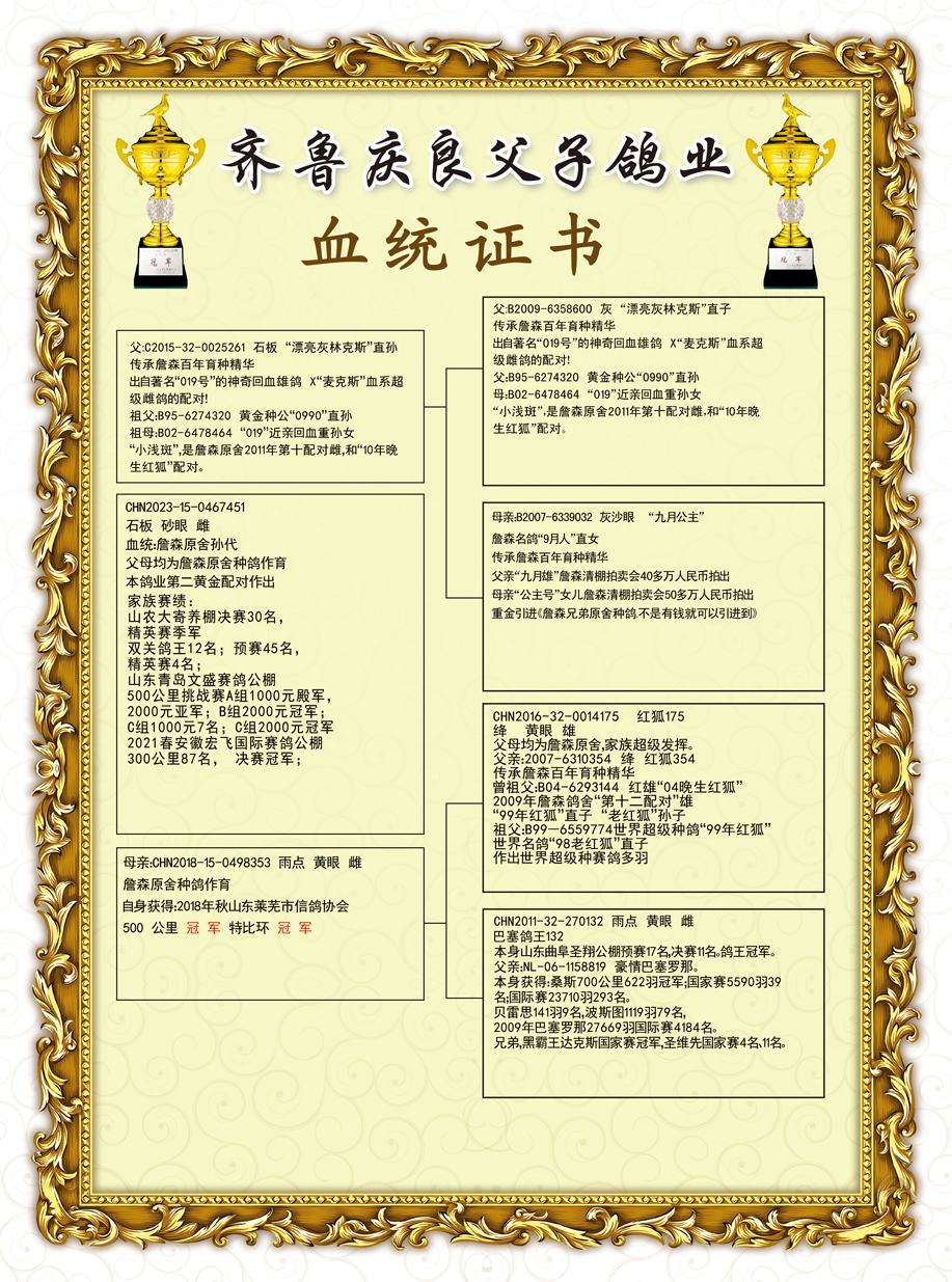 购得你家003血统鸽子今年在临河市1800特比环勇夺三关鸽王二十五名暗指二千五千共获奖金二十多万。地方大奖赛鸽王亚军四名十七名等谢谢刘总输出的好种鸽,鸽好人更好,祝刘总冠军多多,金钱多多。