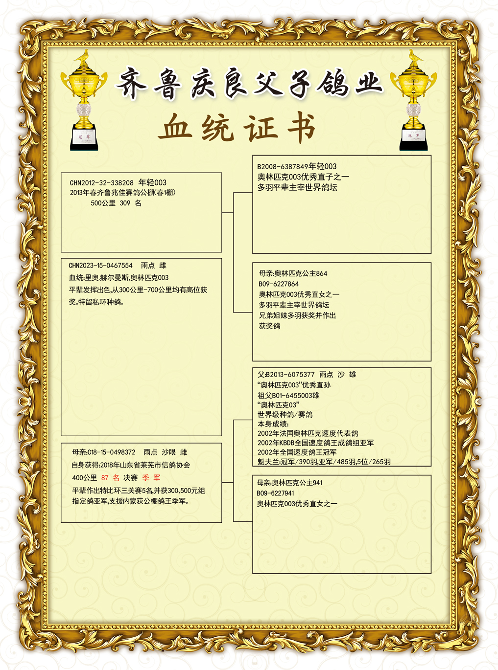 购得你家003血统鸽子今年在临河市1800特比环勇夺三关鸽王二十五名暗指二千五千共获奖金二十多万。地方大奖赛鸽王亚军四名十七名等谢谢刘总输出的好种鸽,鸽好人更好,祝刘总冠军多多,金钱多多。