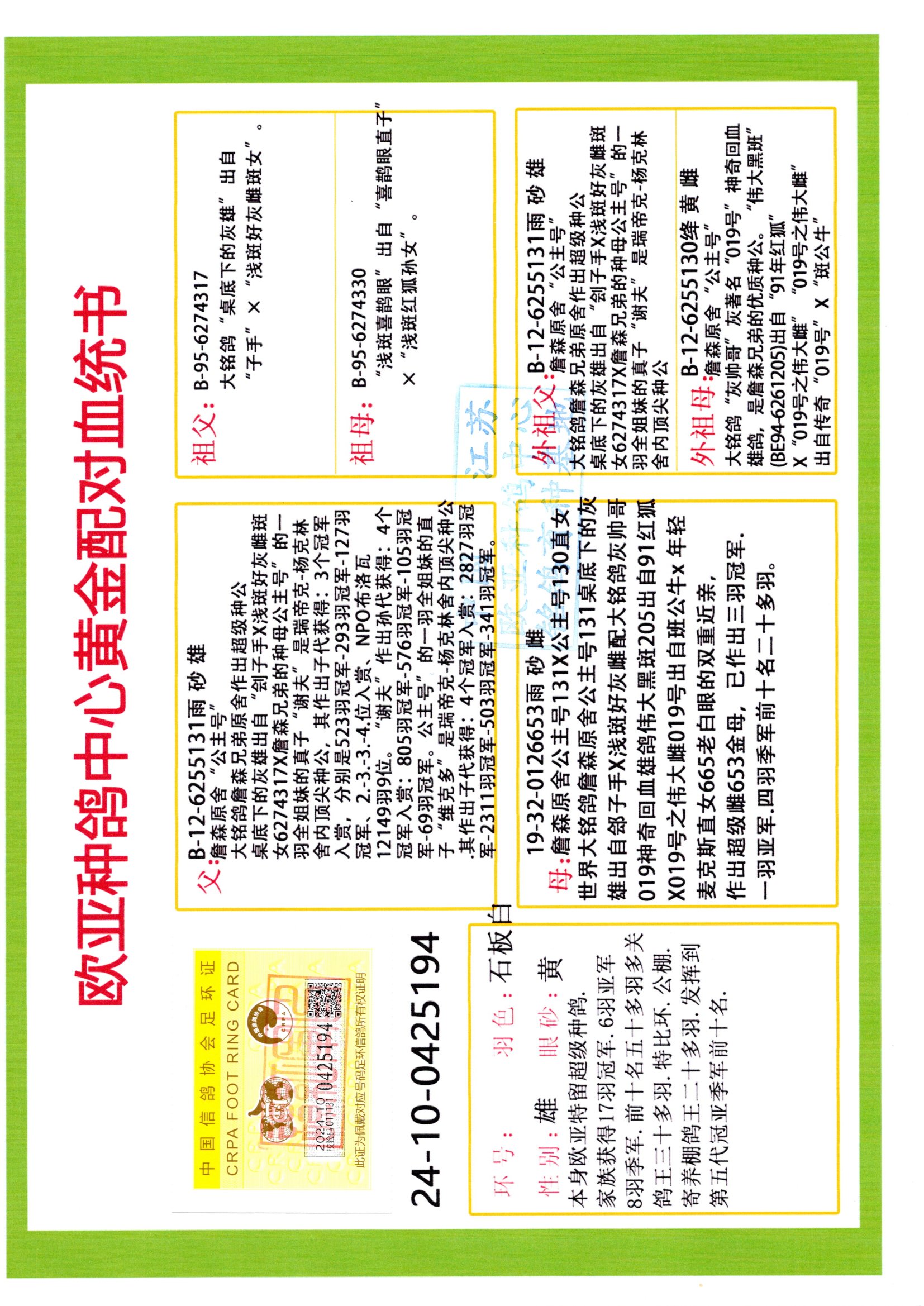 24年秋南京特比环欧亚荣获大团体冠军.小团体冠军551公里大特比13名.14名.16名.19名.20名.21名.24名.26名.27名.28名.42名.52名.54名.57名.65名.66名.68名.70名.71名.72名.74名.76名.80名.82名.83名.84名.85名.86名.90名.92名.110名.116名.121名.122名.128名.131名.158名.161名.164名.165名.166名.172名.174名.177名.182名.195名.196名.201名.205名.208名.210名.216名.253名.269名.275名.276名.294名.296名.299名,,24年秋云南天南铜都公棚决赛415名.天南铜都小棚决赛409名.云南玉活公棚决赛102名.490名.团体32名上笼二羽进二羽,天南铜都大棚506公里决赛445名。热烈祝贺河北省巨鹿县李兰生老师用欧亚泰山号血系连续十一年夺冠军,河北省国家赛冠军.全国季军等多次前十名高位,扬州王军王总用欧亚利奥24年春季获山东翔宇公棚决赛33名盖比53名。南京刘正龙刘总用欧亚盖比获得24年秋山东潍坊国际公棚决赛42名.精英赛30名.三关鸽王71名.决赛86名.加站赛16名.南京市特比环A组鸽王9名.B组鸽王5名.6名.C组鸽王5名.精英赛冠军4名.技能赛A组冠军4名.5名.秦淮区特比环荣获15名.46名.48名.87名。四川西昌徐亮徐总用欧亚利奥获得凉山州聚友决赛177名.第二关亚军双关鸽王19名.三关鸽王105名.云南豪庭公棚决赛603名。热烈祝贺24年四川重庆翔园鸽舍用欧亚泰山号荣获春季400公里冠军.秋季500公里冠军,河北王总用詹森X利奥获得千羽千翔公棚400公里冠军,广东蔡楷焕荣获24年秋爱好者 赛鸽俱乐部三关鸽王季军.一关420公里99名.二关450公里11名.三关520公里32名.单关季军.7名.12名,江西李卫兴荣获贵州红枫公棚8名.共翔俱乐部寄养棚四关综合鸽王30名.一关400公里78名.二关500公里55名.三关520公里37名.四关500公里57名.同父母获公棚18名.雷鸣获得武汉黄浦育翔中心冠军,四川陈文获得四川明鸿俱乐部300公里梦幻2名.3名.4名.9名.10名.13名.14名.15名.31名.34名.40名.41名.42名.43名.69名.71名.72名.73名.74名.94名.95名.97名.98名.99名.419公里决赛荣获总冠军7名.总共归巢9羽,四川徐亮获豪庭决赛603名,山西郑勇获得山西泰鑫公棚决赛255名詹森红狐,热烈祝贺马总获得开尔(飞跃队)决赛9名获奖金1310000万元.第一关52名,天津津福资赛180公里96名.获奖金429543万元,欧亚支持全国鸽友24年秋多人报喜 祝大家取得更好成绩,给欧亚报喜鸽友欧亚决定给每人赠送一羽超级种鸽。欧亚俱乐部特比环多关鸽王成绩:15年秋淮安特比环黑色星期一全会上笼9700多羽,当天无鸽归巢,第二天全会归巢357羽,本舍归巢158羽.前十名八羽.前一百名归巢57羽,16年春季获五关鸽王总冠军,总亚军四名.六名.七名.九名.十名.晶艺俱乐部520公里冠亚季军5名.6名.7名.9名.11名等,火车头冠军.季军6名.8名.9名.10名,16年秋晶艺俱乐部特比环520公里亚军.季军4名.6名.7名.9名,15年春南京白下特比环冠军.亚军.季军6名.7名.8名.9名.10名.指定鸽A B组获得冠军.亚军.季军4名.5名.,17年淮安特比环亚军.4名.5名.7名.8名.10名.六关鸽王总冠军.4名.6名.9名.10名,寄养棚宿迁刘总20羽特比环获冠军.季军.4名.7名.8名.9名等。18年荣获万羽特比环六关鸽王总冠军.总亚军.总季军.6名.8名.十名.单关四羽冠军.二羽亚军.四羽季军.前十名27羽。19年秋万羽特比环六关鸽王总亚军.总季军.5名.8名等,单关二羽冠军.三羽亚军.一羽季军前十名31羽。20年秋淮安市鸽会四关特比环大赛风雨无阻鸽王亚军.鸽王六名,金品俱乐部万羽特比环六关鸽王总冠军,总亚军.四名.五名.六名.七名.八名.十名.前二百名鸽王35羽,单关冠亚季军前十名四十多羽,火车头五关鸽王季军.六名.八名.前二百名鸽王十七羽。20年春荣获淮安五区一市四关鸽王总冠军.亚军.四名.八名.九名。21年秋荣获金品万羽特比环大赛六关鸽王总亚军.总季军.四名.七名.九名.十名.单关冠亚军季军前十名三十多羽。火车头协会鸽王六名.七名.十名.单关前十名十七羽。22年秋荣获鸽王总冠军.总亚军.5名.7名.8名.9名.11名.单关冠亚季军前十名三十多羽,第一关单关前二百名四十多羽,第二关前二百名三十多羽,第三关前二百名四十多羽,第四关前二百名四十多羽,第五关前一百名53羽。23年秋荣获鸽王季军.五名.八名.十名.13名.17名.20名.27名等多羽鸽王.单关前十名二十多羽。公棚.寄养棚部分成绩:16年秋宁夏黄河公棚总冠军电脑戈马力指定通炮冠军,17年送八羽参赛获得鸽王八名进奖四名,支持韩总荣获八名。支持鸽友荣获宁夏中卫公棚决赛总冠军.精英赛冠军,支持18年宁夏黄河公棚决赛冠军詹森X泰山。安徽鼎博寄养棚院内外四关鸽王总冠军.鸽王十七名.三十七名同窝,鸽王39名.42名.58名.67名。18年山东公棚预赛冠军.决赛65名.送八羽进奖五羽.指定获奔驰汽车一辆。支持鸽友获得云南蓝云公棚冠军.盖比X佛卡门。支持鸽友荣获云南银集公棚决赛冠军 詹森427X520血系 速度赛6700羽冠军。17年荣获金马俱乐部寄养棚四关鸽王总冠军.季军.六名.八名.第一关冠军.亚军.季军四名.七名.十一名.金牌教练奖。支持鸽友18年北京费翔公棚预赛九名电脑X桑杰士,支持鸽友荣获陕西威力公棚决赛11名.内蒙古临河寄养棚四关鸽王六名.詹森配泰山,支持河北王总用欧亚詹森427配胡本喜获20年秋开尔青年棚季军。云南东荣公棚16年预赛冠军.决赛77名.17年决赛12名.詹森红狐X泰山,17年平安公棚决赛4名 詹森427。欧亚获得21年金母寄养棚第一关四名.第二关5名.第三关5名.6名.7名.10名.三关鸽王总冠军,四关鸽王14名.十羽鸽王。支