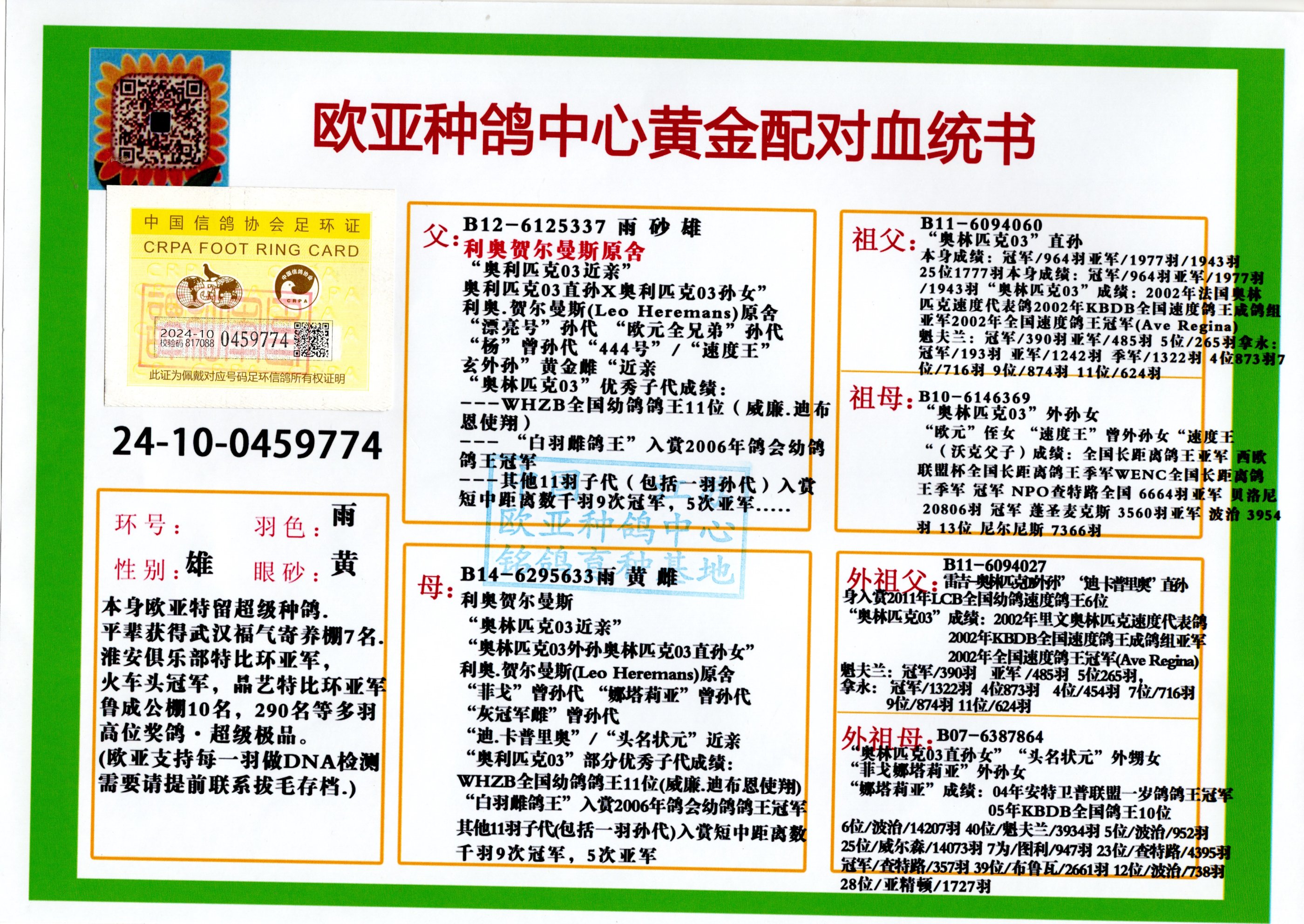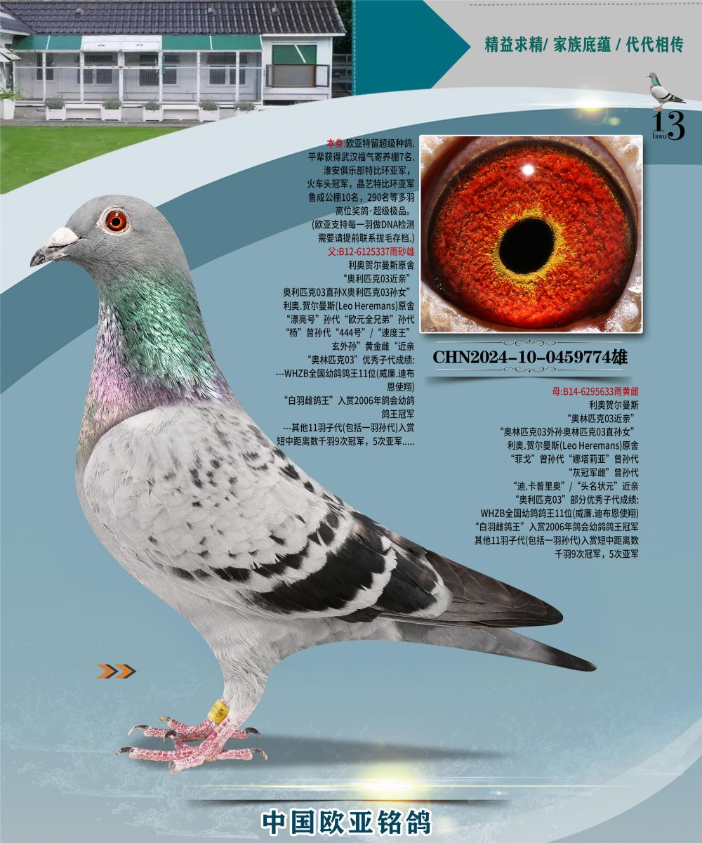 24年秋南京特比环欧亚荣获大团体冠军.小团体冠军551公里大特比13名.14名.16名.19名.20名.21名.24名.26名.27名.28名.42名.52名.54名.57名.65名.66名.68名.70名.71名.72名.74名.76名.80名.82名.83名.84名.85名.86名.90名.92名.110名.116名.121名.122名.128名.131名.158名.161名.164名.165名.166名.172名.174名.177名.182名.195名.196名.201名.205名.208名.210名.216名.253名.269名.275名.276名.294名.296名.299名,,24年秋云南天南铜都公棚决赛415名.天南铜都小棚决赛409名.云南玉活公棚决赛102名.490名.团体32名上笼二羽进二羽,天南铜都大棚506公里决赛445名。热烈祝贺河北省巨鹿县李兰生老师用欧亚泰山号血系连续十一年夺冠军,河北省国家赛冠军.全国季军等多次前十名高位,扬州王军王总用欧亚利奥24年春季获山东翔宇公棚决赛33名盖比53名。南京刘正龙刘总用欧亚盖比获得24年秋山东潍坊国际公棚决赛42名.精英赛30名.三关鸽王71名.决赛86名.加站赛16名.南京市特比环A组鸽王9名.B组鸽王5名.6名.C组鸽王5名.精英赛冠军4名.技能赛A组冠军4名.5名.秦淮区特比环荣获15名.46名.48名.87名。四川西昌徐亮徐总用欧亚利奥获得凉山州聚友决赛177名.第二关亚军双关鸽王19名.三关鸽王105名.云南豪庭公棚决赛603名。热烈祝贺24年四川重庆翔园鸽舍用欧亚泰山号荣获春季400公里冠军.秋季500公里冠军,河北王总用詹森X利奥获得千羽千翔公棚400公里冠军,广东蔡楷焕荣获24年秋爱好者 赛鸽俱乐部三关鸽王季军.一关420公里99名.二关450公里11名.三关520公里32名.单关季军.7名.12名,江西李卫兴荣获贵州红枫公棚8名.共翔俱乐部寄养棚四关综合鸽王30名.一关400公里78名.二关500公里55名.三关520公里37名.四关500公里57名.同父母获公棚18名.雷鸣获得武汉黄浦育翔中心冠军,四川陈文获得四川明鸿俱乐部300公里梦幻2名.3名.4名.9名.10名.13名.14名.15名.31名.34名.40名.41名.42名.43名.69名.71名.72名.73名.74名.94名.95名.97名.98名.99名.419公里决赛荣获总冠军7名.总共归巢9羽,四川徐亮获豪庭决赛603名,山西郑勇获得山西泰鑫公棚决赛255名詹森红狐,热烈祝贺马总获得开尔(飞跃队)决赛9名获奖金1310000万元.第一关52名,天津津福资赛180公里96名.获奖金429543万元,欧亚支持全国鸽友24年秋多人报喜 祝大家取得更好成绩,给欧亚报喜鸽友欧亚决定给每人赠送一羽超级种鸽。欧亚俱乐部特比环多关鸽王成绩:15年秋淮安特比环黑色星期一全会上笼9700多羽,当天无鸽归巢,第二天全会归巢357羽,本舍归巢158羽.前十名八羽.前一百名归巢57羽,16年春季获五关鸽王总冠军,总亚军四名.六名.七名.九名.十名.晶艺俱乐部520公里冠亚季军5名.6名.7名.9名.11名等,火车头冠军.季军6名.8名.9名.10名,16年秋晶艺俱乐部特比环520公里亚军.季军4名.6名.7名.9名,15年春南京白下特比环冠军.亚军.季军6名.7名.8名.9名.10名.指定鸽A B组获得冠军.亚军.季军4名.5名.,17年淮安特比环亚军.4名.5名.7名.8名.10名.六关鸽王总冠军.4名.6名.9名.10名,寄养棚宿迁刘总20羽特比环获冠军.季军.4名.7名.8名.9名等。18年荣获万羽特比环六关鸽王总冠军.总亚军.总季军.6名.8名.十名.单关四羽冠军.二羽亚军.四羽季军.前十名27羽。19年秋万羽特比环六关鸽王总亚军.总季军.5名.8名等,单关二羽冠军.三羽亚军.一羽季军前十名31羽。20年秋淮安市鸽会四关特比环大赛风雨无阻鸽王亚军.鸽王六名,金品俱乐部万羽特比环六关鸽王总冠军,总亚军.四名.五名.六名.七名.八名.十名.前二百名鸽王35羽,单关冠亚季军前十名四十多羽,火车头五关鸽王季军.六名.八名.前二百名鸽王十七羽。20年春荣获淮安五区一市四关鸽王总冠军.亚军.四名.八名.九名。21年秋荣获金品万羽特比环大赛六关鸽王总亚军.总季军.四名.七名.九名.十名.单关冠亚军季军前十名三十多羽。火车头协会鸽王六名.七名.十名.单关前十名十七羽。22年秋荣获鸽王总冠军.总亚军.5名.7名.8名.9名.11名.单关冠亚季军前十名三十多羽,第一关单关前二百名四十多羽,第二关前二百名三十多羽,第三关前二百名四十多羽,第四关前二百名四十多羽,第五关前一百名53羽。23年秋荣获鸽王季军.五名.八名.十名.13名.17名.20名.27名等多羽鸽王.单关前十名二十多羽。公棚.寄养棚部分成绩:16年秋宁夏黄河公棚总冠军电脑戈马力指定通炮冠军,17年送八羽参赛获得鸽王八名进奖四名,支持韩总荣获八名。支持鸽友荣获宁夏中卫公棚决赛总冠军.精英赛冠军,支持18年宁夏黄河公棚决赛冠军詹森X泰山。安徽鼎博寄养棚院内外四关鸽王总冠军.鸽王十七名.三十七名同窝,鸽王39名.42名.58名.67名。18年山东公棚预赛冠军.决赛65名.送八羽进奖五羽.指定获奔驰汽车一辆。支持鸽友获得云南蓝云公棚冠军.盖比X佛卡门。支持鸽友荣获云南银集公棚决赛冠军 詹森427X520血系 速度赛6700羽冠军。17年荣获金马俱乐部寄养棚四关鸽王总冠军.季军.六名.八名.第一关冠军.亚军.季军四名.七名.十一名.金牌教练奖。支持鸽友18年北京费翔公棚预赛九名电脑X桑杰士,支持鸽友荣获陕西威力公棚决赛11名.内蒙古临河寄养棚四关鸽王六名.詹森配泰山,支持河北王总用欧亚詹森427配胡本喜获20年秋开尔青年棚季军。云南东荣公棚16年预赛冠军.决赛77名.17年决赛12名.詹森红狐X泰山,17年平安公棚决赛4名 詹森427。欧亚获得21年金母寄养棚第一关四名.第二关5名.第三关5名.6名.7名.10名.三关鸽王总冠军,四关鸽王14名.十羽鸽王。支持河