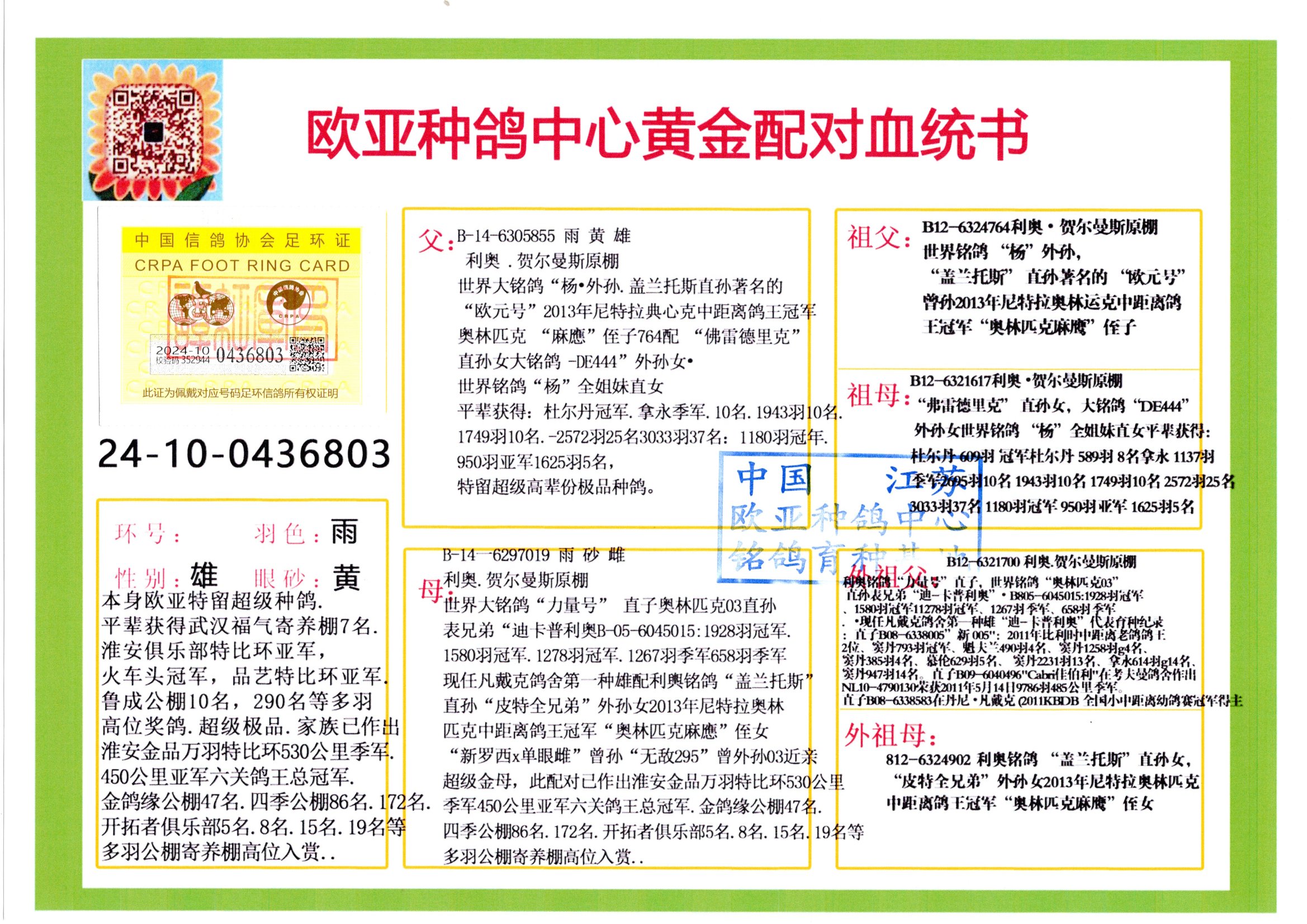 24年秋南京特比环欧亚荣获大团体冠军.小团体冠军551公里大特比13名.14名.16名.19名.20名.21名.24名.26名.27名.28名.42名.52名.54名.57名.65名.66名.68名.70名.71名.72名.74名.76名.80名.82名.83名.84名.85名.86名.90名.92名.110名.116名.121名.122名.128名.131名.158名.161名.164名.165名.166名.172名.174名.177名.182名.195名.196名.201名.205名.208名.210名.216名.253名.269名.275名.276名.294名.296名.299名,,24年秋云南天南铜都公棚决赛415名.天南铜都小棚决赛409名.云南玉活公棚决赛102名.490名.团体32名上笼二羽进二羽,天南铜都大棚506公里决赛445名。热烈祝贺河北省巨鹿县李兰生老师用欧亚泰山号血系连续十一年夺冠军,河北省国家赛冠军.全国季军等多次前十名高位,扬州王军王总用欧亚利奥24年春季获山东翔宇公棚决赛33名盖比53名。南京刘正龙刘总用欧亚盖比获得24年秋山东潍坊国际公棚决赛42名.精英赛30名.三关鸽王71名.决赛86名.加站赛16名.南京市特比环A组鸽王9名.B组鸽王5名.6名.C组鸽王5名.精英赛冠军4名.技能赛A组冠军4名.5名.秦淮区特比环荣获15名.46名.48名.87名。四川西昌徐亮徐总用欧亚利奥获得凉山州聚友决赛177名.第二关亚军双关鸽王19名.三关鸽王105名.云南豪庭公棚决赛603名。热烈祝贺24年四川重庆翔园鸽舍用欧亚泰山号荣获春季400公里冠军.秋季500公里冠军,河北王总用詹森X利奥获得千羽千翔公棚400公里冠军,广东蔡楷焕荣获24年秋爱好者 赛鸽俱乐部三关鸽王季军.一关420公里99名.二关450公里11名.三关520公里32名.单关季军.7名.12名,江西李卫兴荣获贵州红枫公棚8名.共翔俱乐部寄养棚四关综合鸽王30名.一关400公里78名.二关500公里55名.三关520公里37名.四关500公里57名.同父母获公棚18名.雷鸣获得武汉黄浦育翔中心冠军,四川陈文获得四川明鸿俱乐部300公里梦幻2名.3名.4名.9名.10名.13名.14名.15名.31名.34名.40名.41名.42名.43名.69名.71名.72名.73名.74名.94名.95名.97名.98名.99名.419公里决赛荣获总冠军7名.总共归巢9羽,四川徐亮获豪庭决赛603名,山西郑勇获得山西泰鑫公棚决赛255名詹森红狐,热烈祝贺马总获得开尔(飞跃队)决赛9名获奖金1310000万元.第一关52名,天津津福资赛180公里96名.获奖金429543万元,欧亚支持全国鸽友24年秋多人报喜 祝大家取得更好成绩,给欧亚报喜鸽友欧亚决定给每人赠送一羽超级种鸽。欧亚俱乐部特比环多关鸽王成绩:15年秋淮安特比环黑色星期一全会上笼9700多羽,当天无鸽归巢,第二天全会归巢357羽,本舍归巢158羽.前十名八羽.前一百名归巢57羽,16年春季获五关鸽王总冠军,总亚军四名.六名.七名.九名.十名.晶艺俱乐部520公里冠亚季军5名.6名.7名.9名.11名等,火车头冠军.季军6名.8名.9名.10名,16年秋晶艺俱乐部特比环520公里亚军.季军4名.6名.7名.9名,15年春南京白下特比环冠军.亚军.季军6名.7名.8名.9名.10名.指定鸽A B组获得冠军.亚军.季军4名.5名.,17年淮安特比环亚军.4名.5名.7名.8名.10名.六关鸽王总冠军.4名.6名.9名.10名,寄养棚宿迁刘总20羽特比环获冠军.季军.4名.7名.8名.9名等。18年荣获万羽特比环六关鸽王总冠军.总亚军.总季军.6名.8名.十名.单关四羽冠军.二羽亚军.四羽季军.前十名27羽。19年秋万羽特比环六关鸽王总亚军.总季军.5名.8名等,单关二羽冠军.三羽亚军.一羽季军前十名31羽。20年秋淮安市鸽会四关特比环大赛风雨无阻鸽王亚军.鸽王六名,金品俱乐部万羽特比环六关鸽王总冠军,总亚军.四名.五名.六名.七名.八名.十名.前二百名鸽王35羽,单关冠亚季军前十名四十多羽,火车头五关鸽王季军.六名.八名.前二百名鸽王十七羽。20年春荣获淮安五区一市四关鸽王总冠军.亚军.四名.八名.九名。21年秋荣获金品万羽特比环大赛六关鸽王总亚军.总季军.四名.七名.九名.十名.单关冠亚军季军前十名三十多羽。火车头协会鸽王六名.七名.十名.单关前十名十七羽。22年秋荣获鸽王总冠军.总亚军.5名.7名.8名.9名.11名.单关冠亚季军前十名三十多羽,第一关单关前二百名四十多羽,第二关前二百名三十多羽,第三关前二百名四十多羽,第四关前二百名四十多羽,第五关前一百名53羽。23年秋荣获鸽王季军.五名.八名.十名.13名.17名.20名.27名等多羽鸽王.单关前十名二十多羽。公棚.寄养棚部分成绩:16年秋宁夏黄河公棚总冠军电脑戈马力指定通炮冠军,17年送八羽参赛获得鸽王八名进奖四名,支持韩总荣获八名。支持鸽友荣获宁夏中卫公棚决赛总冠军.精英赛冠军,支持18年宁夏黄河公棚决赛冠军詹森X泰山。安徽鼎博寄养棚院内外四关鸽王总冠军.鸽王十七名.三十七名同窝,鸽王39名.42名.58名.67名。18年山东公棚预赛冠军.决赛65名.送八羽进奖五羽.指定获奔驰汽车一辆。支持鸽友获得云南蓝云公棚冠军.盖比X佛卡门。支持鸽友荣获云南银集公棚决赛冠军 詹森427X520血系 速度赛6700羽冠军。17年荣获金马俱乐部寄养棚四关鸽王总冠军.季军.六名.八名.第一关冠军.亚军.季军四名.七名.十一名.金牌教练奖。支持鸽友18年北京费翔公棚预赛九名电脑X桑杰士,支持鸽友荣获陕西威力公棚决赛11名.内蒙古临河寄养棚四关鸽王六名.詹森配泰山,支持河北王总用欧亚詹森427配胡本喜获20年秋开尔青年棚季军。云南东荣公棚16年预赛冠军.决赛77名.17年决赛12名.詹森红狐X泰山,17年平安公棚决赛4名 詹森427。欧亚获得21年金母寄养棚第一关四名.第二关5名.第三关5名.6名.7名.10名.三关鸽王总冠军,四关鸽王14名.十羽鸽王。支持河