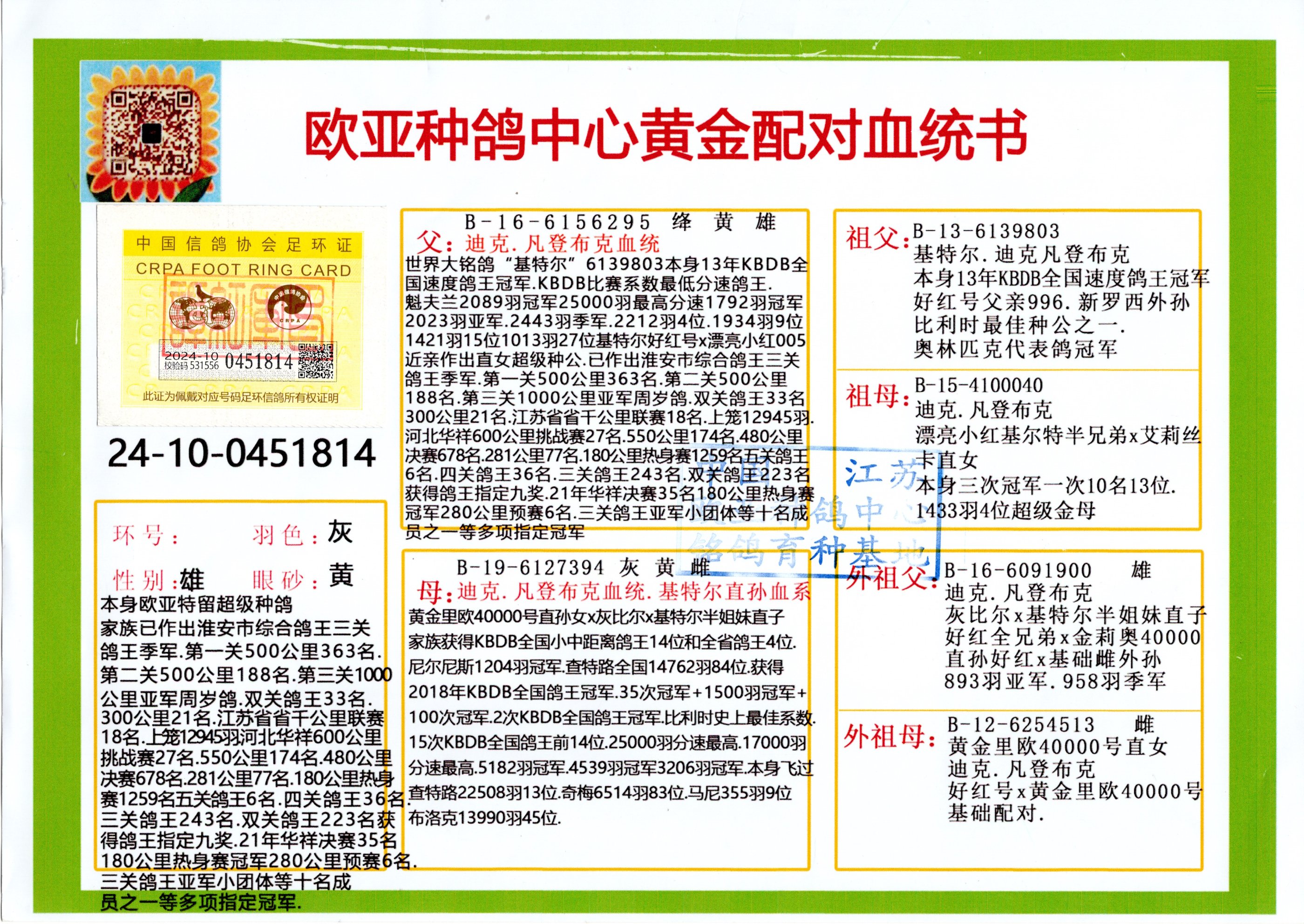 24年秋南京特比环欧亚荣获大团体冠军.小团体冠军551公里大特比13名.14名.16名.19名.20名.21名.24名.26名.27名.28名.42名.52名.54名.57名.65名.66名.68名.70名.71名.72名.74名.76名.80名.82名.83名.84名.85名.86名.90名.92名.110名.116名.121名.122名.128名.131名.158名.161名.164名.165名.166名.172名.174名.177名.182名.195名.196名.201名.205名.208名.210名.216名.253名.269名.275名.276名.294名.296名.299名,,24年秋云南天南铜都公棚决赛415名.天南铜都小棚决赛409名.云南玉活公棚决赛102名.490名.团体32名上笼二羽进二羽,天南铜都大棚506公里决赛445名。热烈祝贺河北省巨鹿县李兰生老师用欧亚泰山号血系连续十一年夺冠军,河北省国家赛冠军.全国季军等多次前十名高位,扬州王军王总用欧亚利奥24年春季获山东翔宇公棚决赛33名盖比53名。南京刘正龙刘总用欧亚盖比获得24年秋山东潍坊国际公棚决赛42名.精英赛30名.三关鸽王71名.决赛86名.加站赛16名.南京市特比环A组鸽王9名.B组鸽王5名.6名.C组鸽王5名.精英赛冠军4名.技能赛A组冠军4名.5名.秦淮区特比环荣获15名.46名.48名.87名。四川西昌徐亮徐总用欧亚利奥获得凉山州聚友决赛177名.第二关亚军双关鸽王19名.三关鸽王105名.云南豪庭公棚决赛603名。热烈祝贺24年四川重庆翔园鸽舍用欧亚泰山号荣获春季400公里冠军.秋季500公里冠军,河北王总用詹森X利奥获得千羽千翔公棚400公里冠军,广东蔡楷焕荣获24年秋爱好者 赛鸽俱乐部三关鸽王季军.一关420公里99名.二关450公里11名.三关520公里32名.单关季军.7名.12名,江西李卫兴荣获贵州红枫公棚8名.共翔俱乐部寄养棚四关综合鸽王30名.一关400公里78名.二关500公里55名.三关520公里37名.四关500公里57名.同父母获公棚18名.雷鸣获得武汉黄浦育翔中心冠军,四川陈文获得四川明鸿俱乐部300公里梦幻2名.3名.4名.9名.10名.13名.14名.15名.31名.34名.40名.41名.42名.43名.69名.71名.72名.73名.74名.94名.95名.97名.98名.99名.419公里决赛荣获总冠军7名.总共归巢9羽,四川徐亮获豪庭决赛603名,山西郑勇获得山西泰鑫公棚决赛255名詹森红狐,热烈祝贺马总获得开尔(飞跃队)决赛9名获奖金1310000万元.第一关52名,天津津福资赛180公里96名.获奖金429543万元,欧亚支持全国鸽友24年秋多人报喜 祝大家取得更好成绩,给欧亚报喜鸽友欧亚决定给每人赠送一羽超级种鸽。欧亚俱乐部特比环多关鸽王成绩:15年秋淮安特比环黑色星期一全会上笼9700多羽,当天无鸽归巢,第二天全会归巢357羽,本舍归巢158羽.前十名八羽.前一百名归巢57羽,16年春季获五关鸽王总冠军,总亚军四名.六名.七名.九名.十名.晶艺俱乐部520公里冠亚季军5名.6名.7名.9名.11名等,火车头冠军.季军6名.8名.9名.10名,16年秋晶艺俱乐部特比环520公里亚军.季军4名.6名.7名.9名,15年春南京白下特比环冠军.亚军.季军6名.7名.8名.9名.10名.指定鸽A B组获得冠军.亚军.季军4名.5名.,17年淮安特比环亚军.4名.5名.7名.8名.10名.六关鸽王总冠军.4名.6名.9名.10名,寄养棚宿迁刘总20羽特比环获冠军.季军.4名.7名.8名.9名等。18年荣获万羽特比环六关鸽王总冠军.总亚军.总季军.6名.8名.十名.单关四羽冠军.二羽亚军.四羽季军.前十名27羽。19年秋万羽特比环六关鸽王总亚军.总季军.5名.8名等,单关二羽冠军.三羽亚军.一羽季军前十名31羽。20年秋淮安市鸽会四关特比环大赛风雨无阻鸽王亚军.鸽王六名,金品俱乐部万羽特比环六关鸽王总冠军,总亚军.四名.五名.六名.七名.八名.十名.前二百名鸽王35羽,单关冠亚季军前十名四十多羽,火车头五关鸽王季军.六名.八名.前二百名鸽王十七羽。20年春荣获淮安五区一市四关鸽王总冠军.亚军.四名.八名.九名。21年秋荣获金品万羽特比环大赛六关鸽王总亚军.总季军.四名.七名.九名.十名.单关冠亚军季军前十名三十多羽。火车头协会鸽王六名.七名.十名.单关前十名十七羽。22年秋荣获鸽王总冠军.总亚军.5名.7名.8名.9名.11名.单关冠亚季军前十名三十多羽,第一关单关前二百名四十多羽,第二关前二百名三十多羽,第三关前二百名四十多羽,第四关前二百名四十多羽,第五关前一百名53羽。23年秋荣获鸽王季军.五名.八名.十名.13名.17名.20名.27名等多羽鸽王.单关前十名二十多羽。公棚.寄养棚部分成绩:16年秋宁夏黄河公棚总冠军电脑戈马力指定通炮冠军,17年送八羽参赛获得鸽王八名进奖四名,支持韩总荣获八名。支持鸽友荣获宁夏中卫公棚决赛总冠军.精英赛冠军,支持18年宁夏黄河公棚决赛冠军詹森X泰山。安徽鼎博寄养棚院内外四关鸽王总冠军.鸽王十七名.三十七名同窝,鸽王39名.42名.58名.67名。18年山东公棚预赛冠军.决赛65名.送八羽进奖五羽.指定获奔驰汽车一辆。支持鸽友获得云南蓝云公棚冠军.盖比X佛卡门。支持鸽友荣获云南银集公棚决赛冠军 詹森427X520血系 速度赛6700羽冠军。17年荣获金马俱乐部寄养棚四关鸽王总冠军.季军.六名.八名.第一关冠军.亚军.季军四名.七名.十一名.金牌教练奖。支持鸽友18年北京费翔公棚预赛九名电脑X桑杰士,支持鸽友荣获陕西威力公棚决赛11名.内蒙古临河寄养棚四关鸽王六名.詹森配泰山,支持河北王总用欧亚詹森427配胡本喜获20年秋开尔青年棚季军。云南东荣公棚16年预赛冠军.决赛77名.17年决赛12名.詹森红狐X泰山,17年平安公棚决赛4名 詹森427。欧亚获得21年金母寄养棚第一关四名.第二关5名.第三关5名.6名.7名.10名.三关鸽王总冠军,四关鸽王14名.十羽鸽王。支持河
