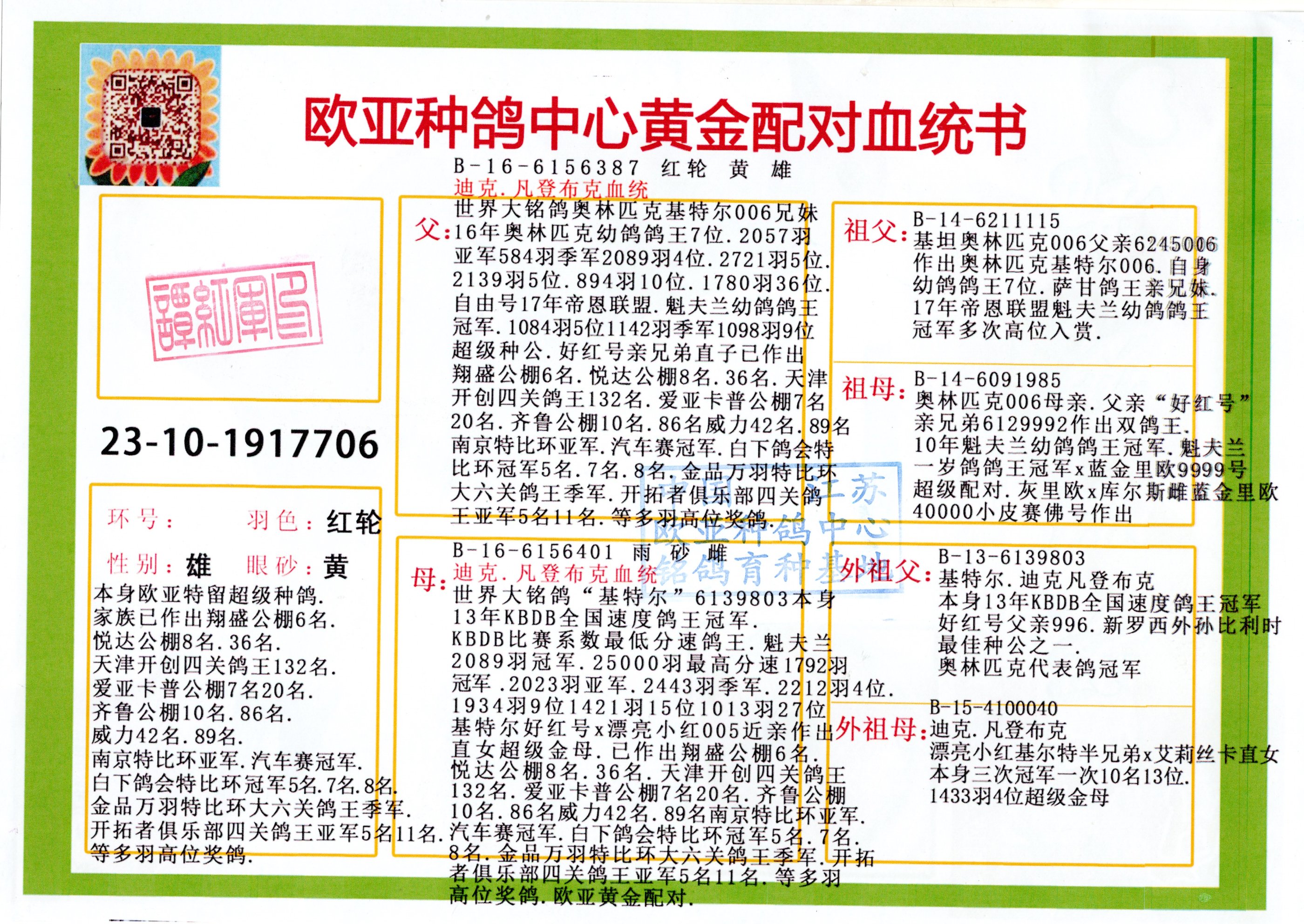 24年秋南京特比环欧亚荣获大团体冠军.小团体冠军551公里大特比13名.14名.16名.19名.20名.21名.24名.26名.27名.28名.42名.52名.54名.57名.65名.66名.68名.70名.71名.72名.74名.76名.80名.82名.83名.84名.85名.86名.90名.92名.110名.116名.121名.122名.128名.131名.158名.161名.164名.165名.166名.172名.174名.177名.182名.195名.196名.201名.205名.208名.210名.216名.253名.269名.275名.276名.294名.296名.299名,,24年秋云南天南铜都公棚决赛415名.天南铜都小棚决赛409名.云南玉活公棚决赛102名.490名.团体32名上笼二羽进二羽,天南铜都大棚506公里决赛445名。热烈祝贺河北省巨鹿县李兰生老师用欧亚泰山号血系连续十一年夺冠军,河北省国家赛冠军.全国季军等多次前十名高位,扬州王军王总用欧亚利奥24年春季获山东翔宇公棚决赛33名盖比53名。南京刘正龙刘总用欧亚盖比获得24年秋山东潍坊国际公棚决赛42名.精英赛30名.三关鸽王71名.决赛86名.加站赛16名.南京市特比环A组鸽王9名.B组鸽王5名.6名.C组鸽王5名.精英赛冠军4名.技能赛A组冠军4名.5名.秦淮区特比环荣获15名.46名.48名.87名。四川西昌徐亮徐总用欧亚利奥获得凉山州聚友决赛177名.第二关亚军双关鸽王19名.三关鸽王105名.云南豪庭公棚决赛603名。热烈祝贺24年四川重庆翔园鸽舍用欧亚泰山号荣获春季400公里冠军.秋季500公里冠军,河北王总用詹森X利奥获得千羽千翔公棚400公里冠军,广东蔡楷焕荣获24年秋爱好者 赛鸽俱乐部三关鸽王季军.一关420公里99名.二关450公里11名.三关520公里32名.单关季军.7名.12名,江西李卫兴荣获贵州红枫公棚8名.共翔俱乐部寄养棚四关综合鸽王30名.一关400公里78名.二关500公里55名.三关520公里37名.四关500公里57名.同父母获公棚18名.雷鸣获得武汉黄浦育翔中心冠军,四川陈文获得四川明鸿俱乐部300公里梦幻2名.3名.4名.9名.10名.13名.14名.15名.31名.34名.40名.41名.42名.43名.69名.71名.72名.73名.74名.94名.95名.97名.98名.99名.419公里决赛荣获总冠军7名.总共归巢9羽,四川徐亮获豪庭决赛603名,山西郑勇获得山西泰鑫公棚决赛255名詹森红狐,热烈祝贺马总获得开尔(飞跃队)决赛9名获奖金1310000万元.第一关52名,天津津福资赛180公里96名.获奖金429543万元,欧亚支持全国鸽友24年秋多人报喜 祝大家取得更好成绩,给欧亚报喜鸽友欧亚决定给每人赠送一羽超级种鸽。欧亚俱乐部特比环多关鸽王成绩:15年秋淮安特比环黑色星期一全会上笼9700多羽,当天无鸽归巢,第二天全会归巢357羽,本舍归巢158羽.前十名八羽.前一百名归巢57羽,16年春季获五关鸽王总冠军,总亚军四名.六名.七名.九名.十名.晶艺俱乐部520公里冠亚季军5名.6名.7名.9名.11名等,火车头冠军.季军6名.8名.9名.10名,16年秋晶艺俱乐部特比环520公里亚军.季军4名.6名.7名.9名,15年春南京白下特比环冠军.亚军.季军6名.7名.8名.9名.10名.指定鸽A B组获得冠军.亚军.季军4名.5名.,17年淮安特比环亚军.4名.5名.7名.8名.10名.六关鸽王总冠军.4名.6名.9名.10名,寄养棚宿迁刘总20羽特比环获冠军.季军.4名.7名.8名.9名等。18年荣获万羽特比环六关鸽王总冠军.总亚军.总季军.6名.8名.十名.单关四羽冠军.二羽亚军.四羽季军.前十名27羽。19年秋万羽特比环六关鸽王总亚军.总季军.5名.8名等,单关二羽冠军.三羽亚军.一羽季军前十名31羽。20年秋淮安市鸽会四关特比环大赛风雨无阻鸽王亚军.鸽王六名,金品俱乐部万羽特比环六关鸽王总冠军,总亚军.四名.五名.六名.七名.八名.十名.前二百名鸽王35羽,单关冠亚季军前十名四十多羽,火车头五关鸽王季军.六名.八名.前二百名鸽王十七羽。20年春荣获淮安五区一市四关鸽王总冠军.亚军.四名.八名.九名。21年秋荣获金品万羽特比环大赛六关鸽王总亚军.总季军.四名.七名.九名.十名.单关冠亚军季军前十名三十多羽。火车头协会鸽王六名.七名.十名.单关前十名十七羽。22年秋荣获鸽王总冠军.总亚军.5名.7名.8名.9名.11名.单关冠亚季军前十名三十多羽,第一关单关前二百名四十多羽,第二关前二百名三十多羽,第三关前二百名四十多羽,第四关前二百名四十多羽,第五关前一百名53羽。23年秋荣获鸽王季军.五名.八名.十名.13名.17名.20名.27名等多羽鸽王.单关前十名二十多羽。公棚.寄养棚部分成绩:16年秋宁夏黄河公棚总冠军电脑戈马力指定通炮冠军,17年送八羽参赛获得鸽王八名进奖四名,支持韩总荣获八名。支持鸽友荣获宁夏中卫公棚决赛总冠军.精英赛冠军,支持18年宁夏黄河公棚决赛冠军詹森X泰山。安徽鼎博寄养棚院内外四关鸽王总冠军.鸽王十七名.三十七名同窝,鸽王39名.42名.58名.67名。18年山东公棚预赛冠军.决赛65名.送八羽进奖五羽.指定获奔驰汽车一辆。支持鸽友获得云南蓝云公棚冠军.盖比X佛卡门。支持鸽友荣获云南银集公棚决赛冠军 詹森427X520血系 速度赛6700羽冠军。17年荣获金马俱乐部寄养棚四关鸽王总冠军.季军.六名.八名.第一关冠军.亚军.季军四名.七名.十一名.金牌教练奖。支持鸽友18年北京费翔公棚预赛九名电脑X桑杰士,支持鸽友荣获陕西威力公棚决赛11名.内蒙古临河寄养棚四关鸽王六名.詹森配泰山,支持河北王总用欧亚詹森427配胡本喜获20年秋开尔青年棚季军。云南东荣公棚16年预赛冠军.决赛77名.17年决赛12名.詹森红狐X泰山,17年平安公棚决赛4名 詹森427。欧亚获得21年金母寄养棚第一关四名.第二关5名.第三关5名.6名.7名.10名.三关鸽王总冠军,四关鸽王14名.十羽鸽王。支持河
