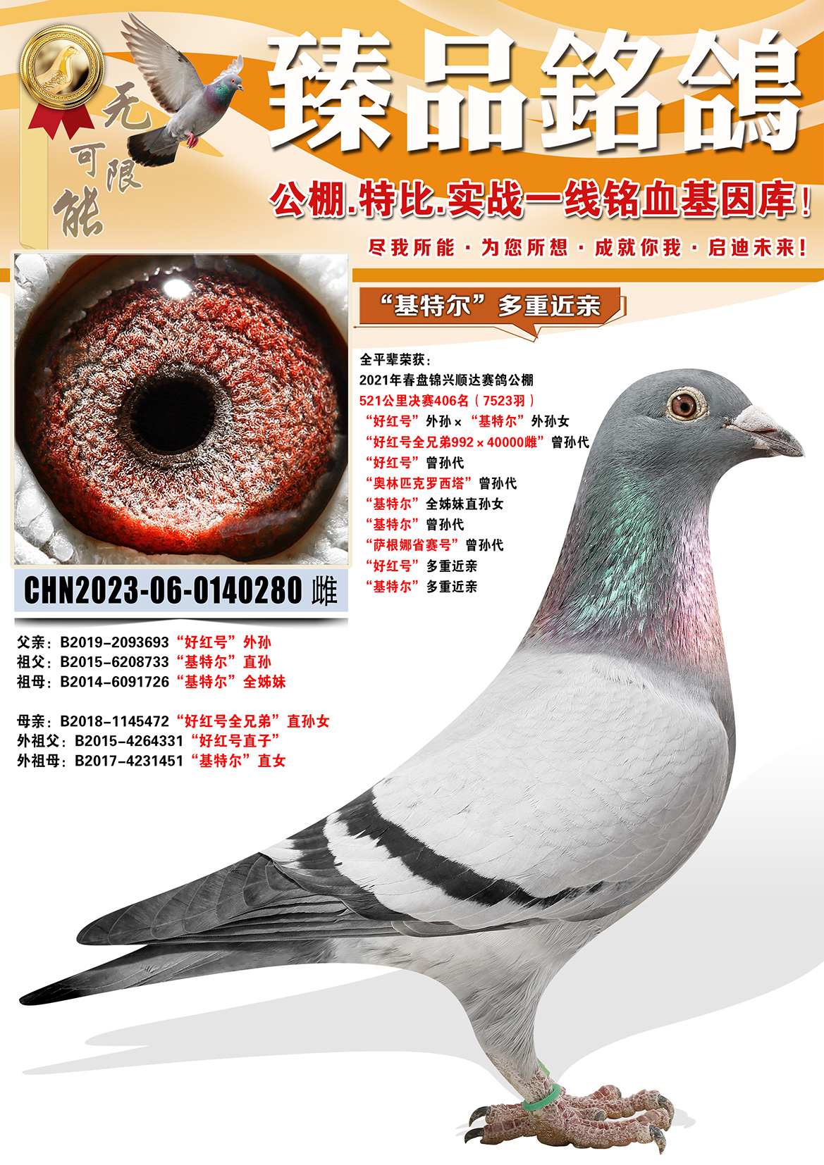 所有拍卖鸽全部血统真实!!个人鉴鸽观点不一,飞不飞天上见.血统成绩第一