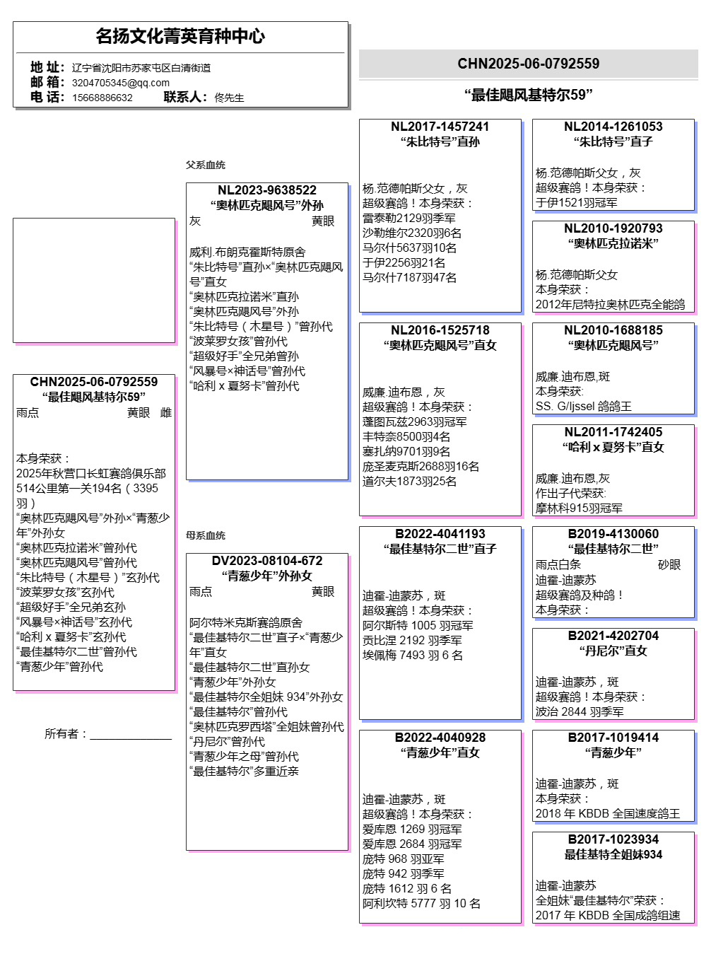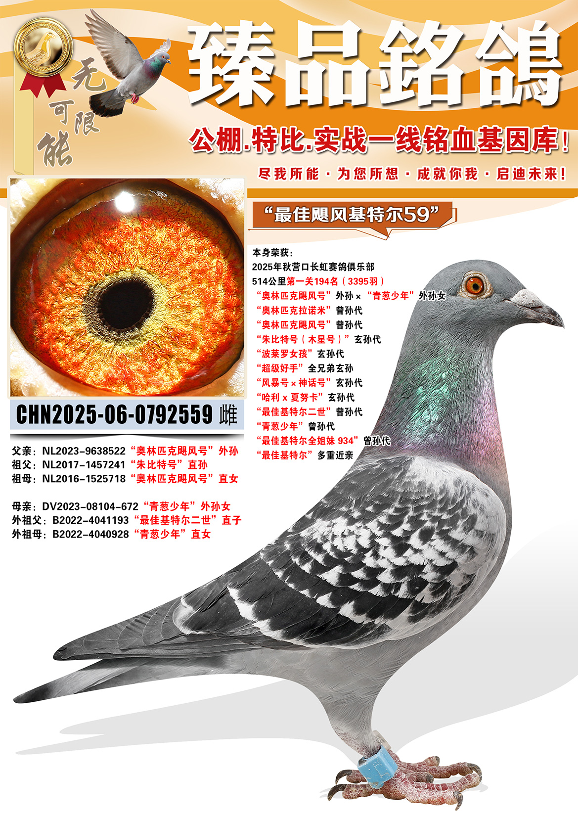 所有拍卖鸽全部血统真实!!个人鉴鸽观点不一,飞不飞天上见.血统成绩第一