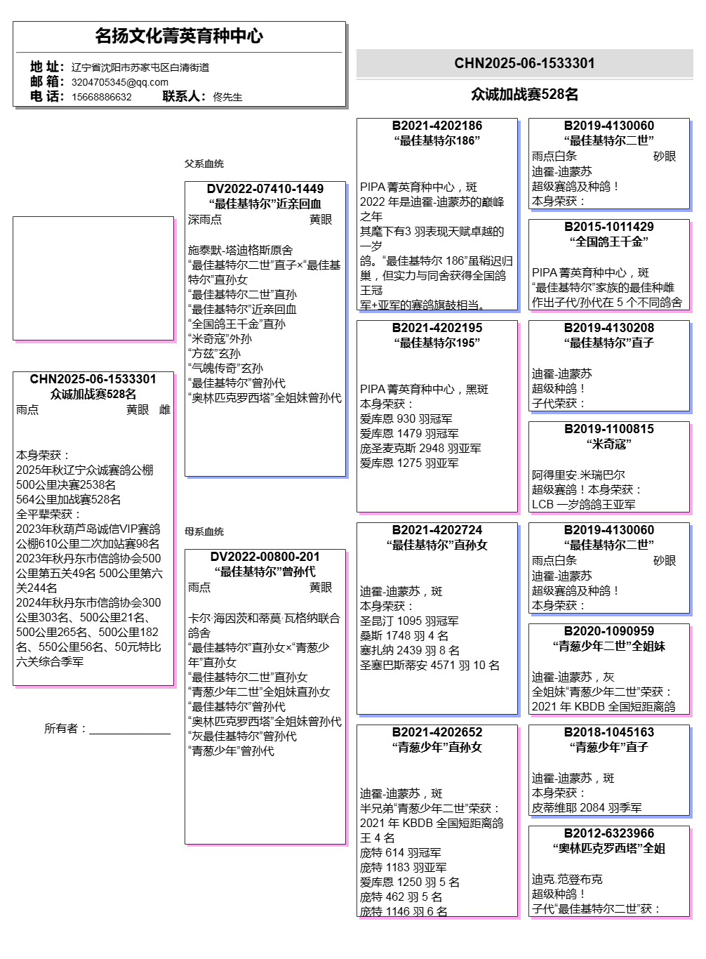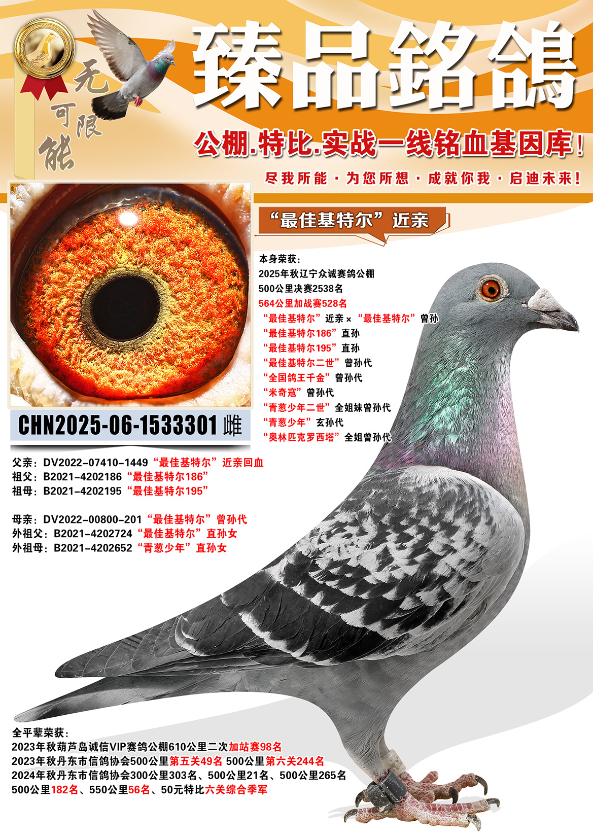所有拍卖鸽全部血统真实!!个人鉴鸽观点不一,飞不飞天上见.血统成绩第一