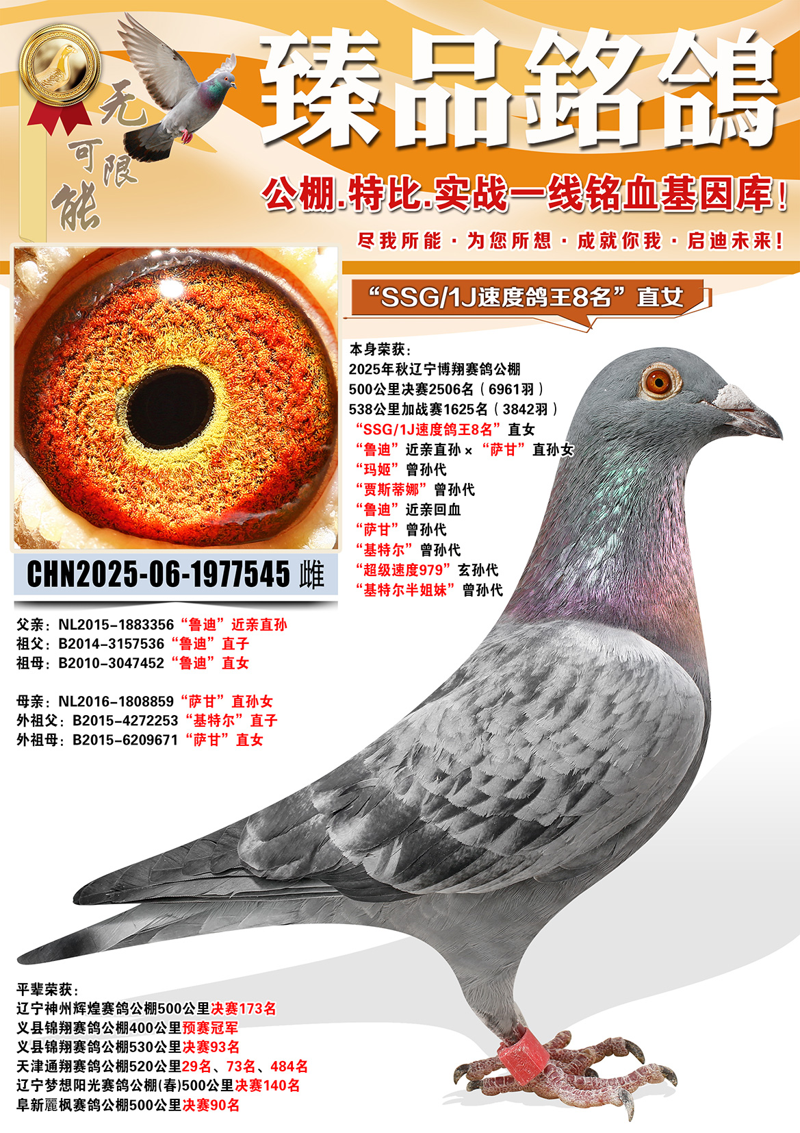 所有拍卖鸽全部血统真实!!个人鉴鸽观点不一,飞不飞天上见.血统成绩第一