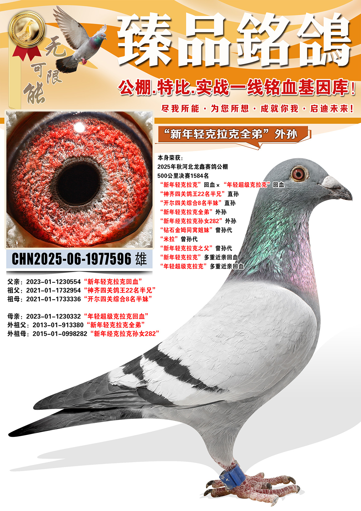 所有拍卖鸽全部血统真实!!个人鉴鸽观点不一,飞不飞天上见.血统成绩第一