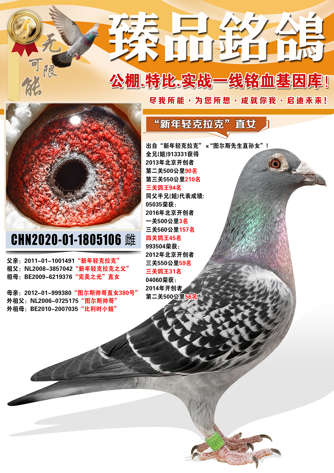 所有拍卖鸽全部血统真实!!个人鉴鸽观点不一,飞不飞天上见.血统成绩第一