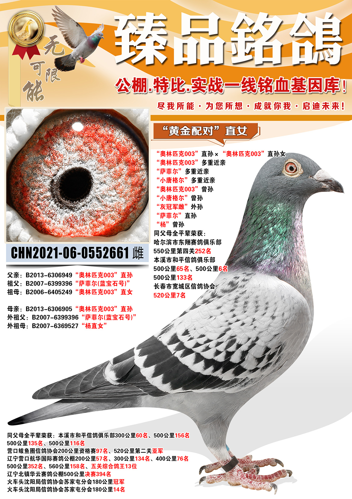 所有拍卖鸽全部血统真实!!个人鉴鸽观点不一,飞不飞天上见.血统成绩第一