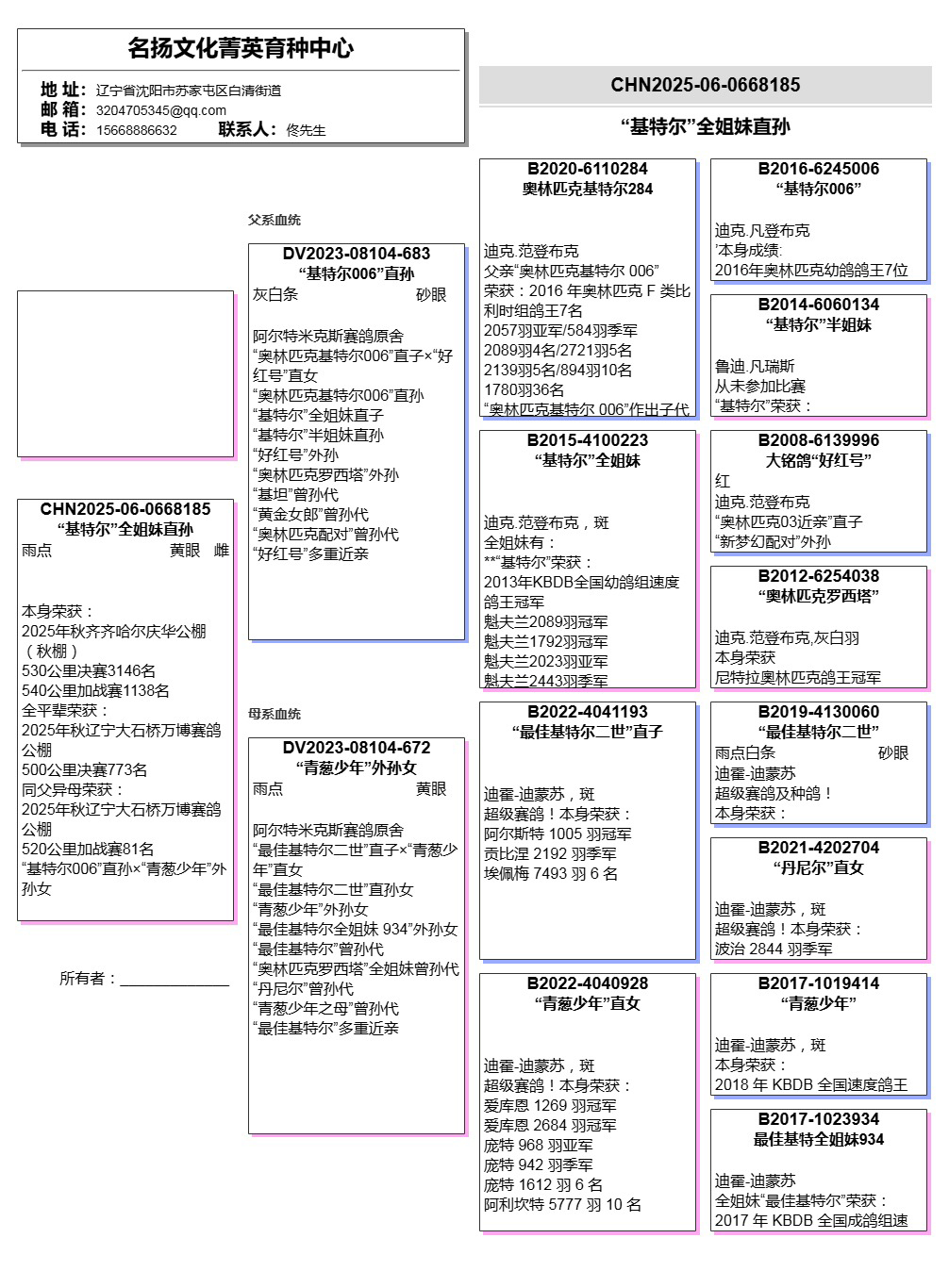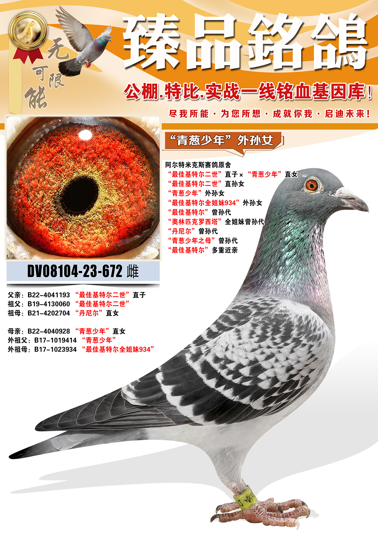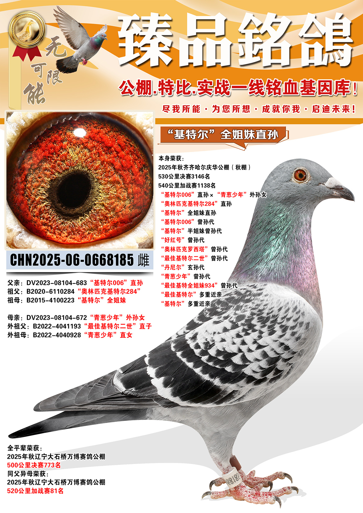 所有拍卖鸽全部血统真实!!个人鉴鸽观点不一,飞不飞天上见.血统成绩第一