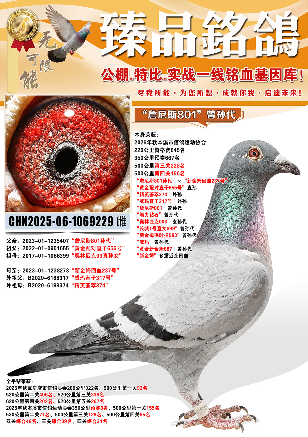 所有拍卖鸽全部血统真实!!个人鉴鸽观点不一,飞不飞天上见.血统成绩第一