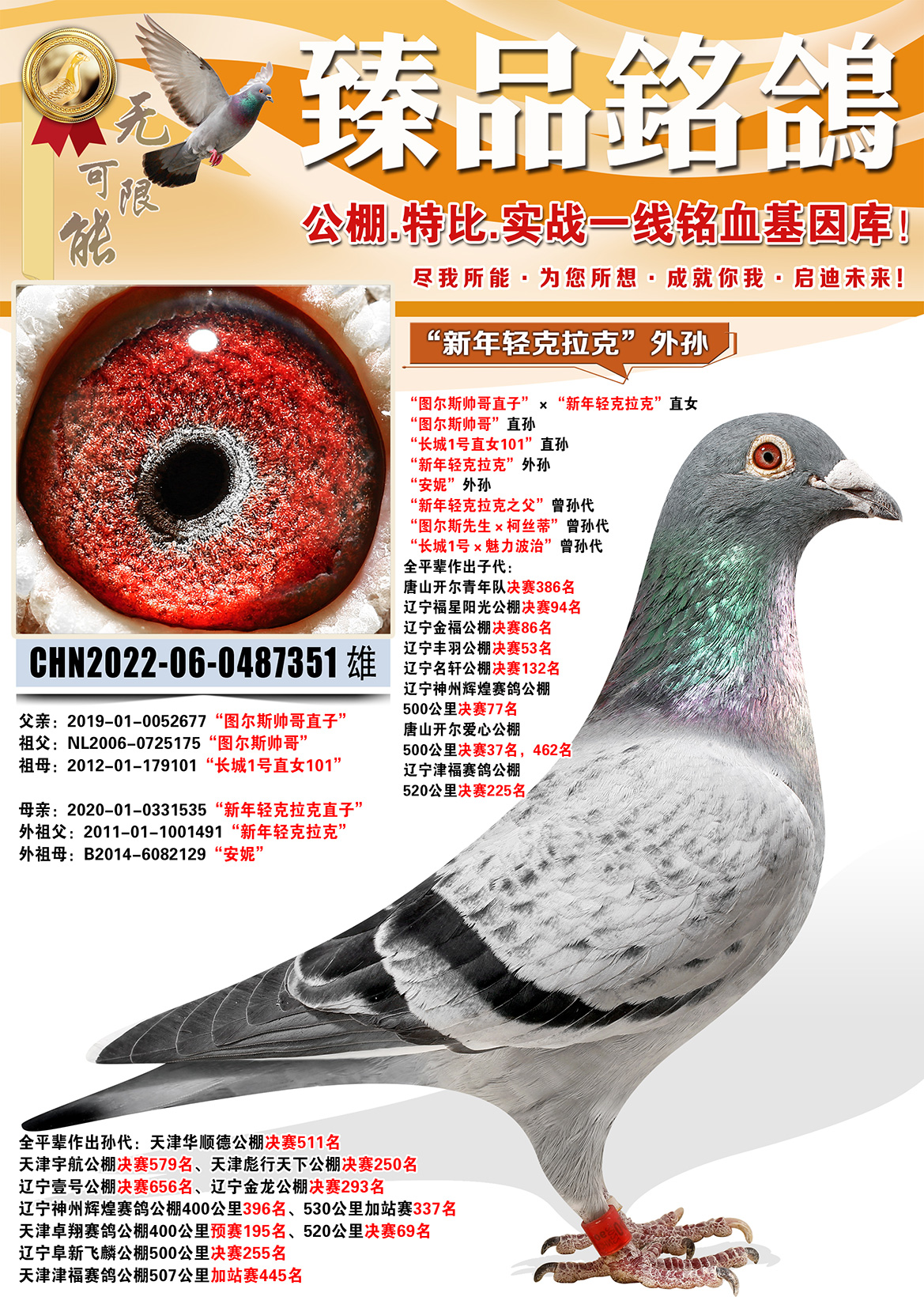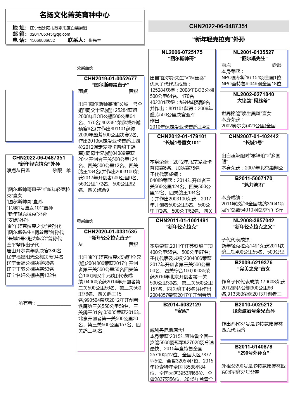 出自“图尔斯帅哥”新长城一号全姐”!同父半兄(姐)125284获得2008年BOB公棚500公里64名、170名;402381荣获城外诚预赛9名(并作出891101获得2009年盛芳500公里决赛2名、作出2010保定爱亚卡普鸽王四位2012保定爱亚卡普鸽王冠军);同母半兄(姐)04089荣获2014开创者三关560公里124名、四关500公里12名、四关鸽王134名(并作出2003100荣获2017年开创者500公里9名、560公里172名、500公里62名、四关综合9