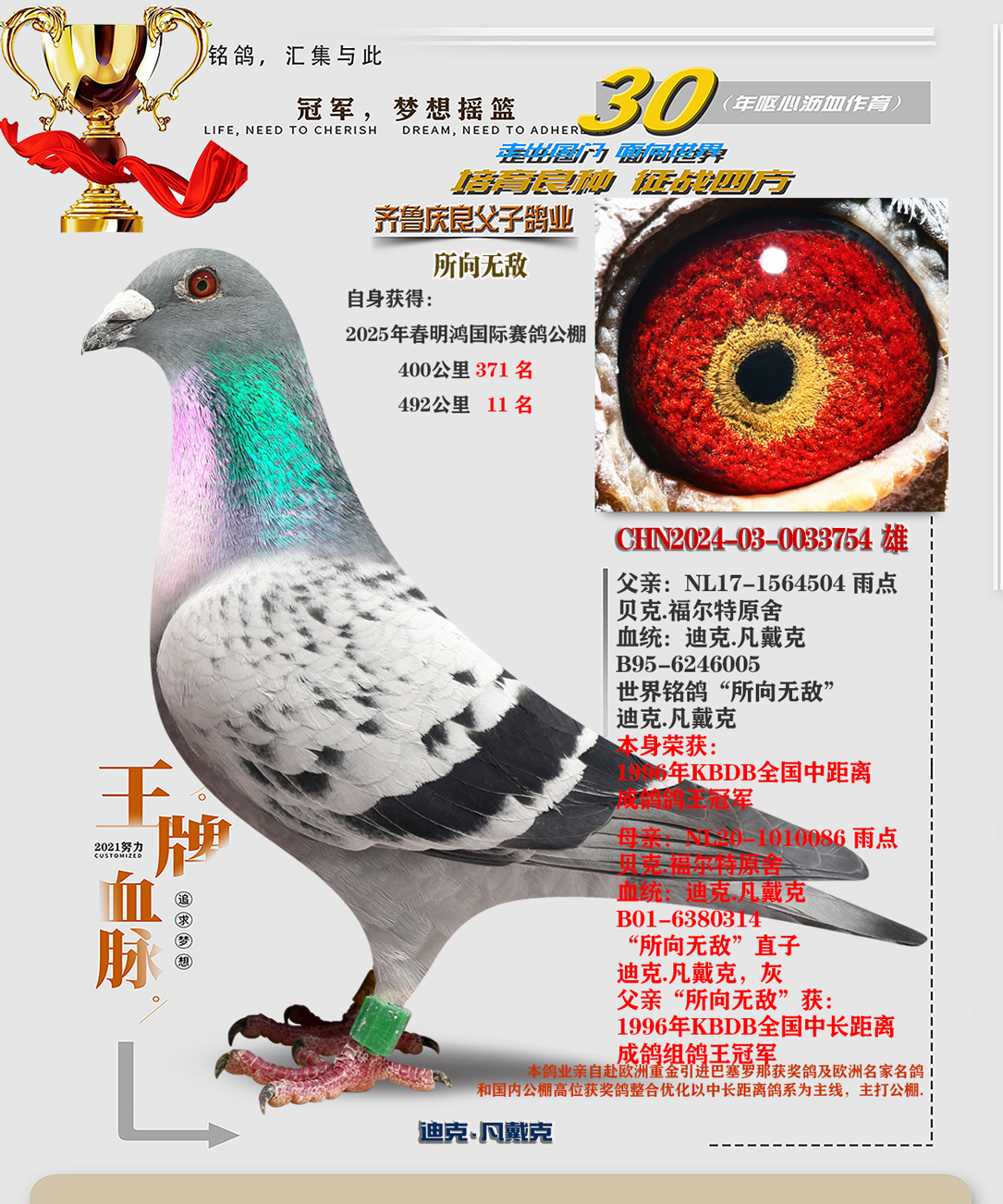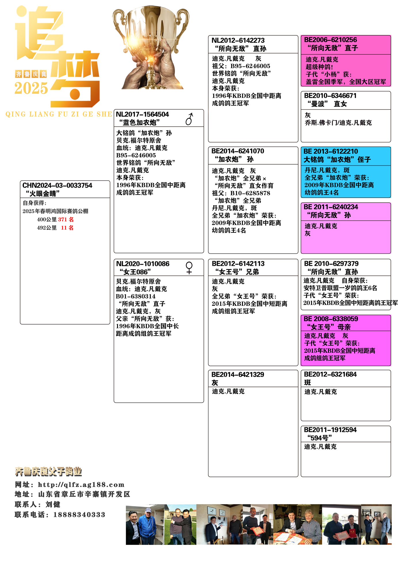 刘总你好!给报喜,我引进你的2016-32-0014055灰雄盖比闪电号近亲。它的直子2020-01-0840803灰。在2020年秋北京国信达公棚获得300公里冠军,500公里20名,双关鸽王,三关鸽王!通指。感谢您的支持!感谢您的优秀种鸽。