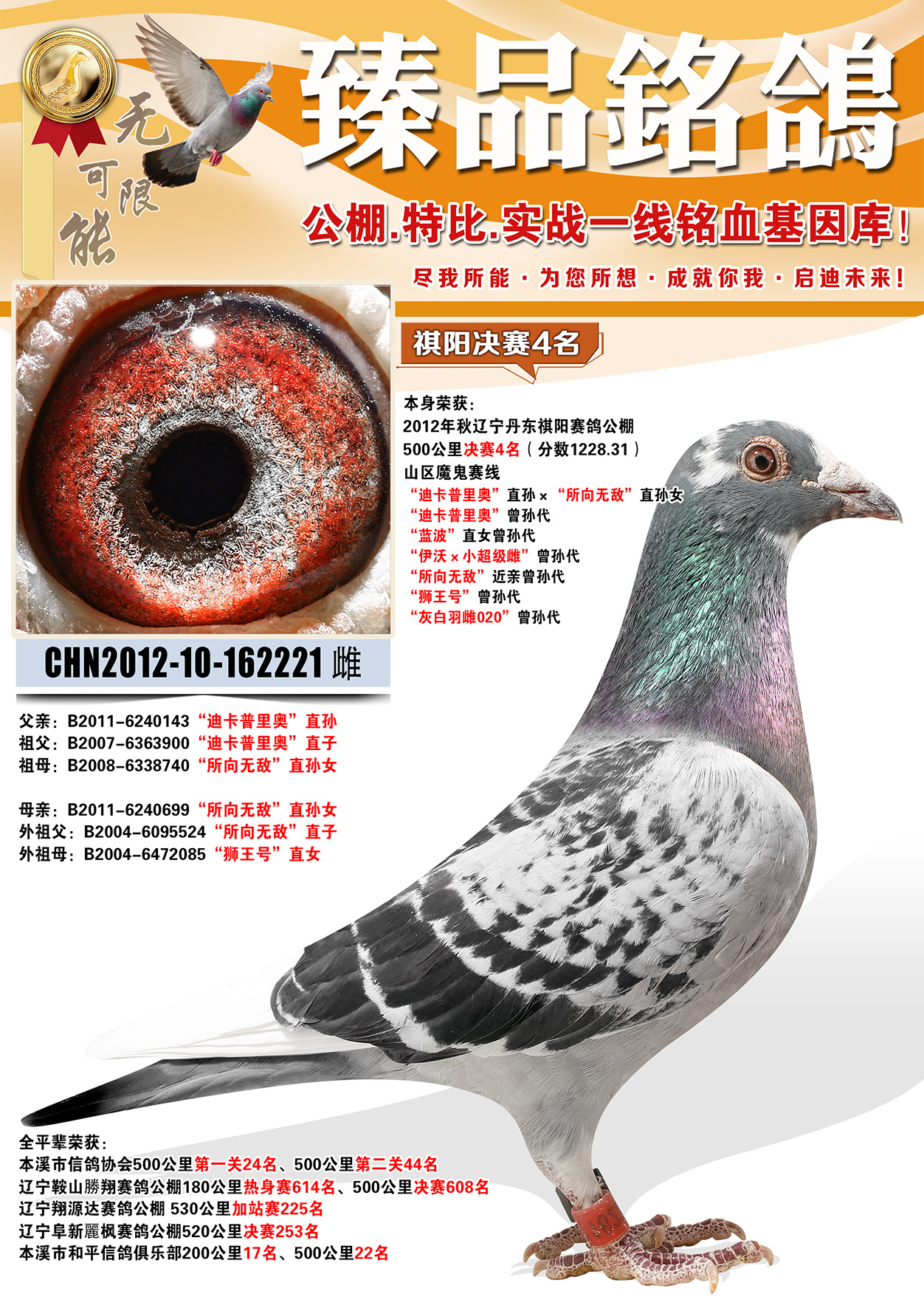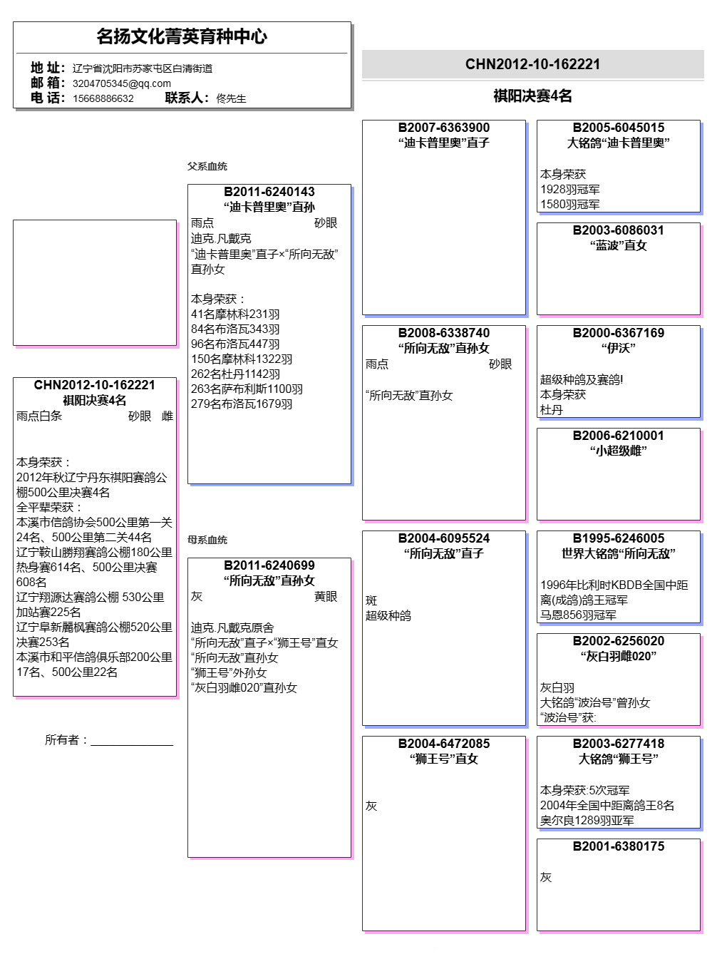 所有拍卖鸽全部血统真实!!个人鉴鸽观点不一,飞不飞天上见.血统成绩第一