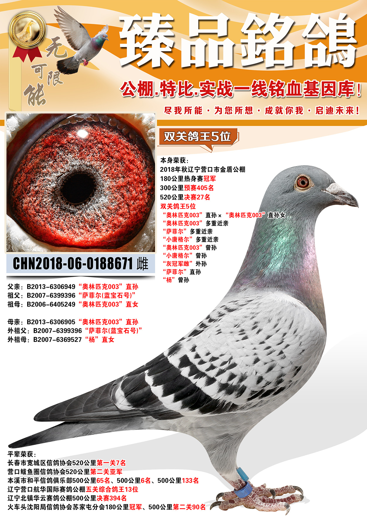 所有拍卖鸽全部血统真实!!个人鉴鸽观点不一,飞不飞天上见.血统成绩第一