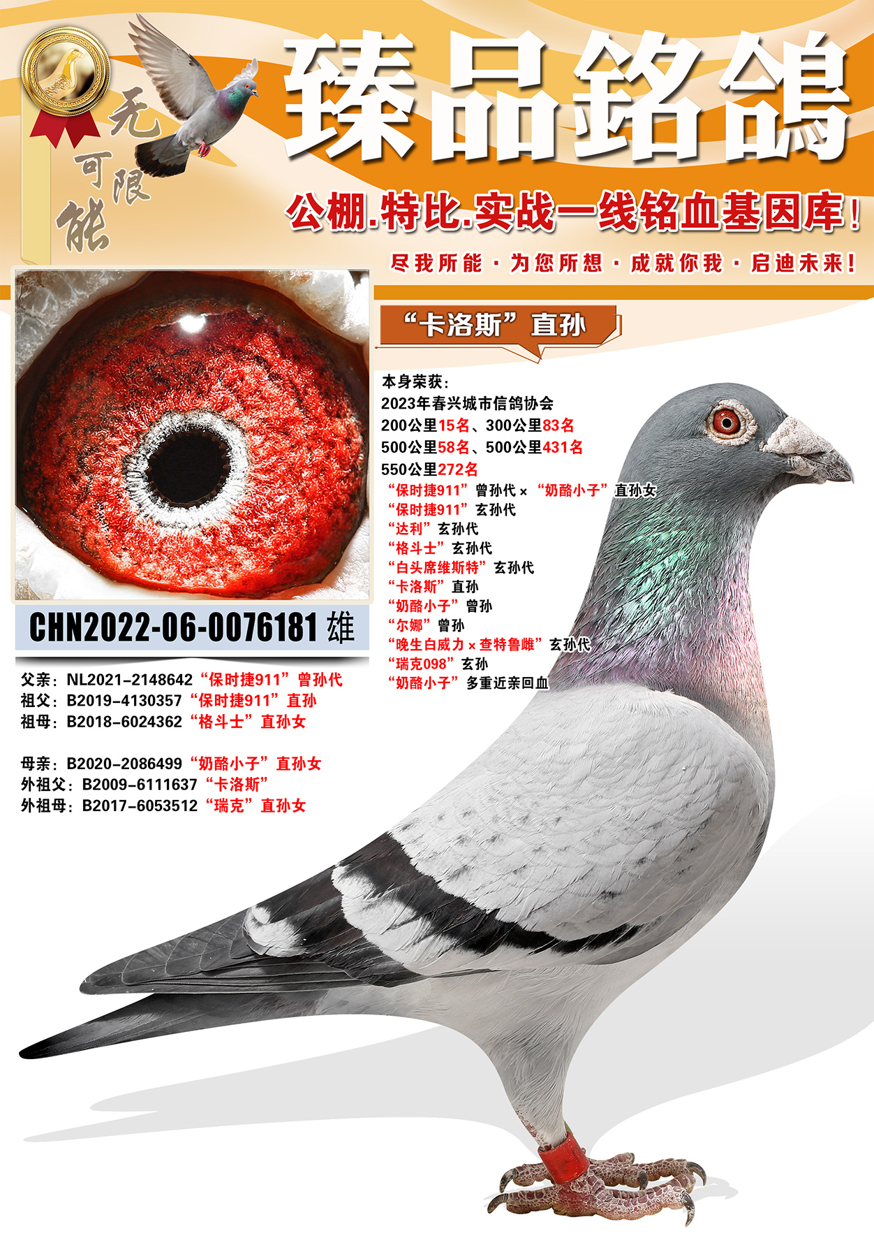 所有拍卖鸽全部血统真实!!个人鉴鸽观点不一,飞不飞天上见.血统成绩第一