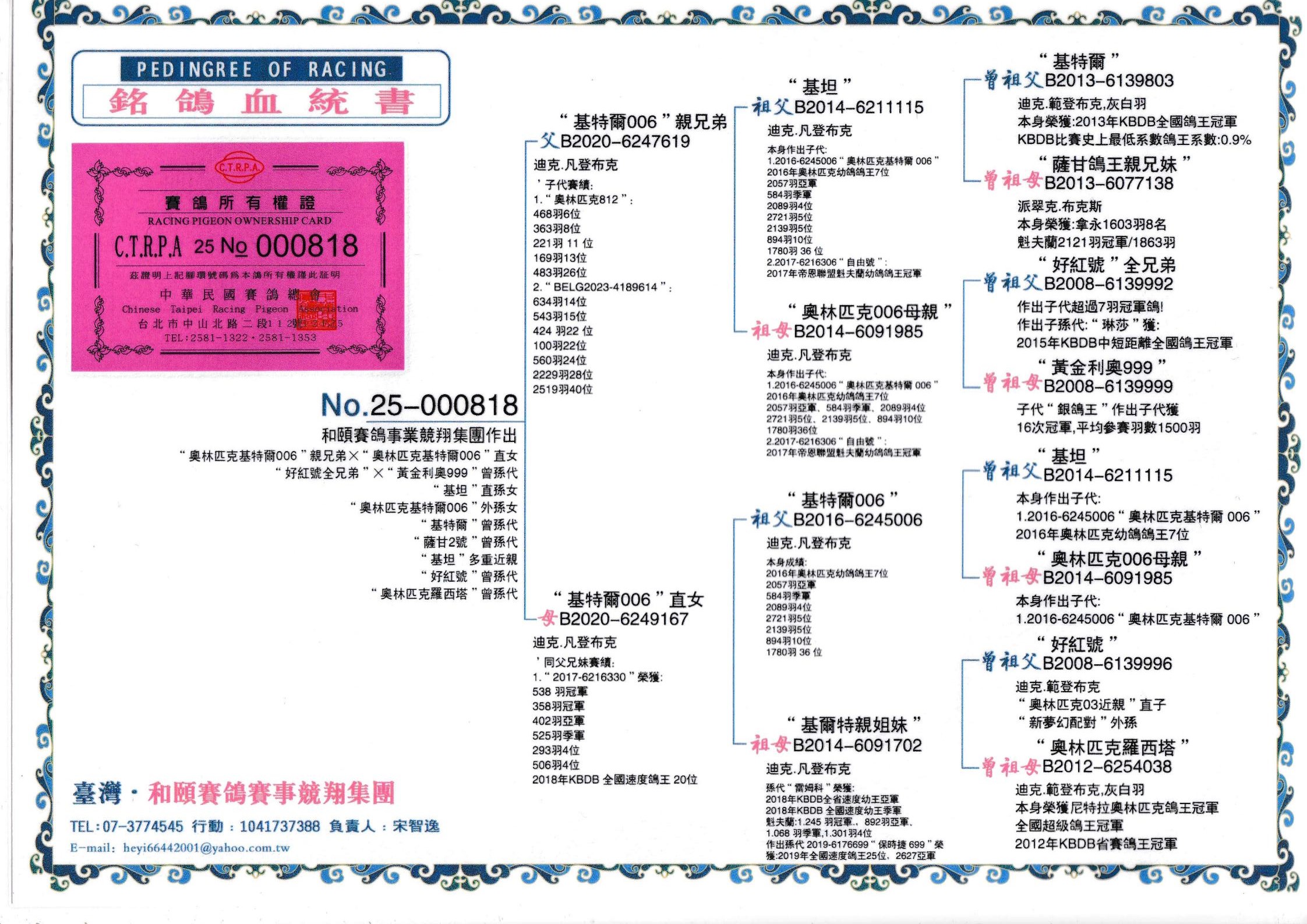 所有拍卖鸽全部血统真实!!个人鉴鸽观点不一,飞不飞天上见.血统成绩第一