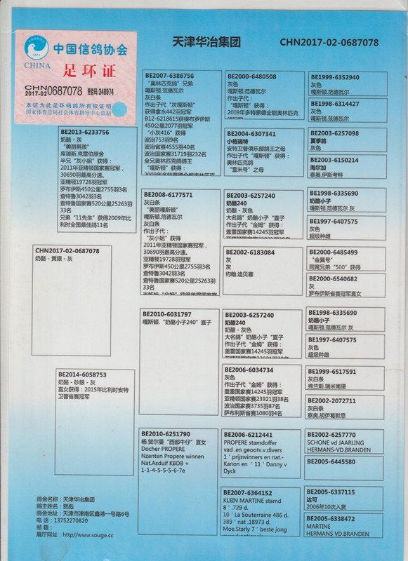 3、注明:请注意看种鸽和血统图片,有的种鸽环卡丢失,有些奖鸽无环卡和奖状和血统,介意请勿出价;