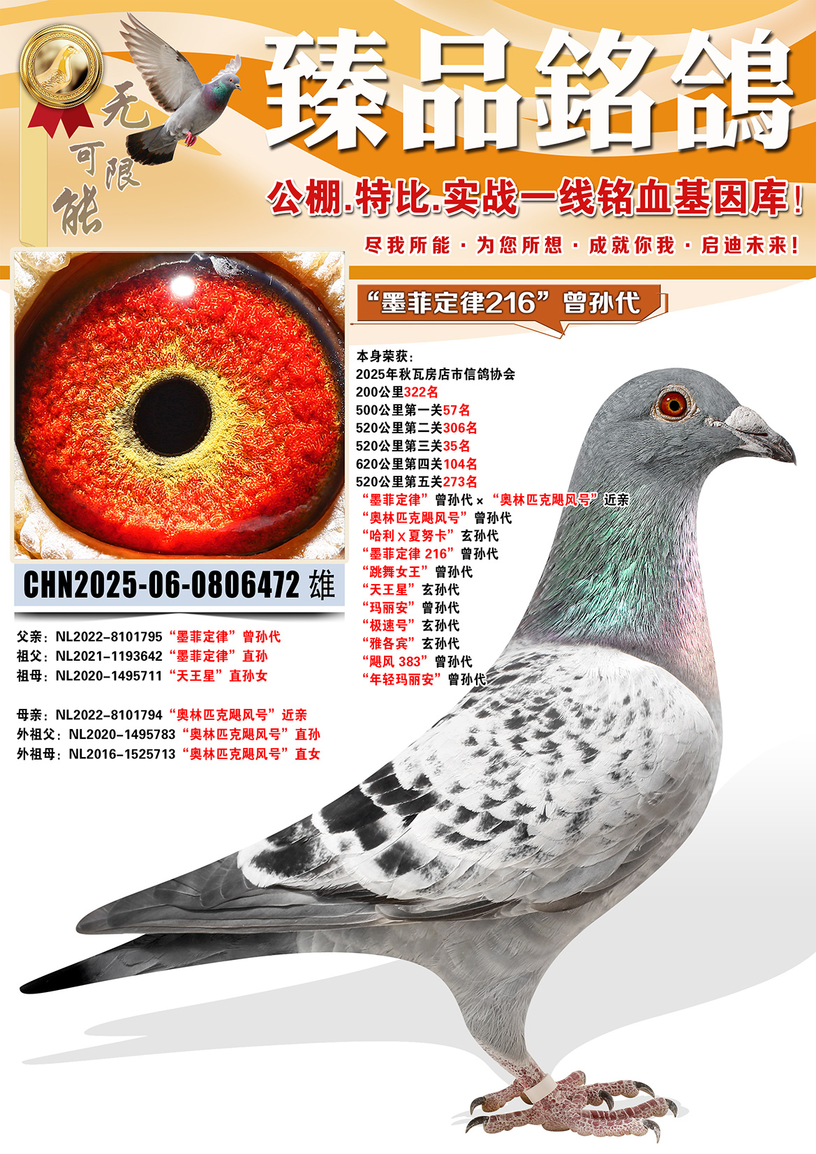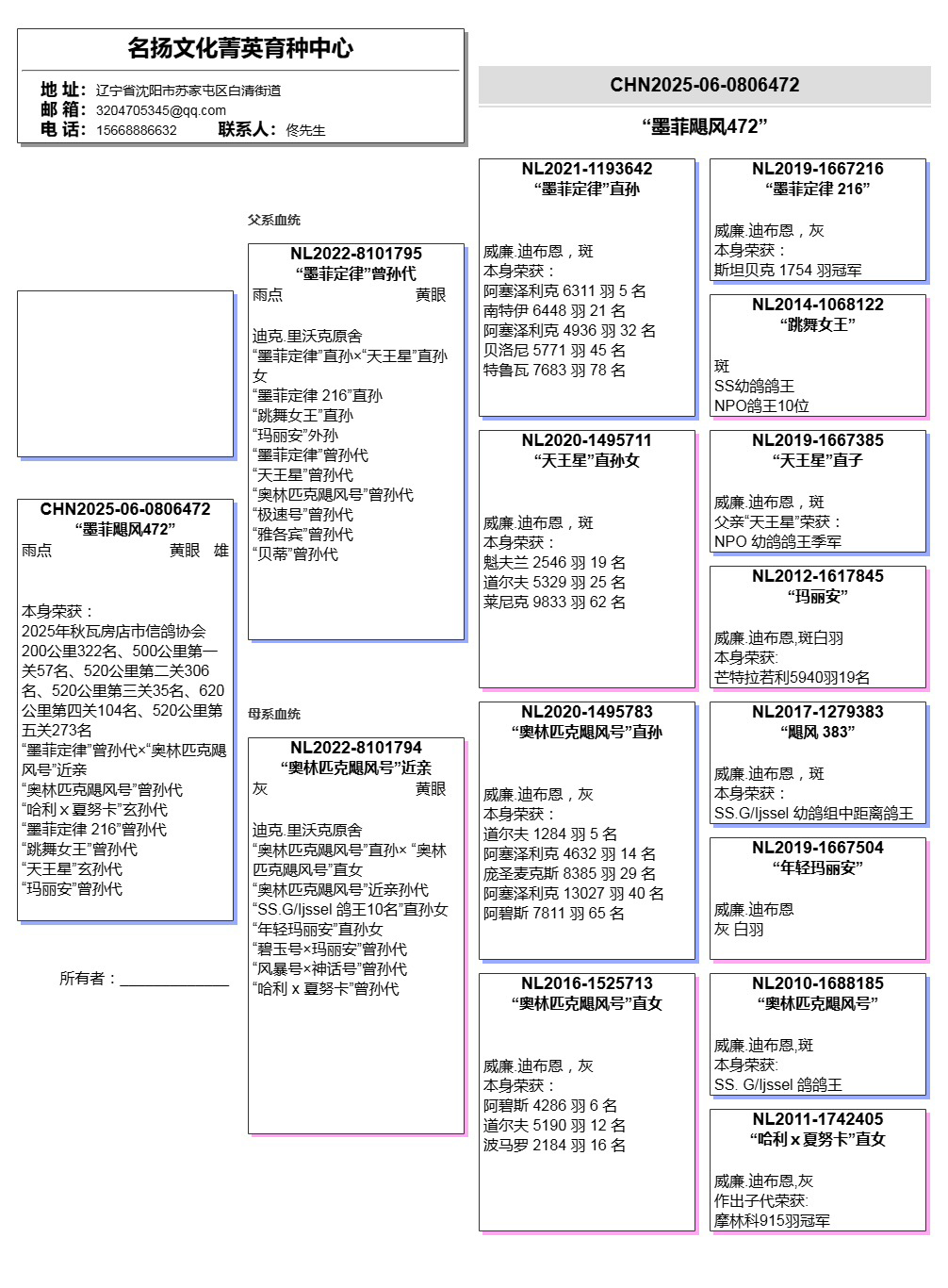 所有拍卖鸽全部血统真实!!个人鉴鸽观点不一,飞不飞天上见.血统成绩第一