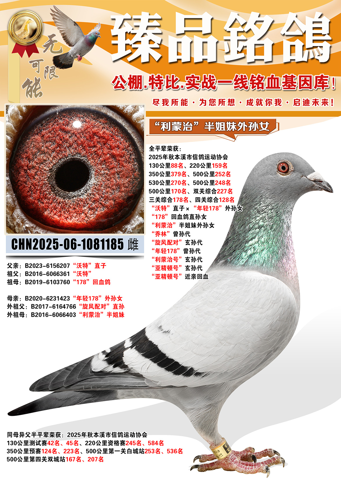 所有拍卖鸽全部血统真实!!个人鉴鸽观点不一,飞不飞天上见.血统成绩第一
