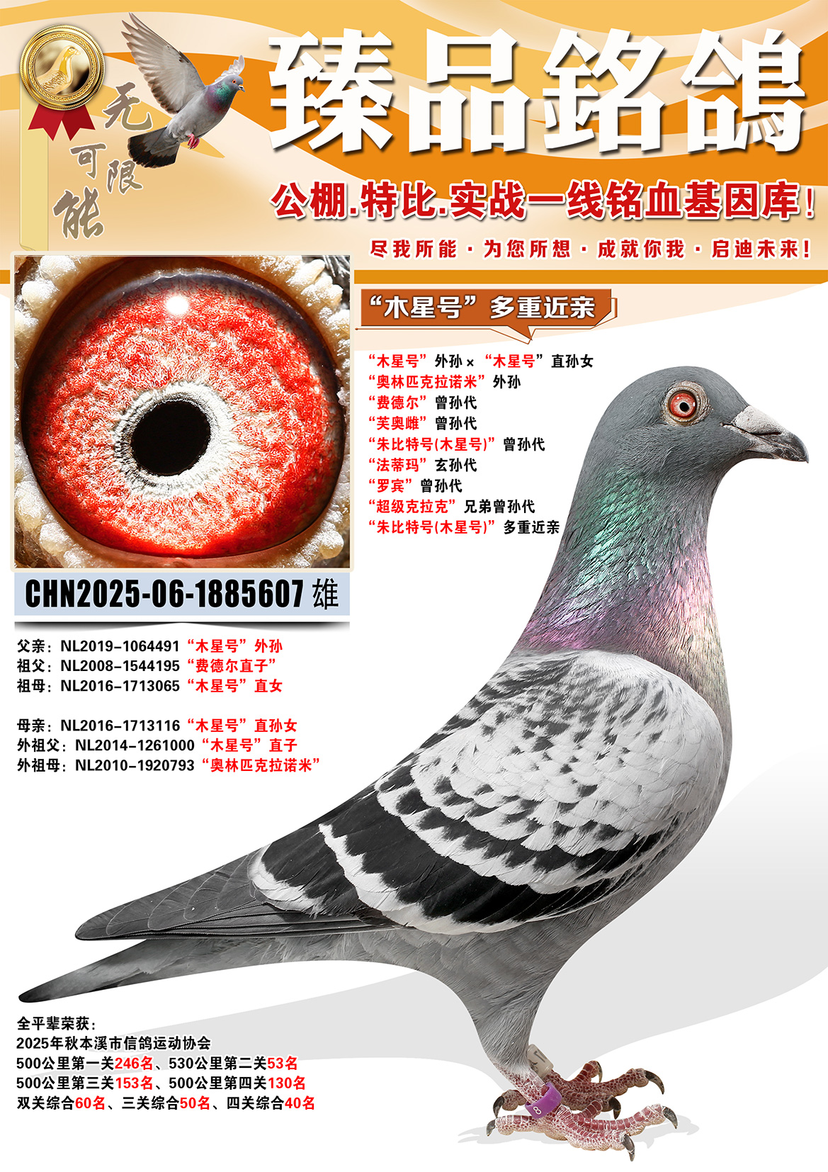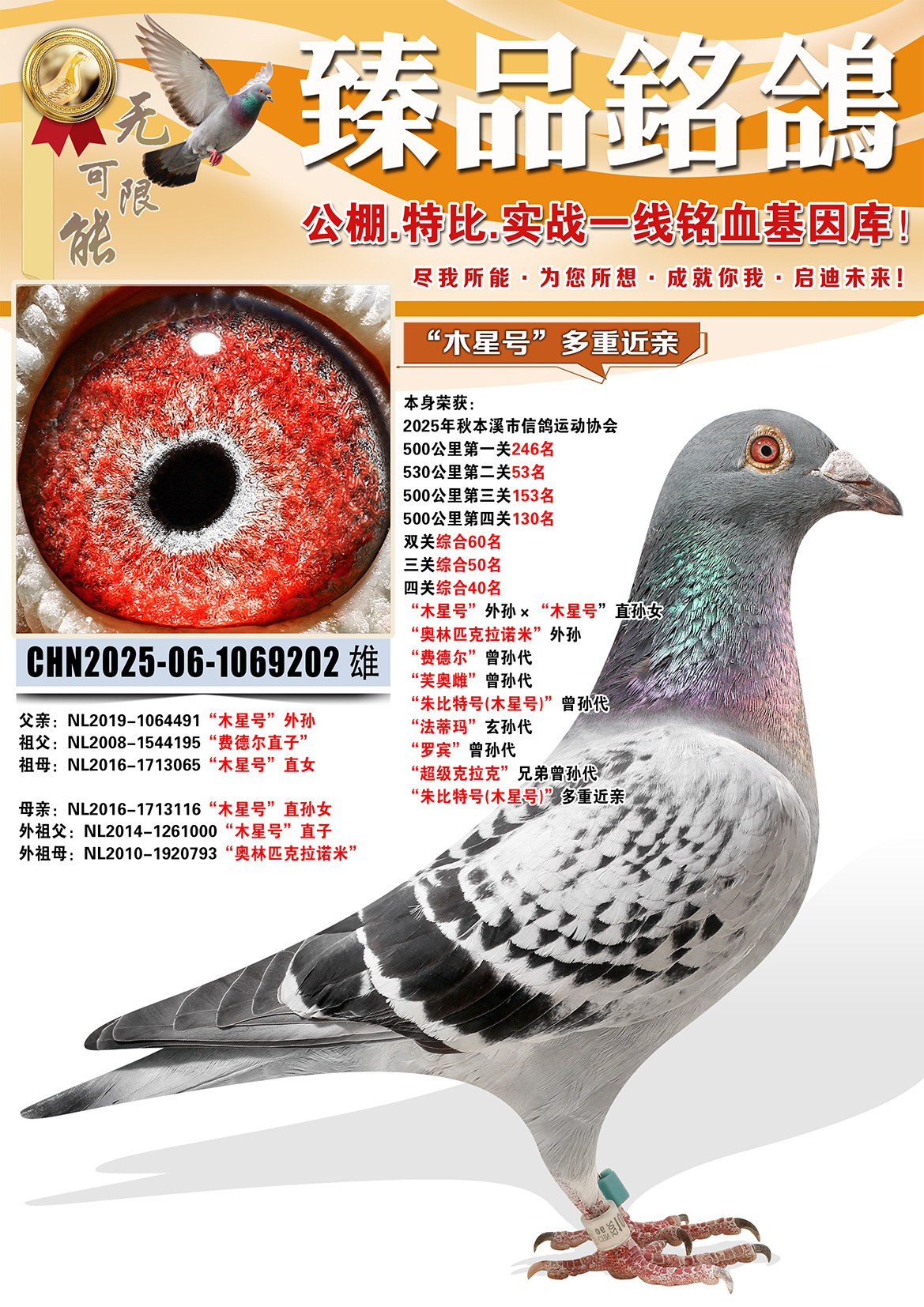 所有拍卖鸽全部血统真实!!个人鉴鸽观点不一,飞不飞天上见.血统成绩第一