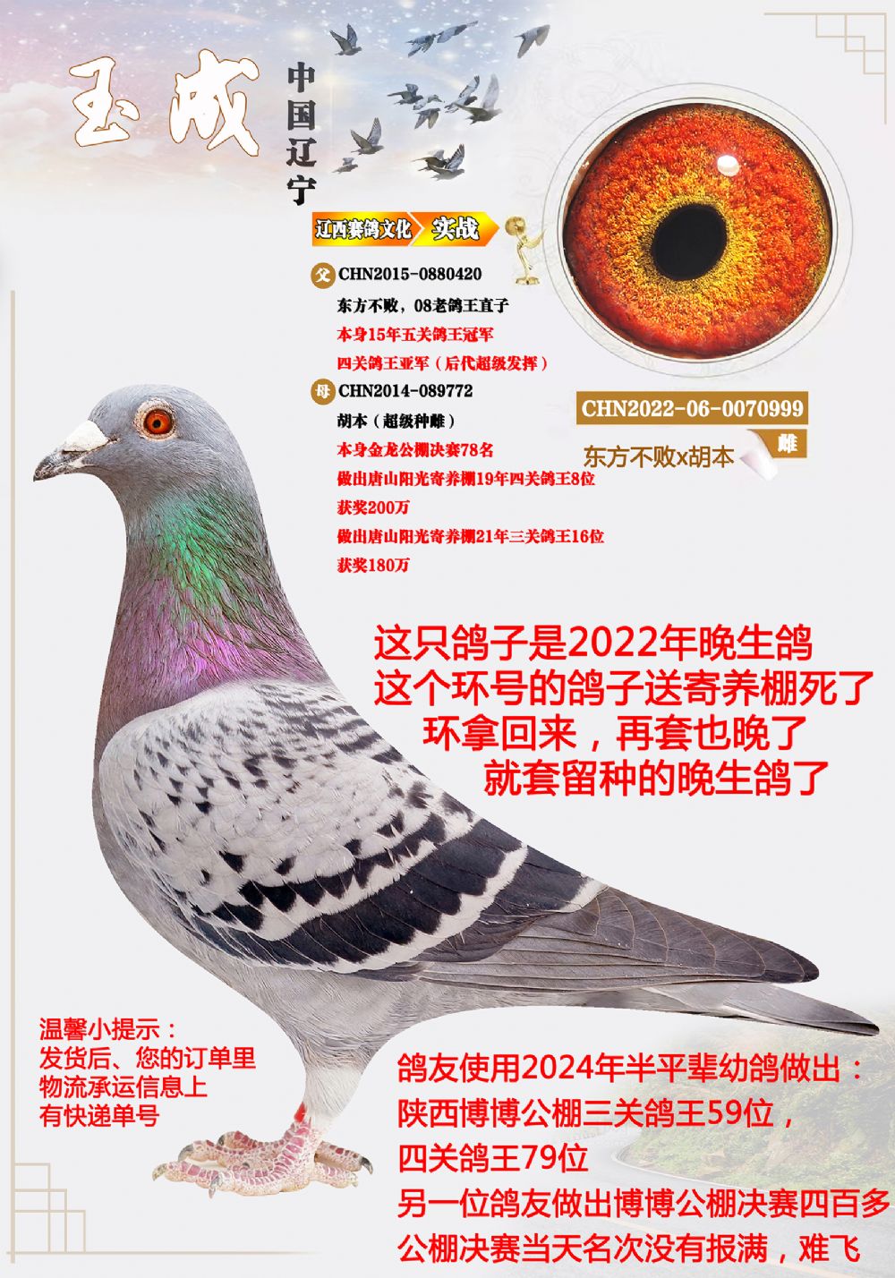 4、本期拍卖鸽有血统书的都已经上传,没有上传的代表没有血统书及足环证,介意勿拍,以免后续发生不必要麻烦。