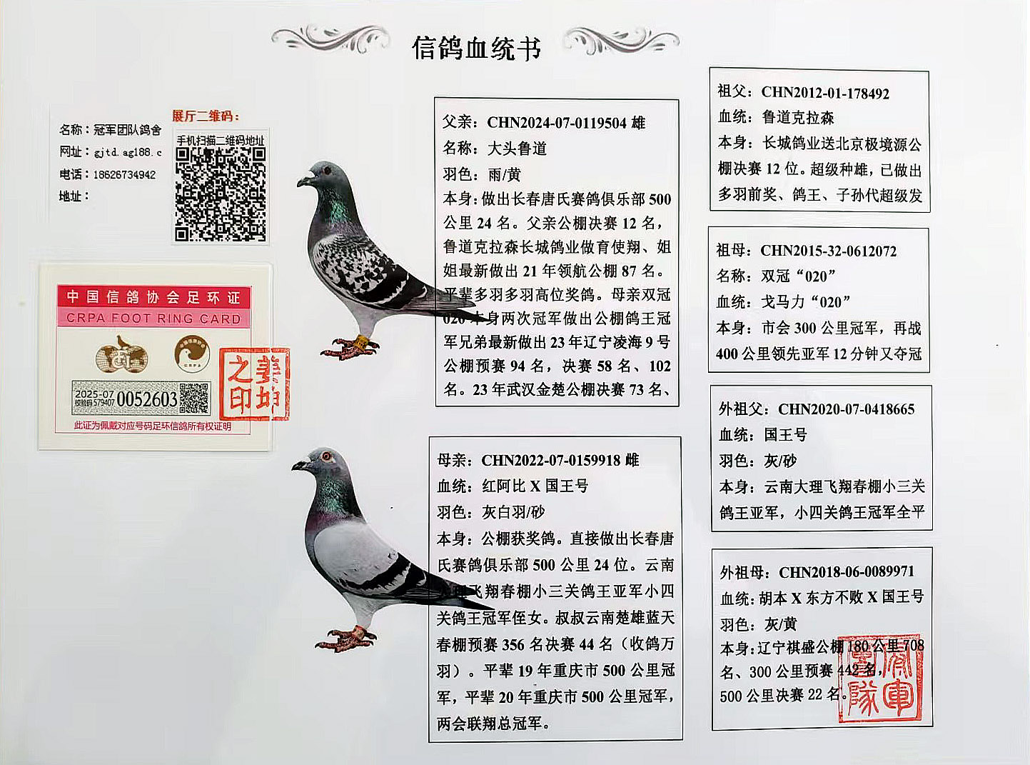 血统书足环卡随鸽发出,低价位高品质幼鸽,种赛皆宜。良心做人,所有成绩血统假一赔百,不做虚假宣传!