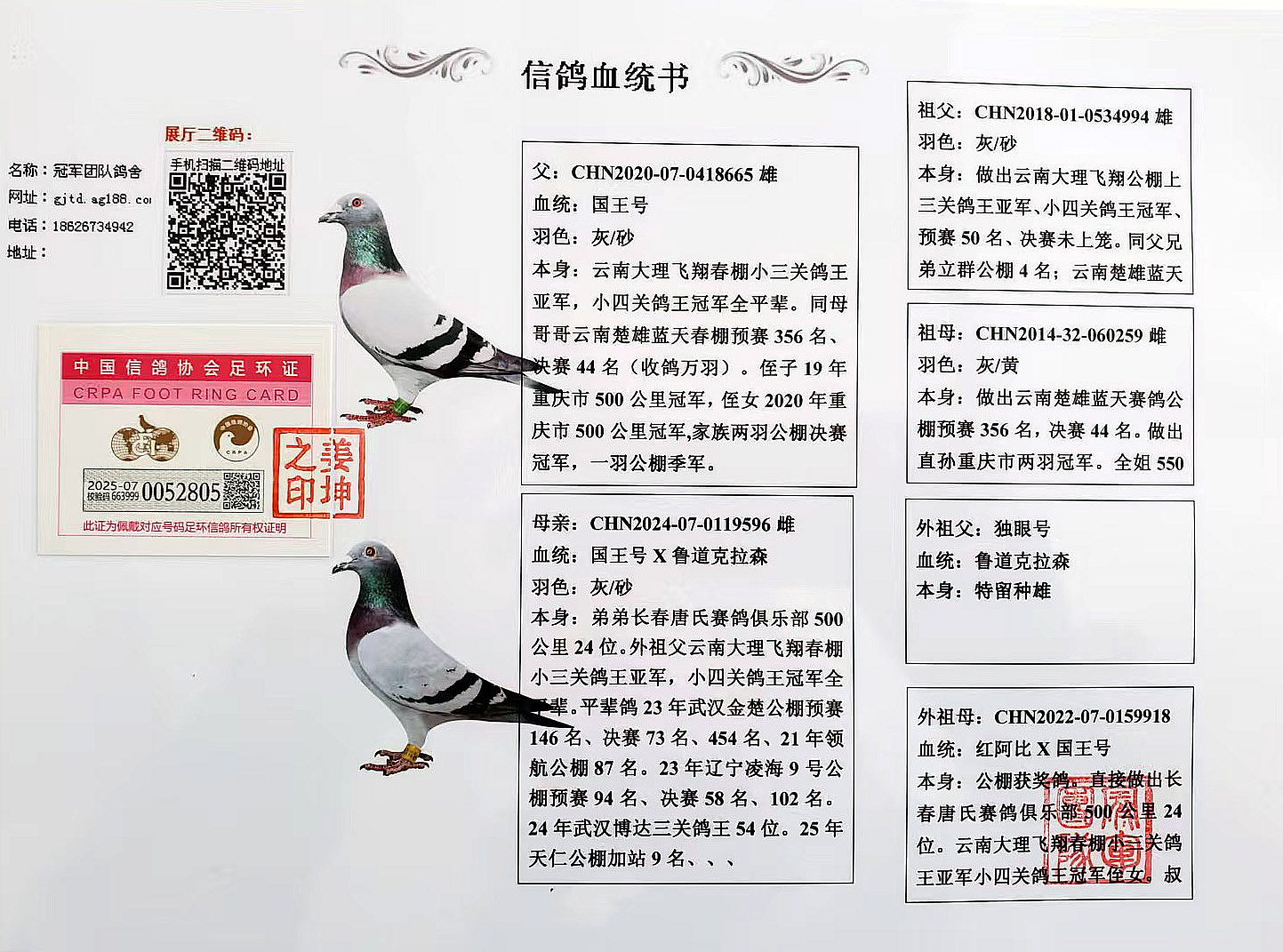 血统书足环卡随鸽发出,低价位高品质幼鸽,种赛皆宜。良心做人,所有成绩血统假一赔百,不做虚假宣传!