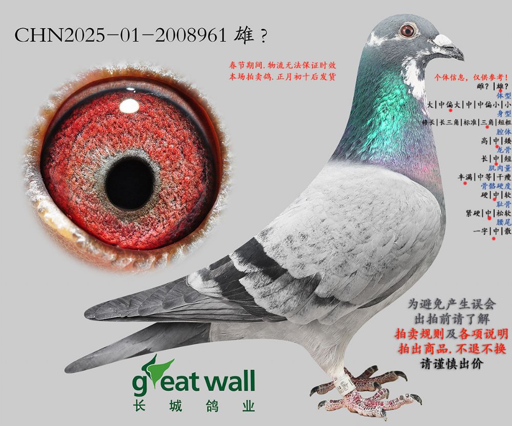 因拍卖鸽均是未做育过的种鸽或幼鸽,图内所标雌雄仅供参考,实际性别已实物为准。不做退换理由。