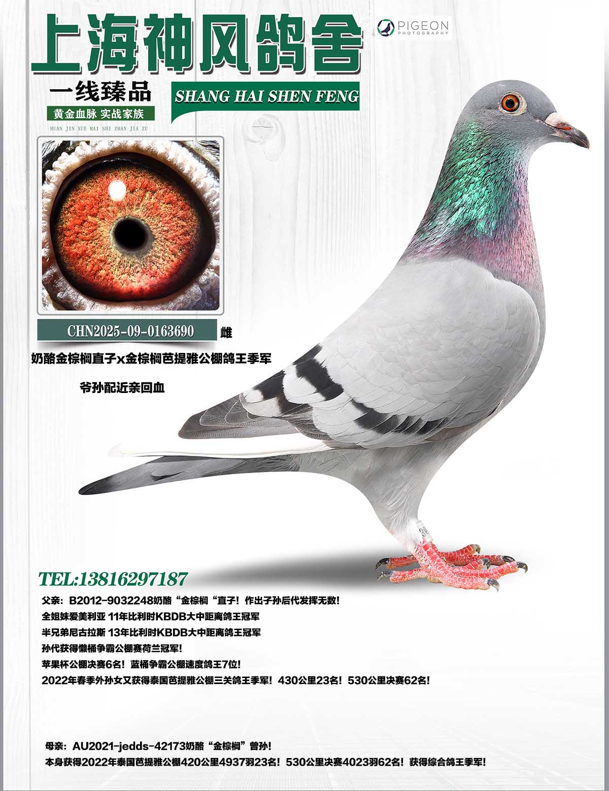 自身获得苹果杯公棚赛鸽王冠军!作出子代获得苹果杯公棚决赛8名!综合7名!尼亚拉加公棚赛鸽王4位!2022年泰国芭提雅公棚420公里4937羽23名!530公里决赛4023羽62名!获得综合鸽王季军!