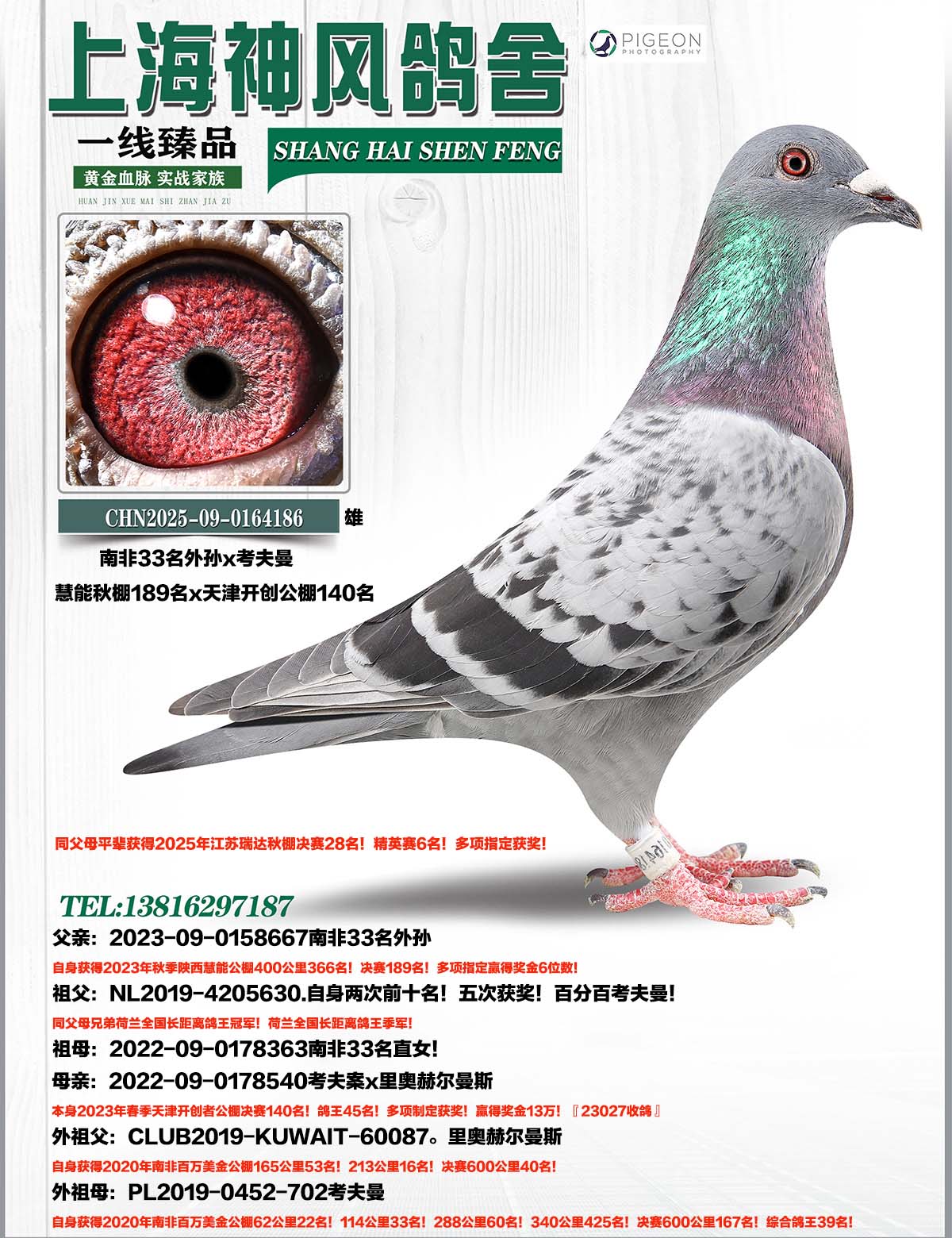 祖父:NL2019-4205630.自身两次前十名!五次获奖!同父母兄弟荷兰全国长距离鸽王冠军!荷兰全国长距离鸽王季军!