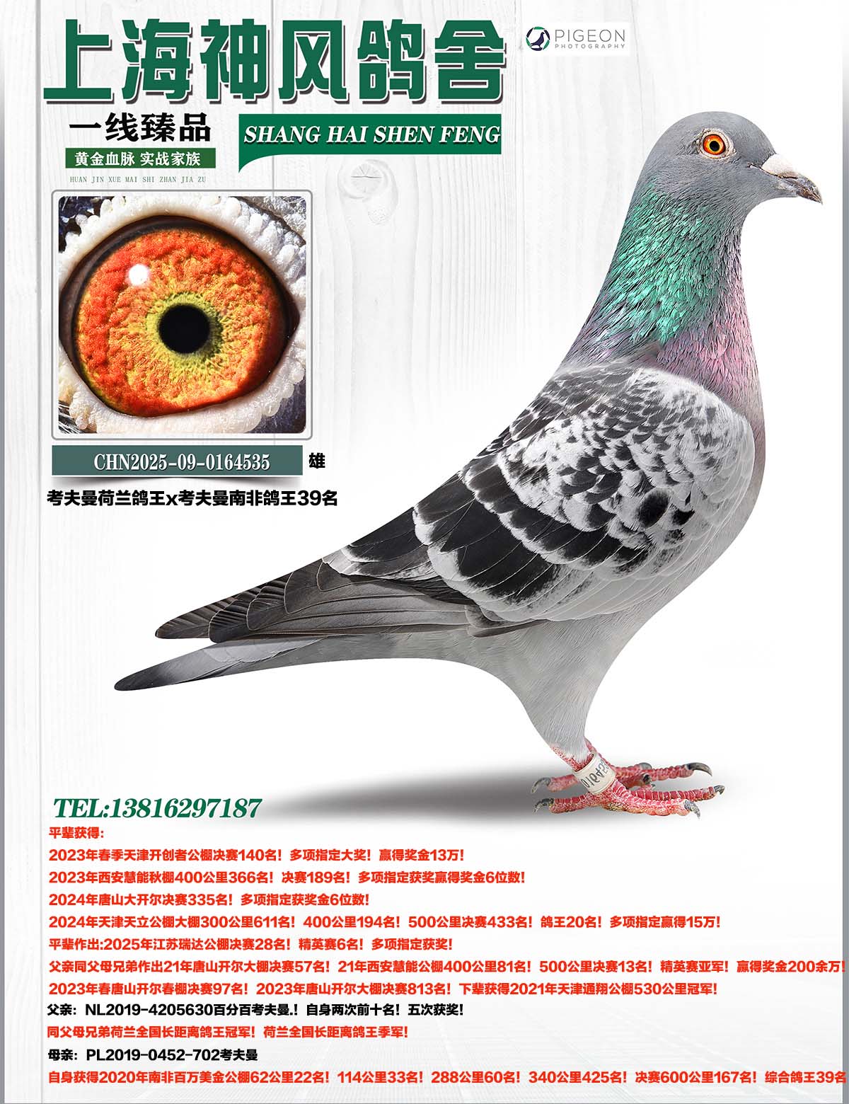 父亲同父母兄弟作出21年唐山开尔大棚决赛57名!21年西安慧能公棚400公里81名!500公里决赛13名!精英赛亚军!赢得奖金200余万!2023年春唐山开尔春棚决赛97名!2023年唐山开尔大棚决赛813名!