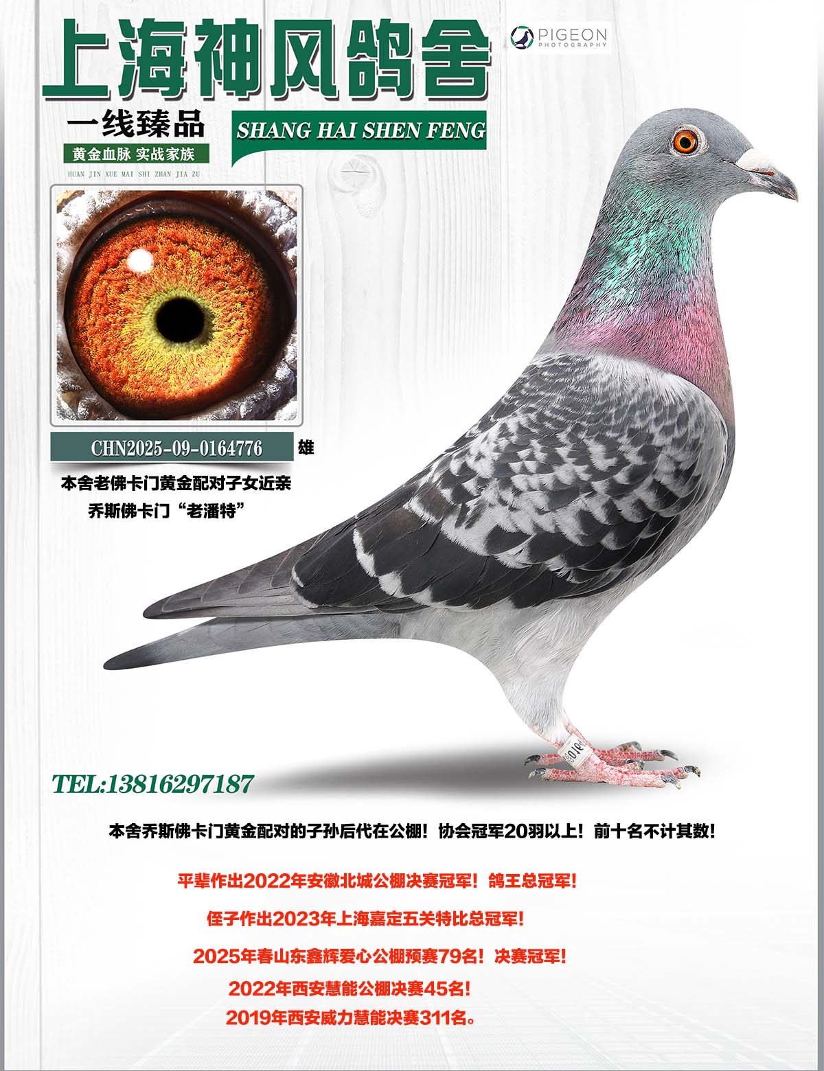外祖父:潘特先生BELG-2003-6287462,雄,乔斯佛卡门原舍作出。平辈“阿如纳”获得: 多尔丹赛357公里1198羽冠军。904羽冠军。640羽冠军。1937羽亚军。885羽8名 “黑巨人”获得: 查特鲁赛半全国4395羽5名 “洛特斯”获得: 亚精顿国家赛地区1331羽季军 “伊娃”获得: 多尔丹赛1026羽冠军