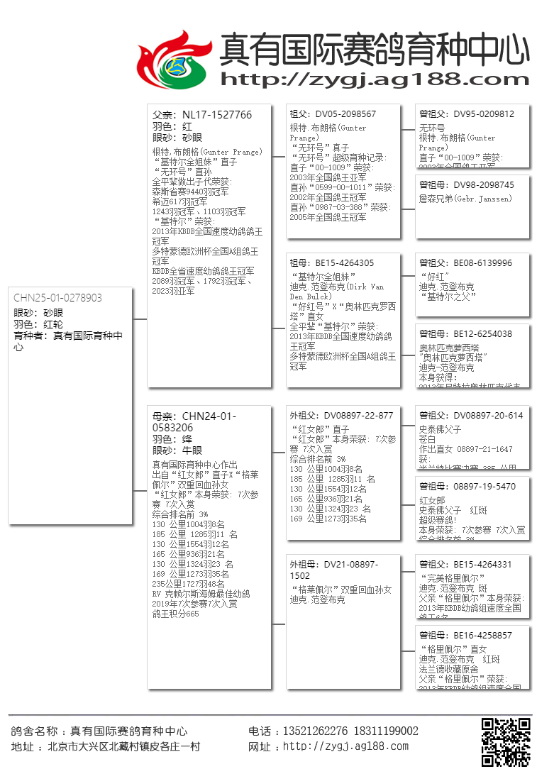 【在这三座金矿还未被世人发现之前,真有国际就第一时间把高品质的鸽子带到了国内,取得了空前的发挥。近几年大家才逐渐认识这几位大师鸽子的魅力。请记住!当任何商业鸽舍进入炒作后期的时候,他的鸽子质量与价值都会急剧下降,即便是詹森兄弟也难免于此。所以引进这家鸽舍最巅峰时期的鸽子,得以延续,才是真有国际成功的致胜法宝。】