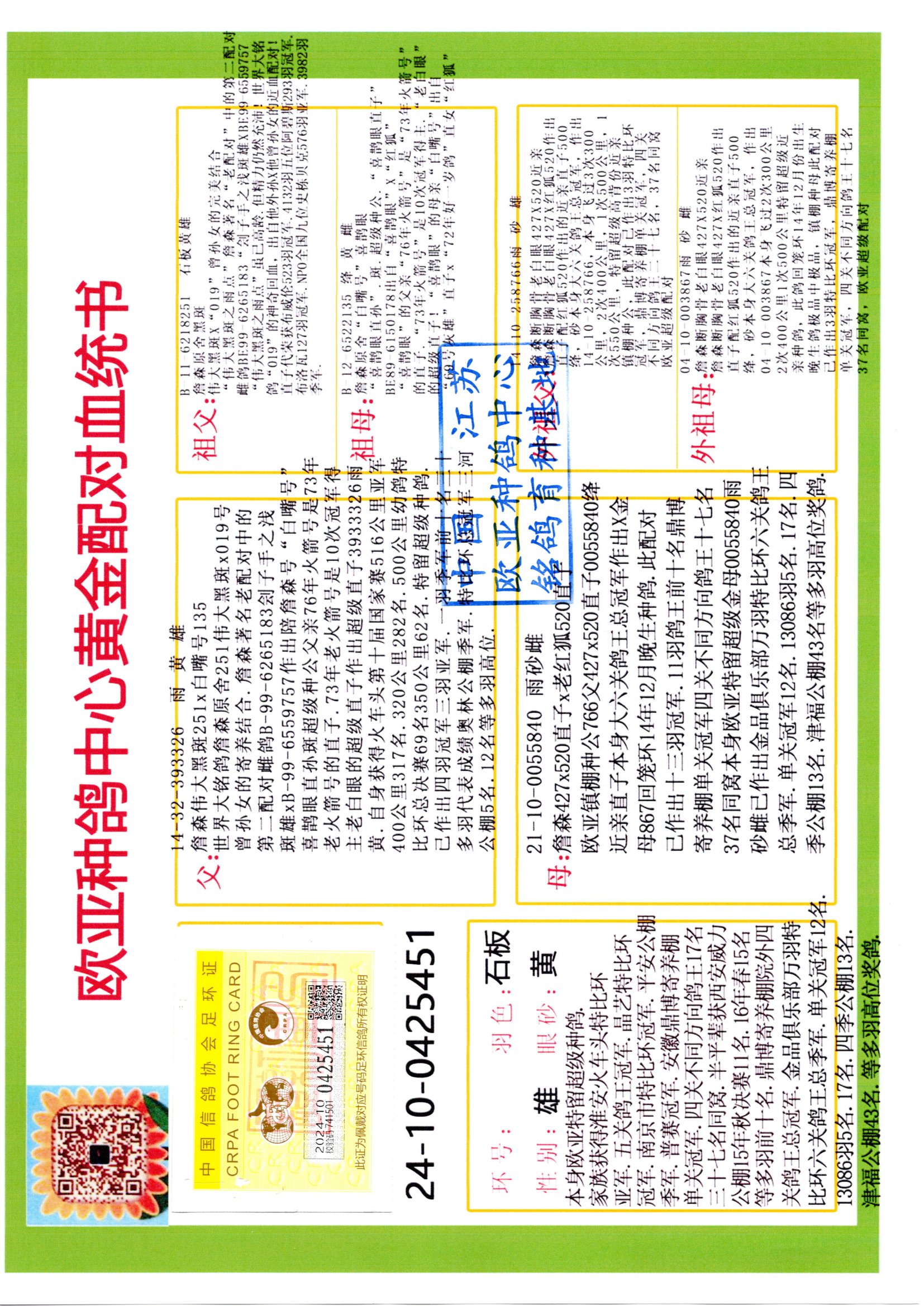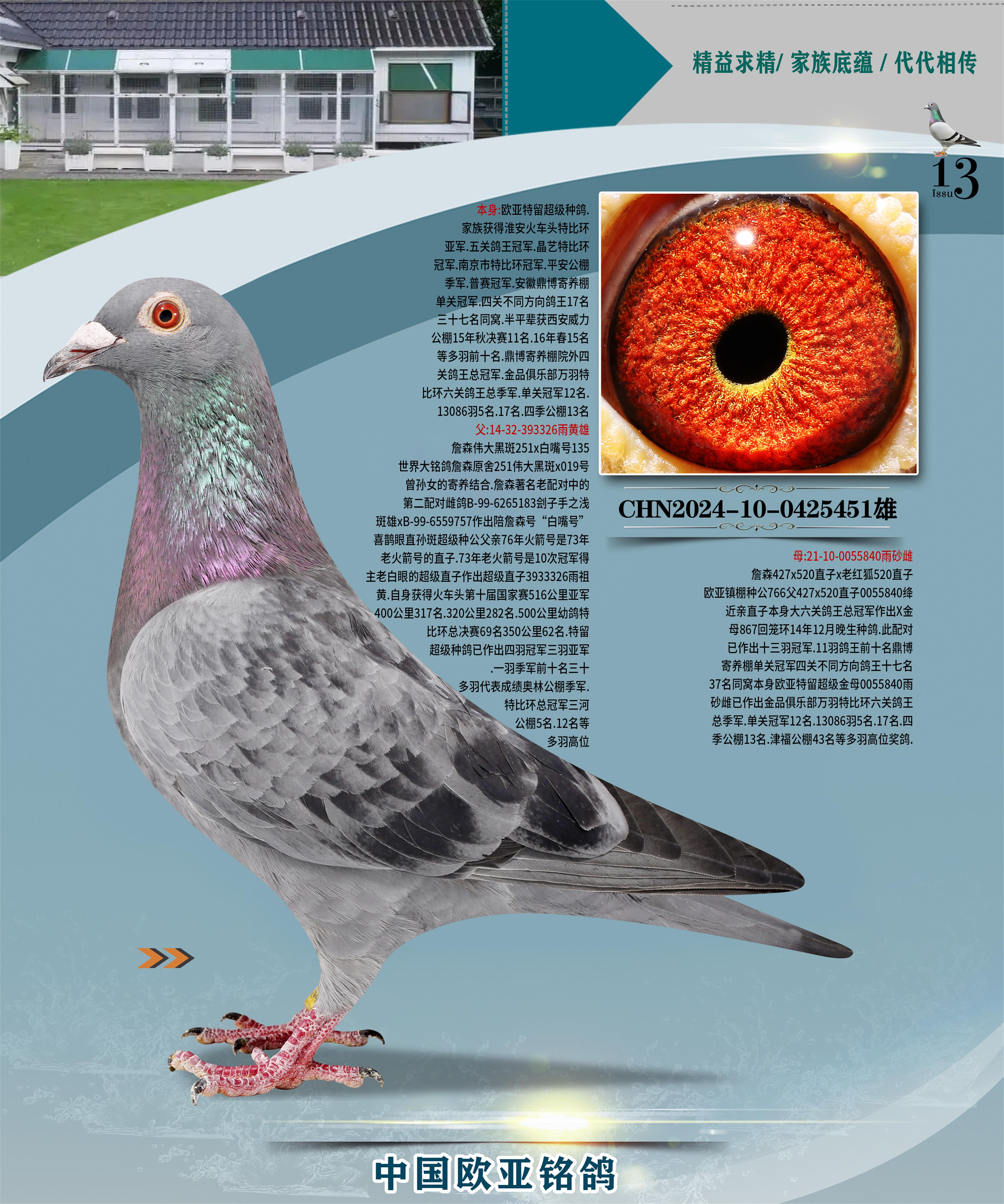 24年秋南京特比环欧亚荣获大团体冠军.小团体冠军551公里大特比13名.14名.16名.19名.20名.21名.24名.26名.27名.28名.42名.52名.54名.57名.65名.66名.68名.70名.71名.72名.74名.76名.80名.82名.83名.84名.85名.86名.90名.92名.110名.116名.121名.122名.128名.131名.158名.161名.164名.165名.166名.172名.174名.177名.182名.195名.196名.201名.205名.208名.210名.216名.253名.269名.275名.276名.294名.296名.299名,,24年秋云南天南铜都公棚决赛415名.天南铜都小棚决赛409名.云南玉活公棚决赛102名.490名.团体32名上笼二羽进二羽,天南铜都大棚506公里决赛445名。热烈祝贺河北省巨鹿县李兰生老师用欧亚泰山号血系连续十一年夺冠军,河北省国家赛冠军.全国季军等多次前十名高位,扬州王军王总用欧亚利奥24年春季获山东翔宇公棚决赛33名盖比53名。南京刘正龙刘总用欧亚盖比获得24年秋山东潍坊国际公棚决赛42名.精英赛30名.三关鸽王71名.决赛86名.加站赛16名.南京市特比环A组鸽王9名.B组鸽王5名.6名.C组鸽王5名.精英赛冠军4名.技能赛A组冠军4名.5名.秦淮区特比环荣获15名.46名.48名.87名。四川西昌徐亮徐总用欧亚利奥获得凉山州聚友决赛177名.第二关亚军双关鸽王19名.三关鸽王105名.云南豪庭公棚决赛603名。热烈祝贺24年四川重庆翔园鸽舍用欧亚泰山号荣获春季400公里冠军.秋季500公里冠军,河北王总用詹森X利奥获得千羽千翔公棚400公里冠军,广东蔡楷焕荣获24年秋爱好者 赛鸽俱乐部三关鸽王季军.一关420公里99名.二关450公里11名.三关520公里32名.单关季军.7名.12名,江西李卫兴荣获贵州红枫公棚8名.共翔俱乐部寄养棚四关综合鸽王30名.一关400公里78名.二关500公里55名.三关520公里37名.四关500公里57名.同父母获公棚18名.雷鸣获得武汉黄浦育翔中心冠军,四川陈文获得四川明鸿俱乐部300公里梦幻2名.3名.4名.9名.10名.13名.14名.15名.31名.34名.40名.41名.42名.43名.69名.71名.72名.73名.74名.94名.95名.97名.98名.99名.419公里决赛荣获总冠军7名.总共归巢9羽,四川徐亮获豪庭决赛603名,山西郑勇获得山西泰鑫公棚决赛255名詹森红狐,热烈祝贺马总获得开尔(飞跃队)决赛9名获奖金1310000万元.第一关52名,天津津福资赛180公里96名.获奖金429543万元,欧亚支持全国鸽友24年秋多人报喜 祝大家取得更好成绩,给欧亚报喜鸽友欧亚决定给每人赠送一羽超级种鸽。欧亚俱乐部特比环多关鸽王成绩:15年秋淮安特比环黑色星期一全会上笼9700多羽,当天无鸽归巢,第二天全会归巢357羽,本舍归巢158羽.前十名八羽.前一百名归巢57羽,16年春季获五关鸽王总冠军,总亚军四名.六名.七名.九名.十名.晶艺俱乐部520公里冠亚季军5名.6名.7名.9名.11名等,火车头冠军.季军6名.8名.9名.10名,16年秋晶艺俱乐部特比环520公里亚军.季军4名.6名.7名.9名,15年春南京白下特比环冠军.亚军.季军6名.7名.8名.9名.10名.指定鸽A B组获得冠军.亚军.季军4名.5名.,17年淮安特比环亚军.4名.5名.7名.8名.10名.六关鸽王总冠军.4名.6名.9名.10名,寄养棚宿迁刘总20羽特比环获冠军.季军.4名.7名.8名.9名等。18年荣获万羽特比环六关鸽王总冠军.总亚军.总季军.6名.8名.十名.单关四羽冠军.二羽亚军.四羽季军.前十名27羽。19年秋万羽特比环六关鸽王总亚军.总季军.5名.8名等,单关二羽冠军.三羽亚军.一羽季军前十名31羽。20年秋淮安市鸽会四关特比环大赛风雨无阻鸽王亚军.鸽王六名,金品俱乐部万羽特比环六关鸽王总冠军,总亚军.四名.五名.六名.七名.八名.十名.前二百名鸽王35羽,单关冠亚季军前十名四十多羽,火车头五关鸽王季军.六名.八名.前二百名鸽王十七羽。20年春荣获淮安五区一市四关鸽王总冠军.亚军.四名.八名.九名。21年秋荣获金品万羽特比环大赛六关鸽王总亚军.总季军.四名.七名.九名.十名.单关冠亚军季军前十名三十多羽。火车头协会鸽王六名.七名.十名.单关前十名十七羽。22年秋荣获鸽王总冠军.总亚军.5名.7名.8名.9名.11名.单关冠亚季军前十名三十多羽,第一关单关前二百名四十多羽,第二关前二百名三十多羽,第三关前二百名四十多羽,第四关前二百名四十多羽,第五关前一百名53羽。23年秋荣获鸽王季军.五名.八名.十名.13名.17名.20名.27名等多羽鸽王.单关前十名二十多羽。公棚.寄养棚部分成绩:16年秋宁夏黄河公棚总冠军电脑戈马力指定通炮冠军,17年送八羽参赛获得鸽王八名进奖四名,支持韩总荣获八名。支持鸽友荣获宁夏中卫公棚决赛总冠军.精英赛冠军,支持18年宁夏黄河公棚决赛冠军詹森X泰山。安徽鼎博寄养棚院内外四关鸽王总冠军.鸽王十七名.三十七名同窝,鸽王39名.42名.58名.67名。18年山东公棚预赛冠军.决赛65名.送八羽进奖五羽.指定获奔驰汽车一辆。支持鸽友获得云南蓝云公棚冠军.盖比X佛卡门。支持鸽友荣获云南银集公棚决赛冠军 詹森427X520血系 速度赛6700羽冠军。17年荣获金马俱乐部寄养棚四关鸽王总冠军.季军.六名.八名.第一关冠军.亚军.季军四名.七名.十一名.金牌教练奖。支持鸽友18年北京费翔公棚预赛九名电脑X桑杰士,支持鸽友荣获陕西威力公棚决赛11名.内蒙古临河寄养棚四关鸽王六名.詹森配泰山,支持河北王总用欧亚詹森427配胡本喜获20年秋开尔青年棚季军。云南东荣公棚16年预赛冠军.决赛77名.17年决赛12名.詹森红狐X泰山,17年平安公棚决赛4名 詹森427。欧亚获得21年金母寄养棚第一关四名.第二关5名.第三关5名.6名.7名.10名.三关鸽王总冠军,四关鸽王14名.十羽鸽王。支持河
