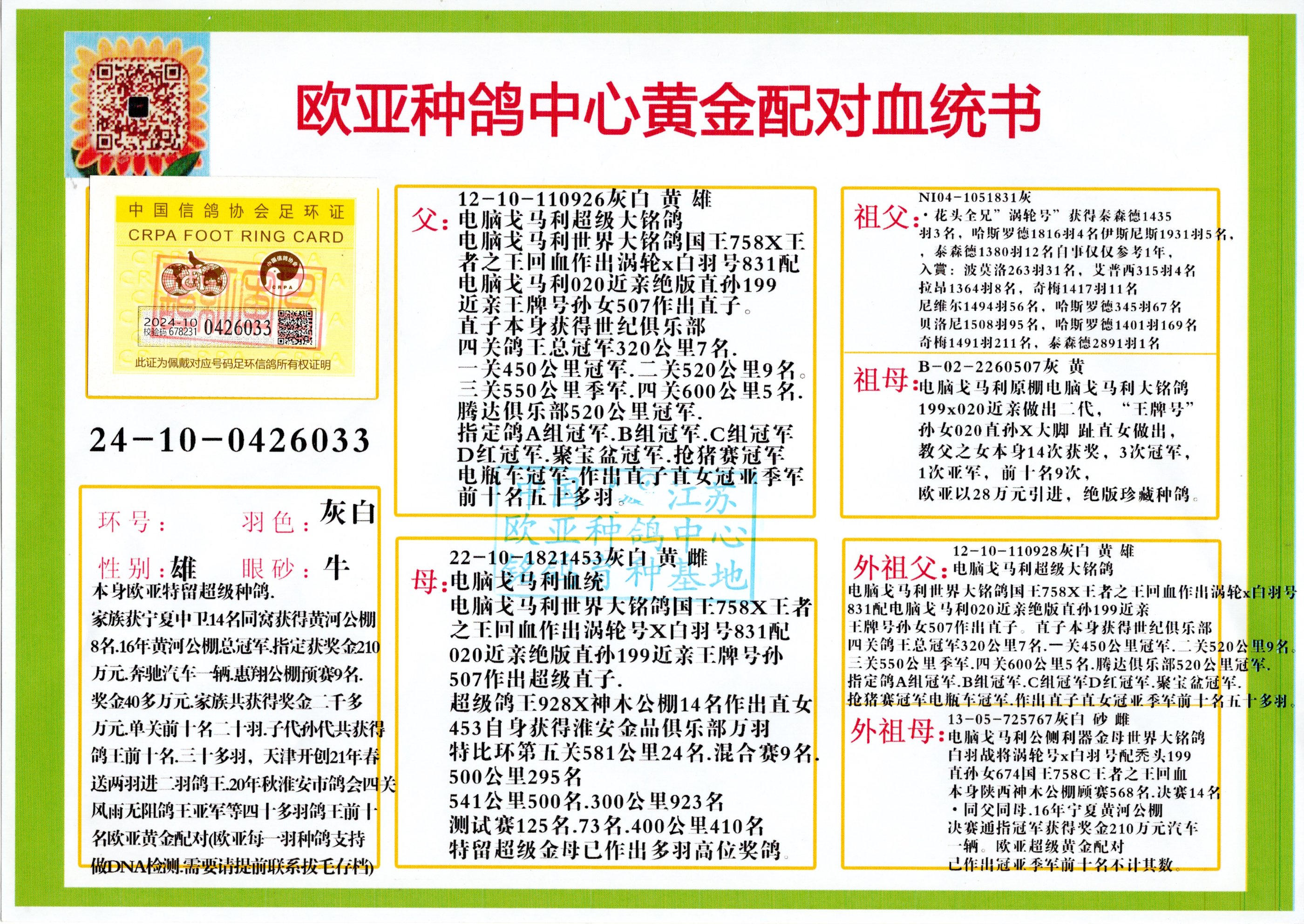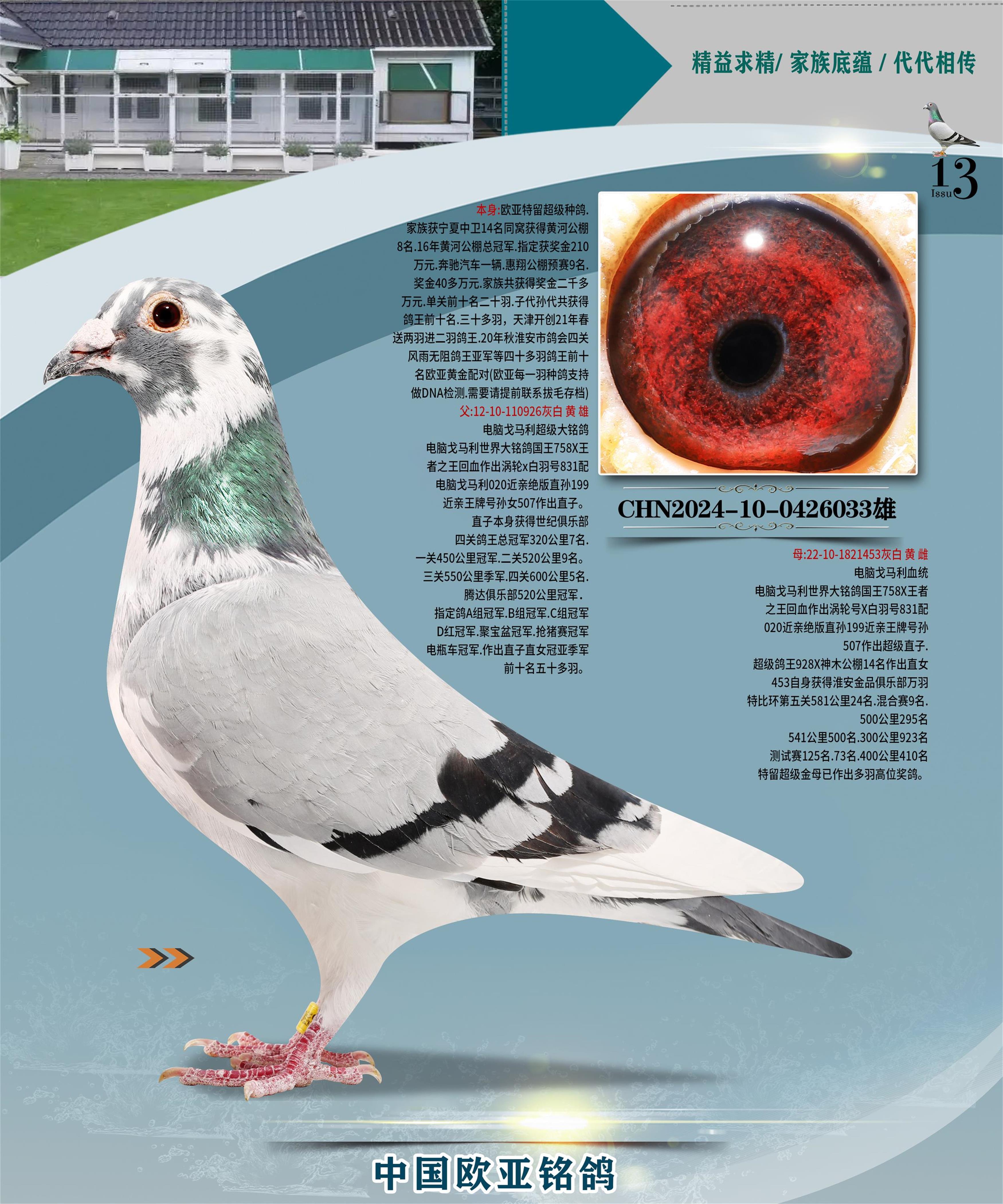 24年秋南京特比环欧亚荣获大团体冠军.小团体冠军551公里大特比13名.14名.16名.19名.20名.21名.24名.26名.27名.28名.42名.52名.54名.57名.65名.66名.68名.70名.71名.72名.74名.76名.80名.82名.83名.84名.85名.86名.90名.92名.110名.116名.121名.122名.128名.131名.158名.161名.164名.165名.166名.172名.174名.177名.182名.195名.196名.201名.205名.208名.210名.216名.253名.269名.275名.276名.294名.296名.299名,,24年秋云南天南铜都公棚决赛415名.天南铜都小棚决赛409名.云南玉活公棚决赛102名.490名.团体32名上笼二羽进二羽,天南铜都大棚506公里决赛445名。热烈祝贺河北省巨鹿县李兰生老师用欧亚泰山号血系连续十一年夺冠军,河北省国家赛冠军.全国季军等多次前十名高位,扬州王军王总用欧亚利奥24年春季获山东翔宇公棚决赛33名盖比53名。南京刘正龙刘总用欧亚盖比获得24年秋山东潍坊国际公棚决赛42名.精英赛30名.三关鸽王71名.决赛86名.加站赛16名.南京市特比环A组鸽王9名.B组鸽王5名.6名.C组鸽王5名.精英赛冠军4名.技能赛A组冠军4名.5名.秦淮区特比环荣获15名.46名.48名.87名。四川西昌徐亮徐总用欧亚利奥获得凉山州聚友决赛177名.第二关亚军双关鸽王19名.三关鸽王105名.云南豪庭公棚决赛603名。热烈祝贺24年四川重庆翔园鸽舍用欧亚泰山号荣获春季400公里冠军.秋季500公里冠军,河北王总用詹森X利奥获得千羽千翔公棚400公里冠军,广东蔡楷焕荣获24年秋爱好者 赛鸽俱乐部三关鸽王季军.一关420公里99名.二关450公里11名.三关520公里32名.单关季军.7名.12名,江西李卫兴荣获贵州红枫公棚8名.共翔俱乐部寄养棚四关综合鸽王30名.一关400公里78名.二关500公里55名.三关520公里37名.四关500公里57名.同父母获公棚18名.雷鸣获得武汉黄浦育翔中心冠军,四川陈文获得四川明鸿俱乐部300公里梦幻2名.3名.4名.9名.10名.13名.14名.15名.31名.34名.40名.41名.42名.43名.69名.71名.72名.73名.74名.94名.95名.97名.98名.99名.419公里决赛荣获总冠军7名.总共归巢9羽,四川徐亮获豪庭决赛603名,山西郑勇获得山西泰鑫公棚决赛255名詹森红狐,热烈祝贺马总获得开尔(飞跃队)决赛9名获奖金1310000万元.第一关52名,天津津福资赛180公里96名.获奖金429543万元,欧亚支持全国鸽友24年秋多人报喜 祝大家取得更好成绩,给欧亚报喜鸽友欧亚决定给每人赠送一羽超级种鸽。欧亚俱乐部特比环多关鸽王成绩:15年秋淮安特比环黑色星期一全会上笼9700多羽,当天无鸽归巢,第二天全会归巢357羽,本舍归巢158羽.前十名八羽.前一百名归巢57羽,16年春季获五关鸽王总冠军,总亚军四名.六名.七名.九名.十名.晶艺俱乐部520公里冠亚季军5名.6名.7名.9名.11名等,火车头冠军.季军6名.8名.9名.10名,16年秋晶艺俱乐部特比环520公里亚军.季军4名.6名.7名.9名,15年春南京白下特比环冠军.亚军.季军6名.7名.8名.9名.10名.指定鸽A B组获得冠军.亚军.季军4名.5名.,17年淮安特比环亚军.4名.5名.7名.8名.10名.六关鸽王总冠军.4名.6名.9名.10名,寄养棚宿迁刘总20羽特比环获冠军.季军.4名.7名.8名.9名等。18年荣获万羽特比环六关鸽王总冠军.总亚军.总季军.6名.8名.十名.单关四羽冠军.二羽亚军.四羽季军.前十名27羽。19年秋万羽特比环六关鸽王总亚军.总季军.5名.8名等,单关二羽冠军.三羽亚军.一羽季军前十名31羽。20年秋淮安市鸽会四关特比环大赛风雨无阻鸽王亚军.鸽王六名,金品俱乐部万羽特比环六关鸽王总冠军,总亚军.四名.五名.六名.七名.八名.十名.前二百名鸽王35羽,单关冠亚季军前十名四十多羽,火车头五关鸽王季军.六名.八名.前二百名鸽王十七羽。20年春荣获淮安五区一市四关鸽王总冠军.亚军.四名.八名.九名。21年秋荣获金品万羽特比环大赛六关鸽王总亚军.总季军.四名.七名.九名.十名.单关冠亚军季军前十名三十多羽。火车头协会鸽王六名.七名.十名.单关前十名十七羽。22年秋荣获鸽王总冠军.总亚军.5名.7名.8名.9名.11名.单关冠亚季军前十名三十多羽,第一关单关前二百名四十多羽,第二关前二百名三十多羽,第三关前二百名四十多羽,第四关前二百名四十多羽,第五关前一百名53羽。23年秋荣获鸽王季军.五名.八名.十名.13名.17名.20名.27名等多羽鸽王.单关前十名二十多羽。公棚.寄养棚部分成绩:16年秋宁夏黄河公棚总冠军电脑戈马力指定通炮冠军,17年送八羽参赛获得鸽王八名进奖四名,支持韩总荣获八名。支持鸽友荣获宁夏中卫公棚决赛总冠军.精英赛冠军,支持18年宁夏黄河公棚决赛冠军詹森X泰山。安徽鼎博寄养棚院内外四关鸽王总冠军.鸽王十七名.三十七名同窝,鸽王39名.42名.58名.67名。18年山东公棚预赛冠军.决赛65名.送八羽进奖五羽.指定获奔驰汽车一辆。支持鸽友获得云南蓝云公棚冠军.盖比X佛卡门。支持鸽友荣获云南银集公棚决赛冠军 詹森427X520血系 速度赛6700羽冠军。17年荣获金马俱乐部寄养棚四关鸽王总冠军.季军.六名.八名.第一关冠军.亚军.季军四名.七名.十一名.金牌教练奖。支持鸽友18年北京费翔公棚预赛九名电脑X桑杰士,支持鸽友荣获陕西威力公棚决赛11名.内蒙古临河寄养棚四关鸽王六名.詹森配泰山,支持河北王总用欧亚詹森427配胡本喜获20年秋开尔青年棚季军。云南东荣公棚16年预赛冠军.决赛77名.17年决赛12名.詹森红狐X泰山,17年平安公棚决赛4名 詹森427。欧亚获得21年金母寄养棚第一关四名.第二关5名.第三关5名.6名.7名.10名.三关鸽王总冠军,四关鸽王14名.十羽鸽王。支持河