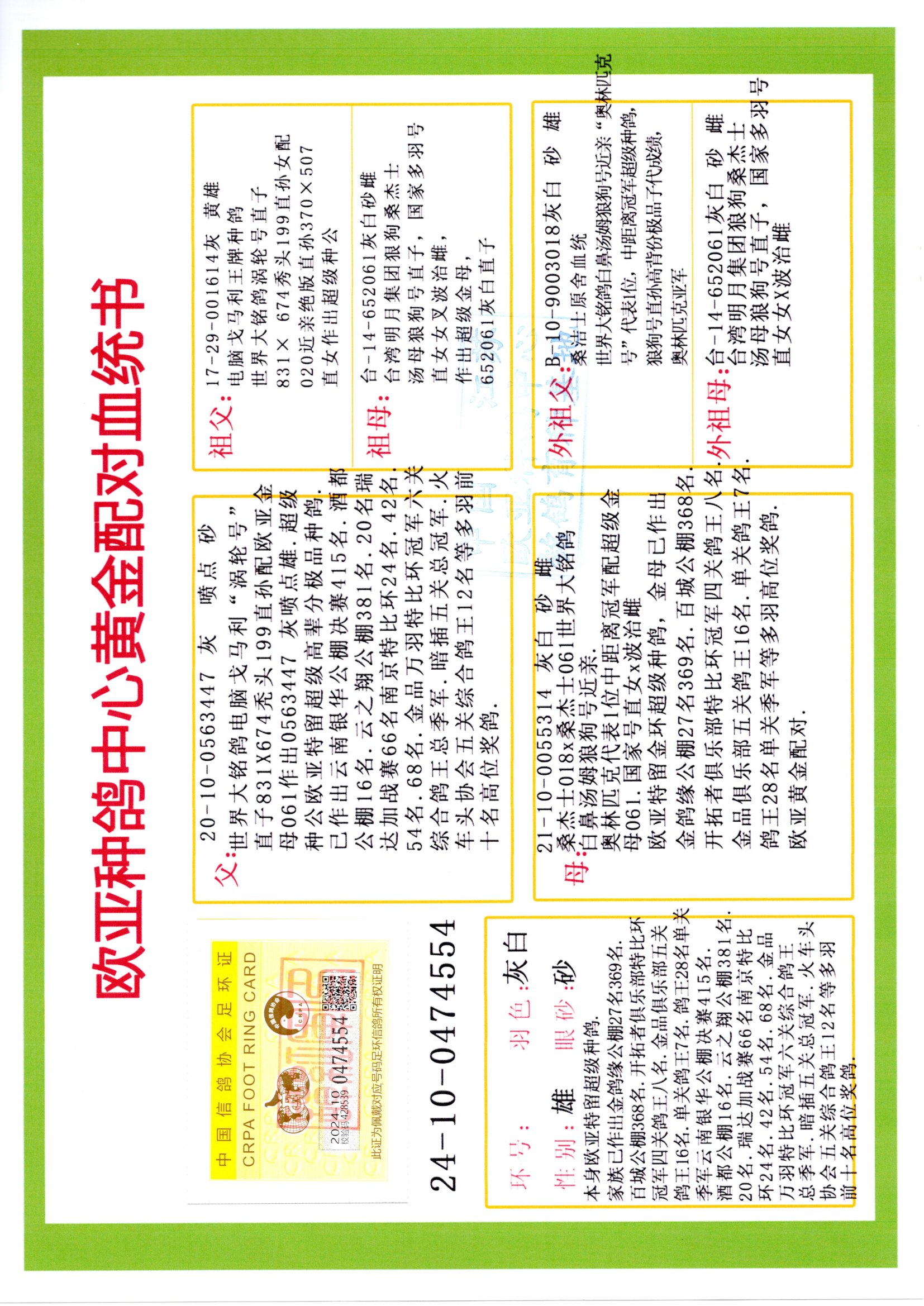 24年秋南京特比环欧亚荣获大团体冠军.小团体冠军551公里大特比13名.14名.16名.19名.20名.21名.24名.26名.27名.28名.42名.52名.54名.57名.65名.66名.68名.70名.71名.72名.74名.76名.80名.82名.83名.84名.85名.86名.90名.92名.110名.116名.121名.122名.128名.131名.158名.161名.164名.165名.166名.172名.174名.177名.182名.195名.196名.201名.205名.208名.210名.216名.253名.269名.275名.276名.294名.296名.299名,,24年秋云南天南铜都公棚决赛415名.天南铜都小棚决赛409名.云南玉活公棚决赛102名.490名.团体32名上笼二羽进二羽,天南铜都大棚506公里决赛445名。热烈祝贺河北省巨鹿县李兰生老师用欧亚泰山号血系连续十一年夺冠军,河北省国家赛冠军.全国季军等多次前十名高位,扬州王军王总用欧亚利奥24年春季获山东翔宇公棚决赛33名盖比53名。南京刘正龙刘总用欧亚盖比获得24年秋山东潍坊国际公棚决赛42名.精英赛30名.三关鸽王71名.决赛86名.加站赛16名.南京市特比环A组鸽王9名.B组鸽王5名.6名.C组鸽王5名.精英赛冠军4名.技能赛A组冠军4名.5名.秦淮区特比环荣获15名.46名.48名.87名。四川西昌徐亮徐总用欧亚利奥获得凉山州聚友决赛177名.第二关亚军双关鸽王19名.三关鸽王105名.云南豪庭公棚决赛603名。热烈祝贺24年四川重庆翔园鸽舍用欧亚泰山号荣获春季400公里冠军.秋季500公里冠军,河北王总用詹森X利奥获得千羽千翔公棚400公里冠军,广东蔡楷焕荣获24年秋爱好者 赛鸽俱乐部三关鸽王季军.一关420公里99名.二关450公里11名.三关520公里32名.单关季军.7名.12名,江西李卫兴荣获贵州红枫公棚8名.共翔俱乐部寄养棚四关综合鸽王30名.一关400公里78名.二关500公里55名.三关520公里37名.四关500公里57名.同父母获公棚18名.雷鸣获得武汉黄浦育翔中心冠军,四川陈文获得四川明鸿俱乐部300公里梦幻2名.3名.4名.9名.10名.13名.14名.15名.31名.34名.40名.41名.42名.43名.69名.71名.72名.73名.74名.94名.95名.97名.98名.99名.419公里决赛荣获总冠军7名.总共归巢9羽,四川徐亮获豪庭决赛603名,山西郑勇获得山西泰鑫公棚决赛255名詹森红狐,热烈祝贺马总获得开尔(飞跃队)决赛9名获奖金1310000万元.第一关52名,天津津福资赛180公里96名.获奖金429543万元,欧亚支持全国鸽友24年秋多人报喜 祝大家取得更好成绩,给欧亚报喜鸽友欧亚决定给每人赠送一羽超级种鸽。欧亚俱乐部特比环多关鸽王成绩:15年秋淮安特比环黑色星期一全会上笼9700多羽,当天无鸽归巢,第二天全会归巢357羽,本舍归巢158羽.前十名八羽.前一百名归巢57羽,16年春季获五关鸽王总冠军,总亚军四名.六名.七名.九名.十名.晶艺俱乐部520公里冠亚季军5名.6名.7名.9名.11名等,火车头冠军.季军6名.8名.9名.10名,16年秋晶艺俱乐部特比环520公里亚军.季军4名.6名.7名.9名,15年春南京白下特比环冠军.亚军.季军6名.7名.8名.9名.10名.指定鸽A B组获得冠军.亚军.季军4名.5名.,17年淮安特比环亚军.4名.5名.7名.8名.10名.六关鸽王总冠军.4名.6名.9名.10名,寄养棚宿迁刘总20羽特比环获冠军.季军.4名.7名.8名.9名等。18年荣获万羽特比环六关鸽王总冠军.总亚军.总季军.6名.8名.十名.单关四羽冠军.二羽亚军.四羽季军.前十名27羽。19年秋万羽特比环六关鸽王总亚军.总季军.5名.8名等,单关二羽冠军.三羽亚军.一羽季军前十名31羽。20年秋淮安市鸽会四关特比环大赛风雨无阻鸽王亚军.鸽王六名,金品俱乐部万羽特比环六关鸽王总冠军,总亚军.四名.五名.六名.七名.八名.十名.前二百名鸽王35羽,单关冠亚季军前十名四十多羽,火车头五关鸽王季军.六名.八名.前二百名鸽王十七羽。20年春荣获淮安五区一市四关鸽王总冠军.亚军.四名.八名.九名。21年秋荣获金品万羽特比环大赛六关鸽王总亚军.总季军.四名.七名.九名.十名.单关冠亚军季军前十名三十多羽。火车头协会鸽王六名.七名.十名.单关前十名十七羽。22年秋荣获鸽王总冠军.总亚军.5名.7名.8名.9名.11名.单关冠亚季军前十名三十多羽,第一关单关前二百名四十多羽,第二关前二百名三十多羽,第三关前二百名四十多羽,第四关前二百名四十多羽,第五关前一百名53羽。23年秋荣获鸽王季军.五名.八名.十名.13名.17名.20名.27名等多羽鸽王.单关前十名二十多羽。公棚.寄养棚部分成绩:16年秋宁夏黄河公棚总冠军电脑戈马力指定通炮冠军,17年送八羽参赛获得鸽王八名进奖四名,支持韩总荣获八名。支持鸽友荣获宁夏中卫公棚决赛总冠军.精英赛冠军,支持18年宁夏黄河公棚决赛冠军詹森X泰山。安徽鼎博寄养棚院内外四关鸽王总冠军.鸽王十七名.三十七名同窝,鸽王39名.42名.58名.67名。18年山东公棚预赛冠军.决赛65名.送八羽进奖五羽.指定获奔驰汽车一辆。支持鸽友获得云南蓝云公棚冠军.盖比X佛卡门。支持鸽友荣获云南银集公棚决赛冠军 詹森427X520血系 速度赛6700羽冠军。17年荣获金马俱乐部寄养棚四关鸽王总冠军.季军.六名.八名.第一关冠军.亚军.季军四名.七名.十一名.金牌教练奖。支持鸽友18年北京费翔公棚预赛九名电脑X桑杰士,支持鸽友荣获陕西威力公棚决赛11名.内蒙古临河寄养棚四关鸽王六名.詹森配泰山,支持河北王总用欧亚詹森427配胡本喜获20年秋开尔青年棚季军。云南东荣公棚16年预赛冠军.决赛77名.17年决赛12名.詹森红狐X泰山,17年平安公棚决赛4名 詹森427。欧亚获得21年金母寄养棚第一关四名.第二关5名.第三关5名.6名.7名.10名.三关鸽王总冠军,四关鸽王14名.十羽鸽王。支持河