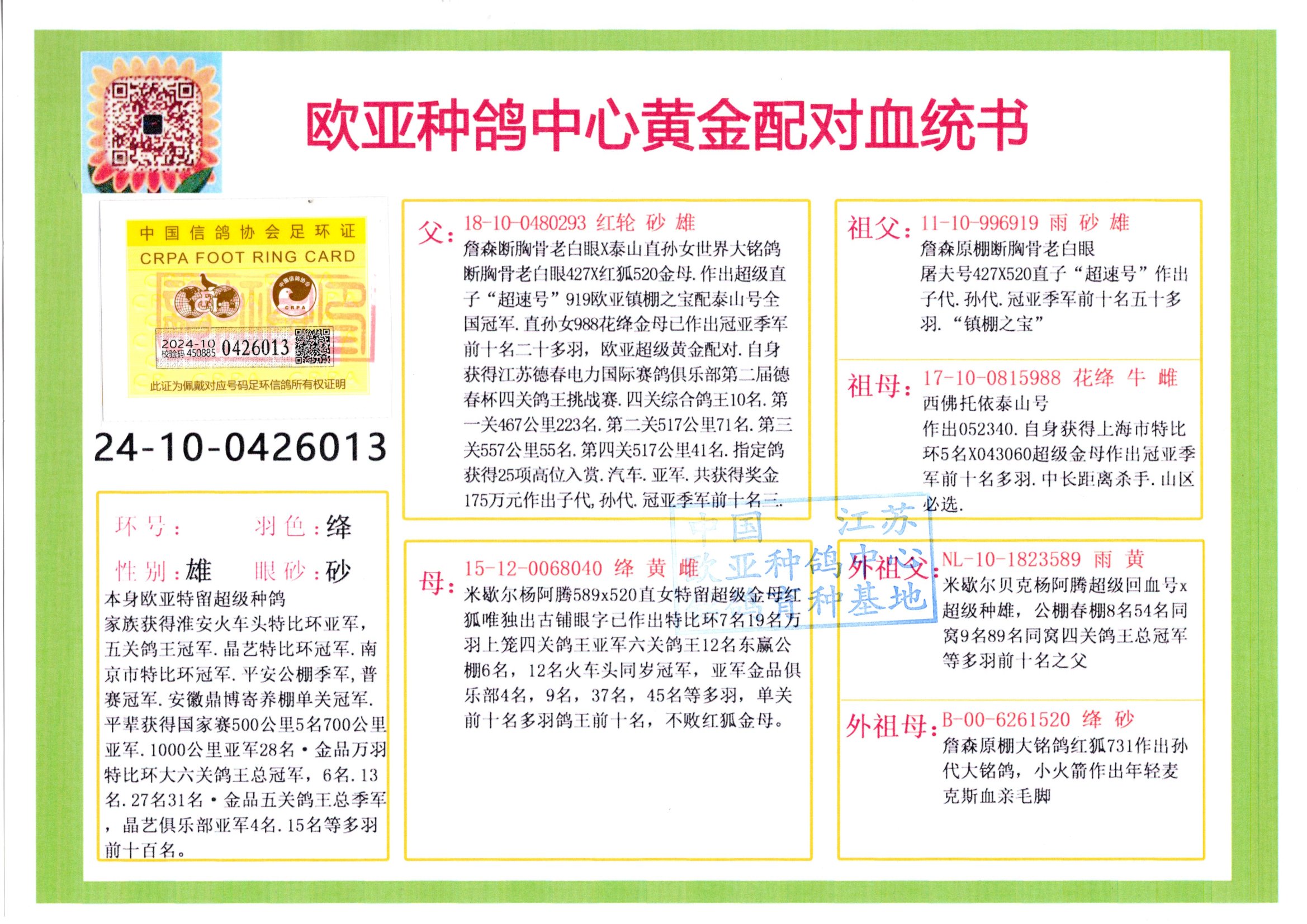 24年秋南京特比环欧亚荣获大团体冠军.小团体冠军551公里大特比13名.14名.16名.19名.20名.21名.24名.26名.27名.28名.42名.52名.54名.57名.65名.66名.68名.70名.71名.72名.74名.76名.80名.82名.83名.84名.85名.86名.90名.92名.110名.116名.121名.122名.128名.131名.158名.161名.164名.165名.166名.172名.174名.177名.182名.195名.196名.201名.205名.208名.210名.216名.253名.269名.275名.276名.294名.296名.299名,,24年秋云南天南铜都公棚决赛415名.天南铜都小棚决赛409名.云南玉活公棚决赛102名.490名.团体32名上笼二羽进二羽,天南铜都大棚506公里决赛445名。热烈祝贺河北省巨鹿县李兰生老师用欧亚泰山号血系连续十一年夺冠军,河北省国家赛冠军.全国季军等多次前十名高位,扬州王军王总用欧亚利奥24年春季获山东翔宇公棚决赛33名盖比53名。南京刘正龙刘总用欧亚盖比获得24年秋山东潍坊国际公棚决赛42名.精英赛30名.三关鸽王71名.决赛86名.加站赛16名.南京市特比环A组鸽王9名.B组鸽王5名.6名.C组鸽王5名.精英赛冠军4名.技能赛A组冠军4名.5名.秦淮区特比环荣获15名.46名.48名.87名。四川西昌徐亮徐总用欧亚利奥获得凉山州聚友决赛177名.第二关亚军双关鸽王19名.三关鸽王105名.云南豪庭公棚决赛603名。热烈祝贺24年四川重庆翔园鸽舍用欧亚泰山号荣获春季400公里冠军.秋季500公里冠军,河北王总用詹森X利奥获得千羽千翔公棚400公里冠军,广东蔡楷焕荣获24年秋爱好者 赛鸽俱乐部三关鸽王季军.一关420公里99名.二关450公里11名.三关520公里32名.单关季军.7名.12名,江西李卫兴荣获贵州红枫公棚8名.共翔俱乐部寄养棚四关综合鸽王30名.一关400公里78名.二关500公里55名.三关520公里37名.四关500公里57名.同父母获公棚18名.雷鸣获得武汉黄浦育翔中心冠军,四川陈文获得四川明鸿俱乐部300公里梦幻2名.3名.4名.9名.10名.13名.14名.15名.31名.34名.40名.41名.42名.43名.69名.71名.72名.73名.74名.94名.95名.97名.98名.99名.419公里决赛荣获总冠军7名.总共归巢9羽,四川徐亮获豪庭决赛603名,山西郑勇获得山西泰鑫公棚决赛255名詹森红狐,热烈祝贺马总获得开尔(飞跃队)决赛9名获奖金1310000万元.第一关52名,天津津福资赛180公里96名.获奖金429543万元,欧亚支持全国鸽友24年秋多人报喜 祝大家取得更好成绩,给欧亚报喜鸽友欧亚决定给每人赠送一羽超级种鸽。欧亚俱乐部特比环多关鸽王成绩:15年秋淮安特比环黑色星期一全会上笼9700多羽,当天无鸽归巢,第二天全会归巢357羽,本舍归巢158羽.前十名八羽.前一百名归巢57羽,16年春季获五关鸽王总冠军,总亚军四名.六名.七名.九名.十名.晶艺俱乐部520公里冠亚季军5名.6名.7名.9名.11名等,火车头冠军.季军6名.8名.9名.10名,16年秋晶艺俱乐部特比环520公里亚军.季军4名.6名.7名.9名,15年春南京白下特比环冠军.亚军.季军6名.7名.8名.9名.10名.指定鸽A B组获得冠军.亚军.季军4名.5名.,17年淮安特比环亚军.4名.5名.7名.8名.10名.六关鸽王总冠军.4名.6名.9名.10名,寄养棚宿迁刘总20羽特比环获冠军.季军.4名.7名.8名.9名等。18年荣获万羽特比环六关鸽王总冠军.总亚军.总季军.6名.8名.十名.单关四羽冠军.二羽亚军.四羽季军.前十名27羽。19年秋万羽特比环六关鸽王总亚军.总季军.5名.8名等,单关二羽冠军.三羽亚军.一羽季军前十名31羽。20年秋淮安市鸽会四关特比环大赛风雨无阻鸽王亚军.鸽王六名,金品俱乐部万羽特比环六关鸽王总冠军,总亚军.四名.五名.六名.七名.八名.十名.前二百名鸽王35羽,单关冠亚季军前十名四十多羽,火车头五关鸽王季军.六名.八名.前二百名鸽王十七羽。20年春荣获淮安五区一市四关鸽王总冠军.亚军.四名.八名.九名。21年秋荣获金品万羽特比环大赛六关鸽王总亚军.总季军.四名.七名.九名.十名.单关冠亚军季军前十名三十多羽。火车头协会鸽王六名.七名.十名.单关前十名十七羽。22年秋荣获鸽王总冠军.总亚军.5名.7名.8名.9名.11名.单关冠亚季军前十名三十多羽,第一关单关前二百名四十多羽,第二关前二百名三十多羽,第三关前二百名四十多羽,第四关前二百名四十多羽,第五关前一百名53羽。23年秋荣获鸽王季军.五名.八名.十名.13名.17名.20名.27名等多羽鸽王.单关前十名二十多羽。公棚.寄养棚部分成绩:16年秋宁夏黄河公棚总冠军电脑戈马力指定通炮冠军,17年送八羽参赛获得鸽王八名进奖四名,支持韩总荣获八名。支持鸽友荣获宁夏中卫公棚决赛总冠军.精英赛冠军,支持18年宁夏黄河公棚决赛冠军詹森X泰山。安徽鼎博寄养棚院内外四关鸽王总冠军.鸽王十七名.三十七名同窝,鸽王39名.42名.58名.67名。18年山东公棚预赛冠军.决赛65名.送八羽进奖五羽.指定获奔驰汽车一辆。支持鸽友获得云南蓝云公棚冠军.盖比X佛卡门。支持鸽友荣获云南银集公棚决赛冠军 詹森427X520血系 速度赛6700羽冠军。17年荣获金马俱乐部寄养棚四关鸽王总冠军.季军.六名.八名.第一关冠军.亚军.季军四名.七名.十一名.金牌教练奖。支持鸽友18年北京费翔公棚预赛九名电脑X桑杰士,支持鸽友荣获陕西威力公棚决赛11名.内蒙古临河寄养棚四关鸽王六名.詹森配泰山,支持河北王总用欧亚詹森427配胡本喜获20年秋开尔青年棚季军。云南东荣公棚16年预赛冠军.决赛77名.17年决赛12名.詹森红狐X泰山,17年平安公棚决赛4名 詹森427。欧亚获得21年金母寄养棚第一关四名.第二关5名.第三关5名.6名.7名.10名.三关鸽王总冠军,四关鸽王14名.十羽鸽王。支持河